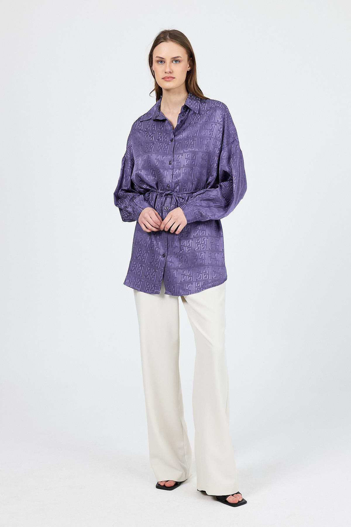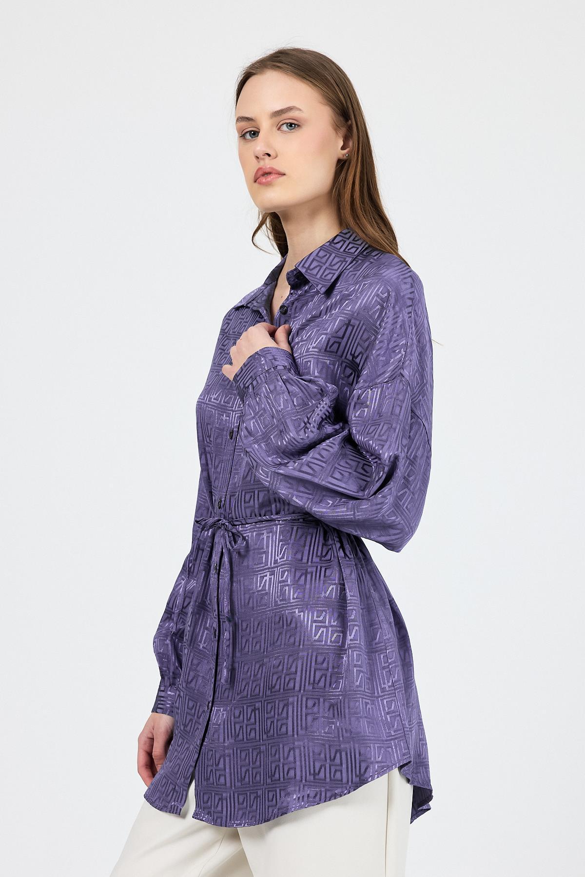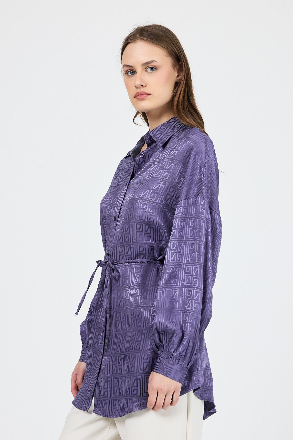 Leylak Desenli Saten Görünümlü İp Bağlama Detaylı Gömlek 4293A