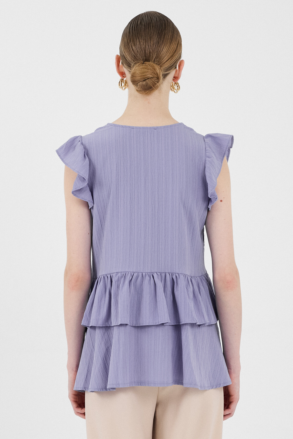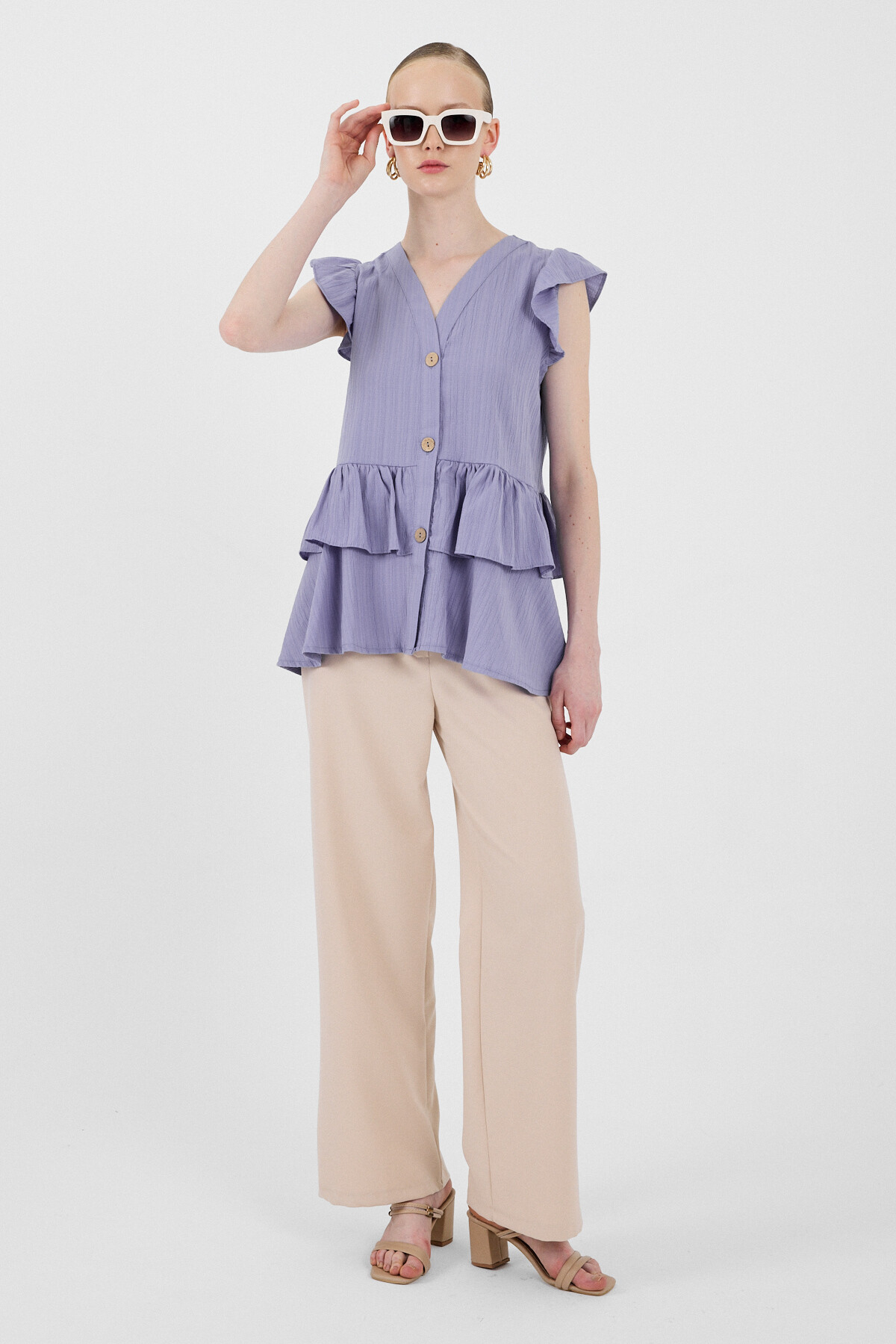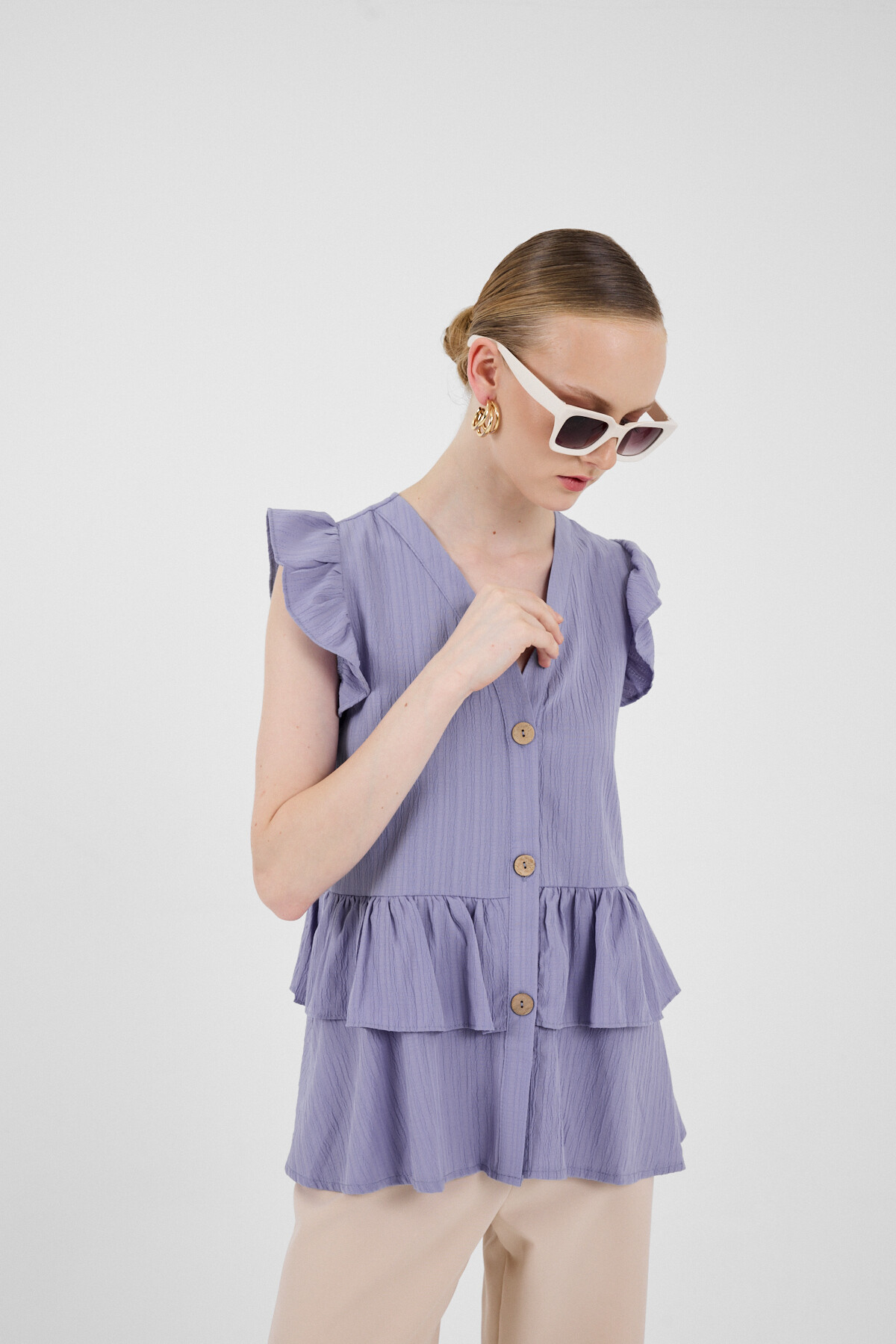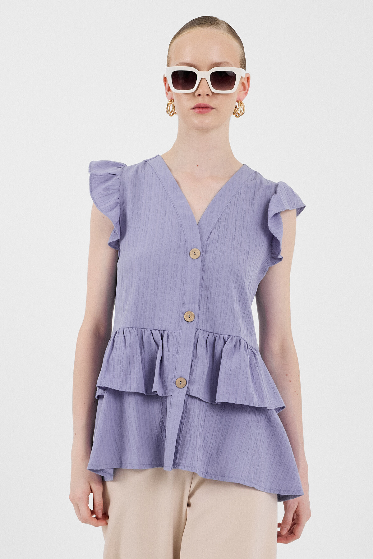 Lila V Yaka Düğmeli Fırfır Kol Bluz 8052A