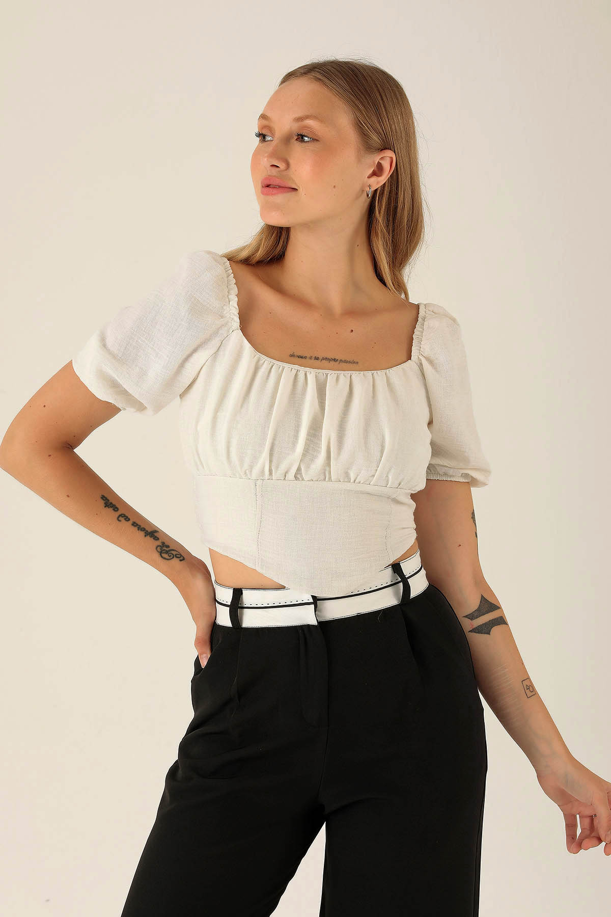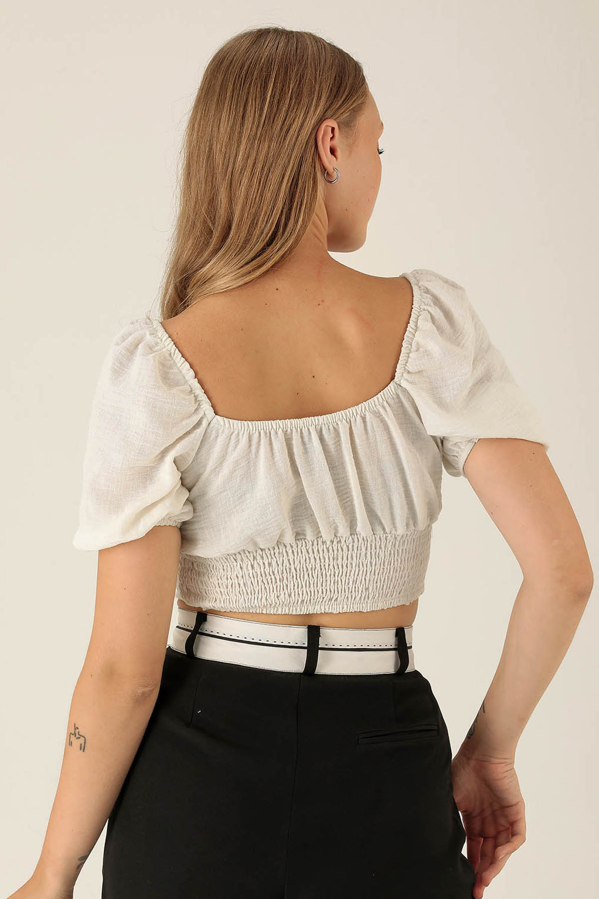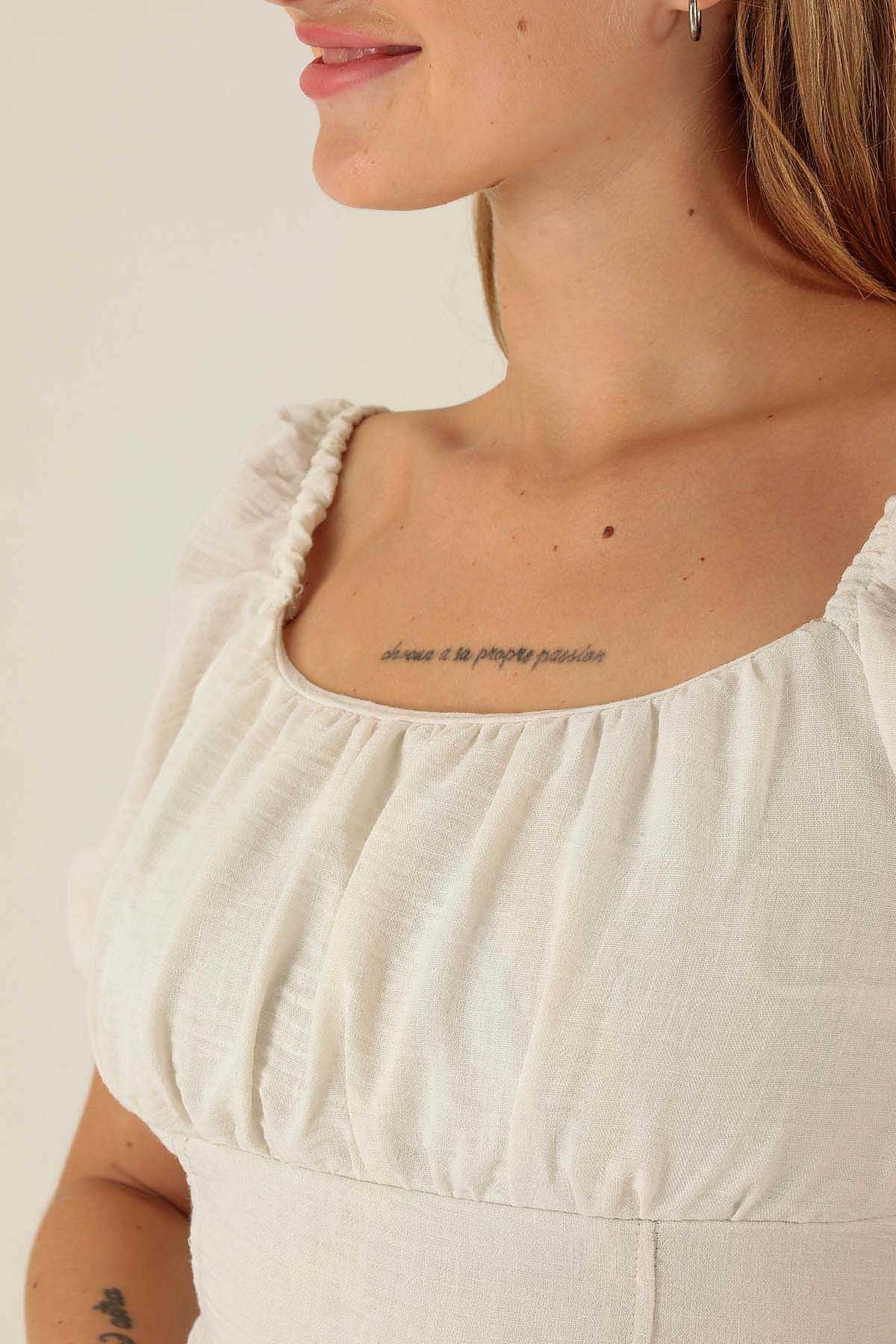 Madonna Yaka Keten Bluz - 10414 Beyaz