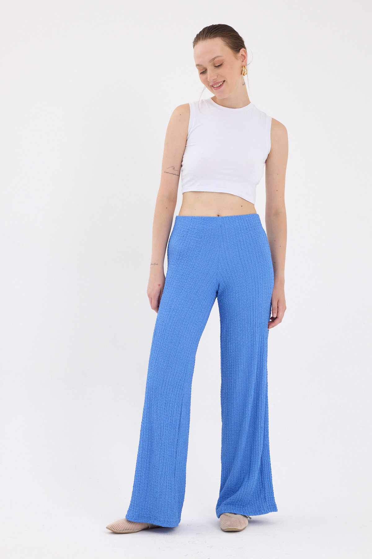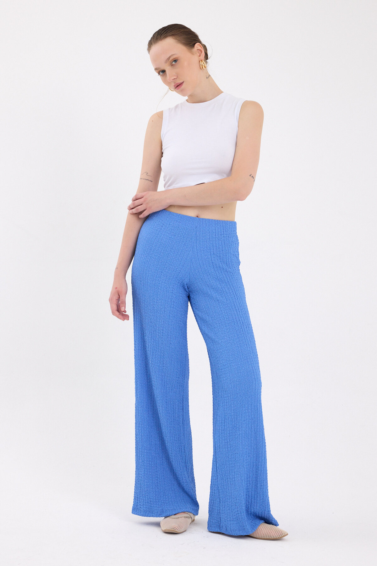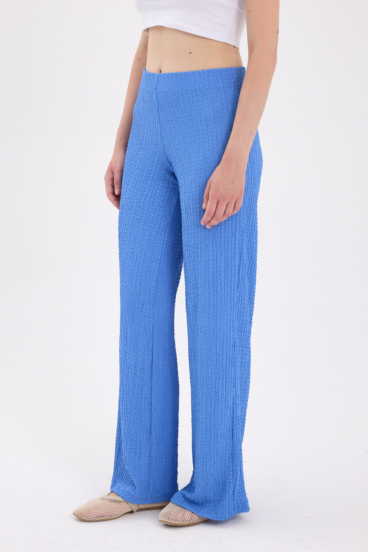 Mavi Bol Paça Bel Lastikli Bürümcük Kumaş Pantolon 2466