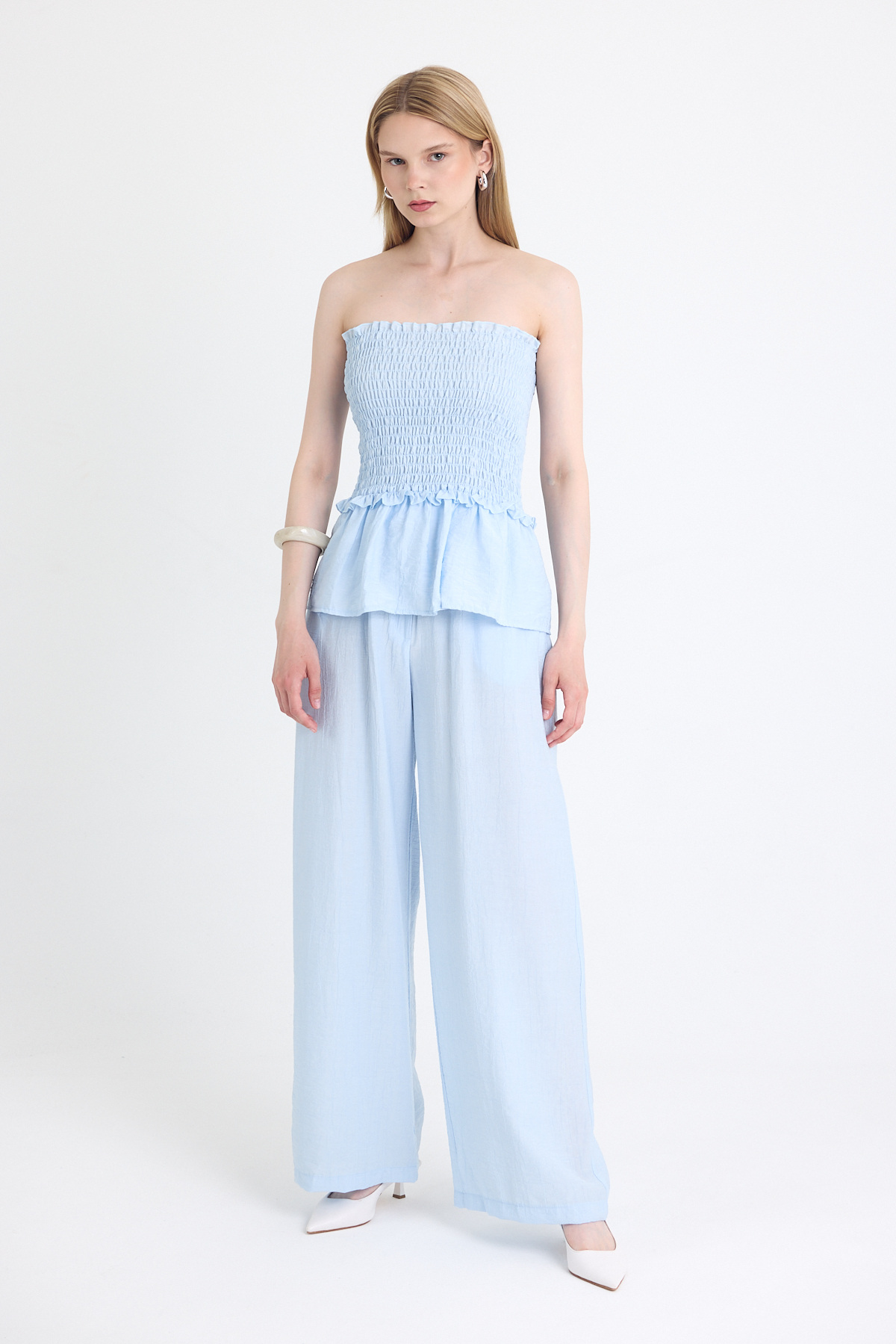Mavi Büzgülü Straplez Bluz ve Bol Paça Pantolon Takım 5249