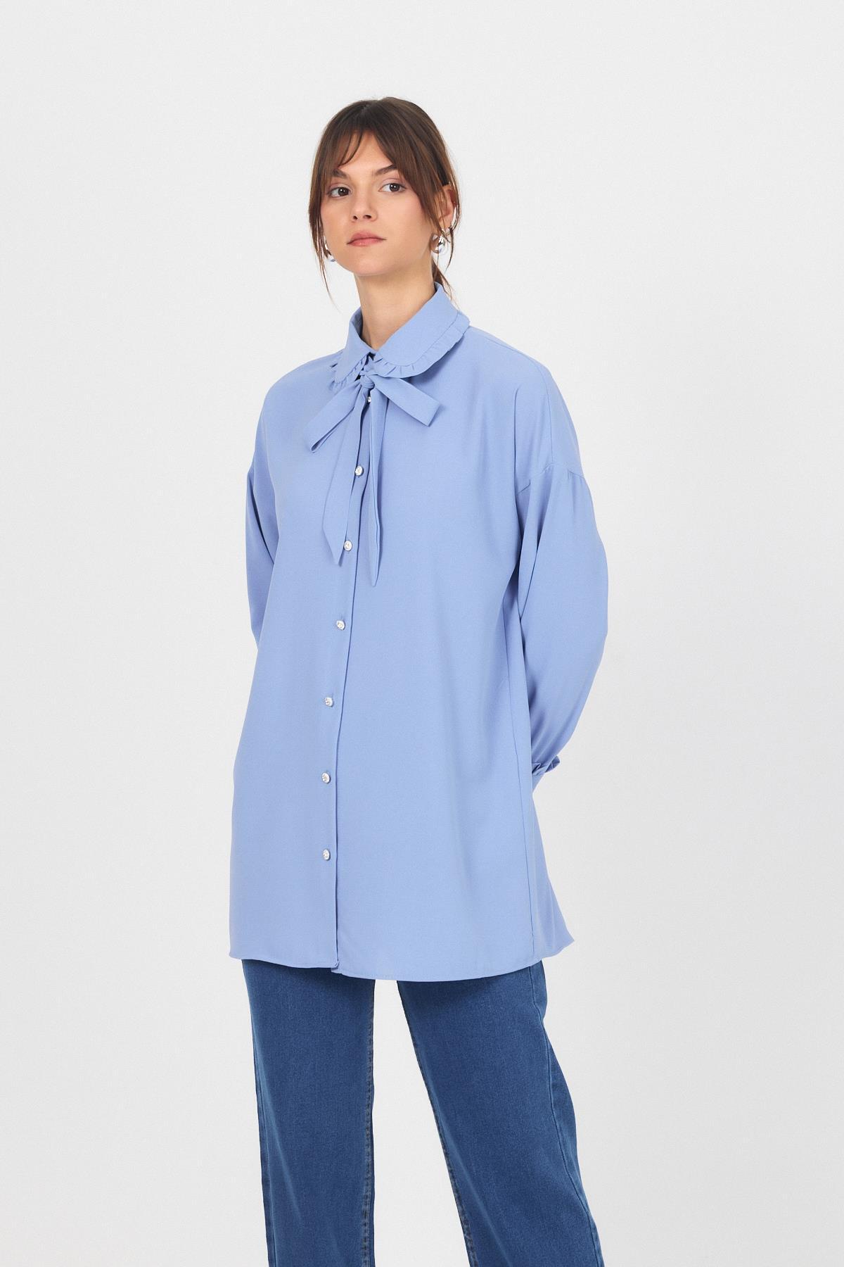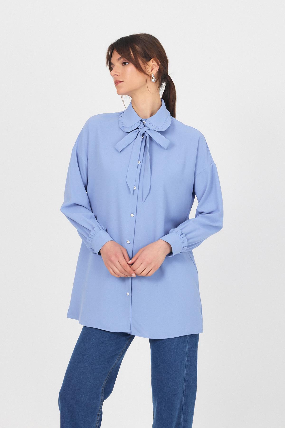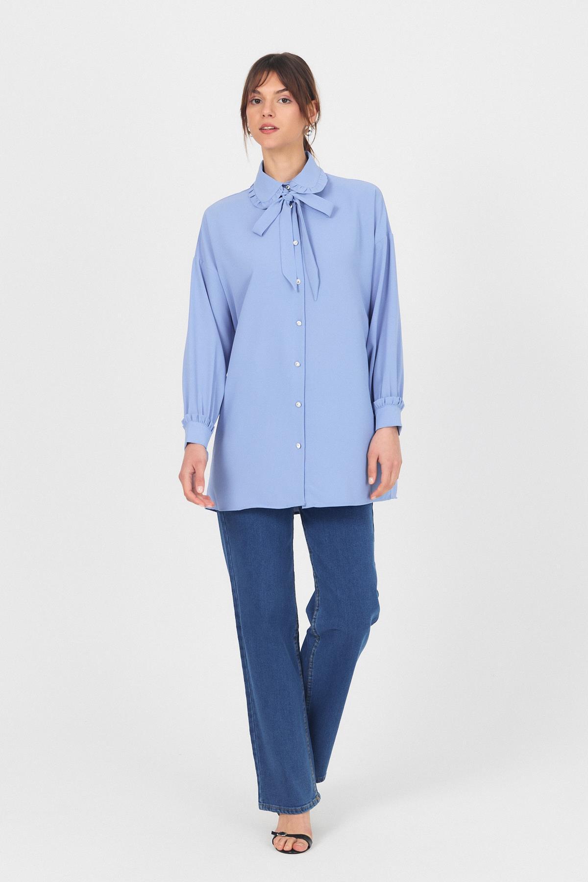 Mavi Fırfır Yaka Detaylı Bağlamalı Tunik 4586A