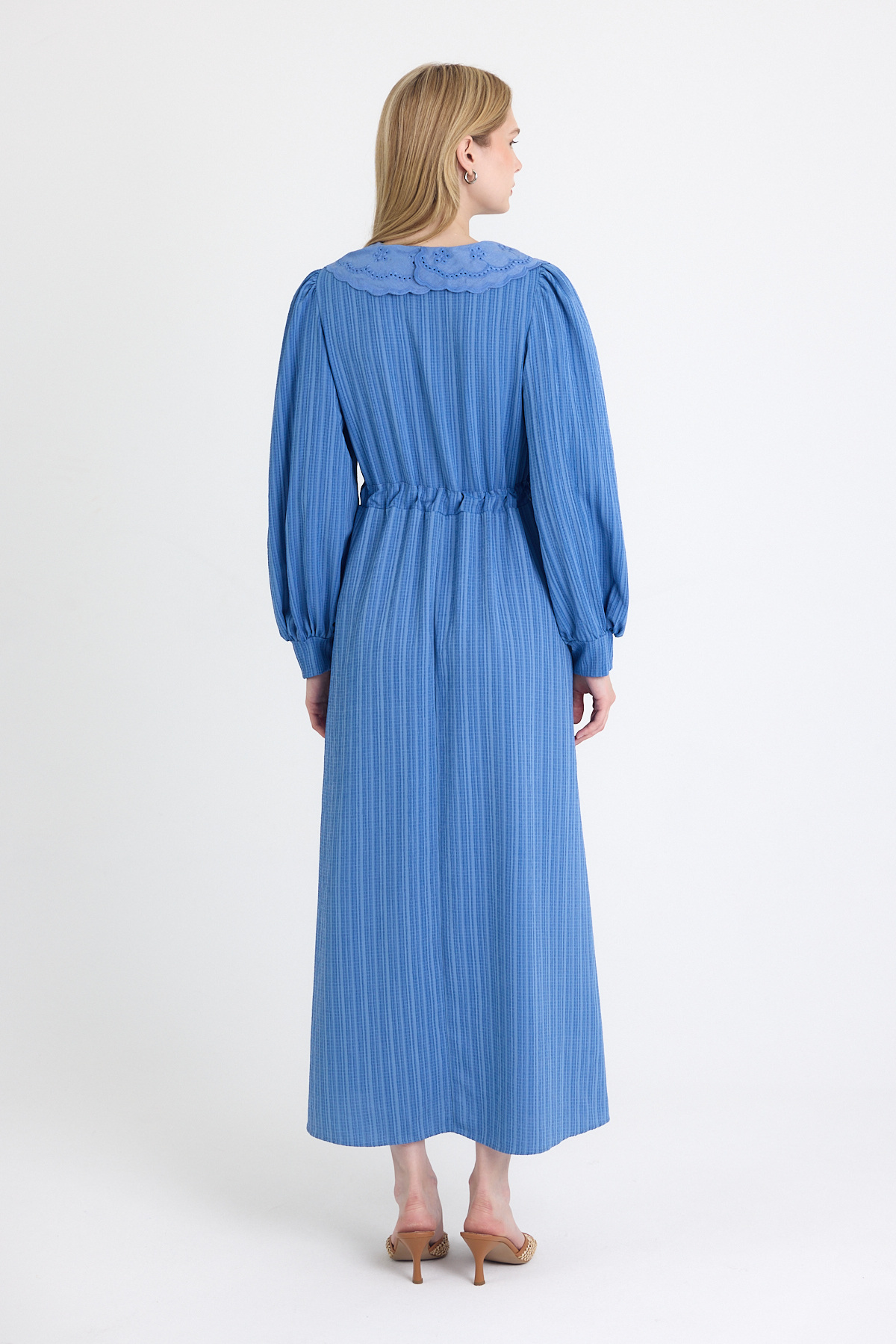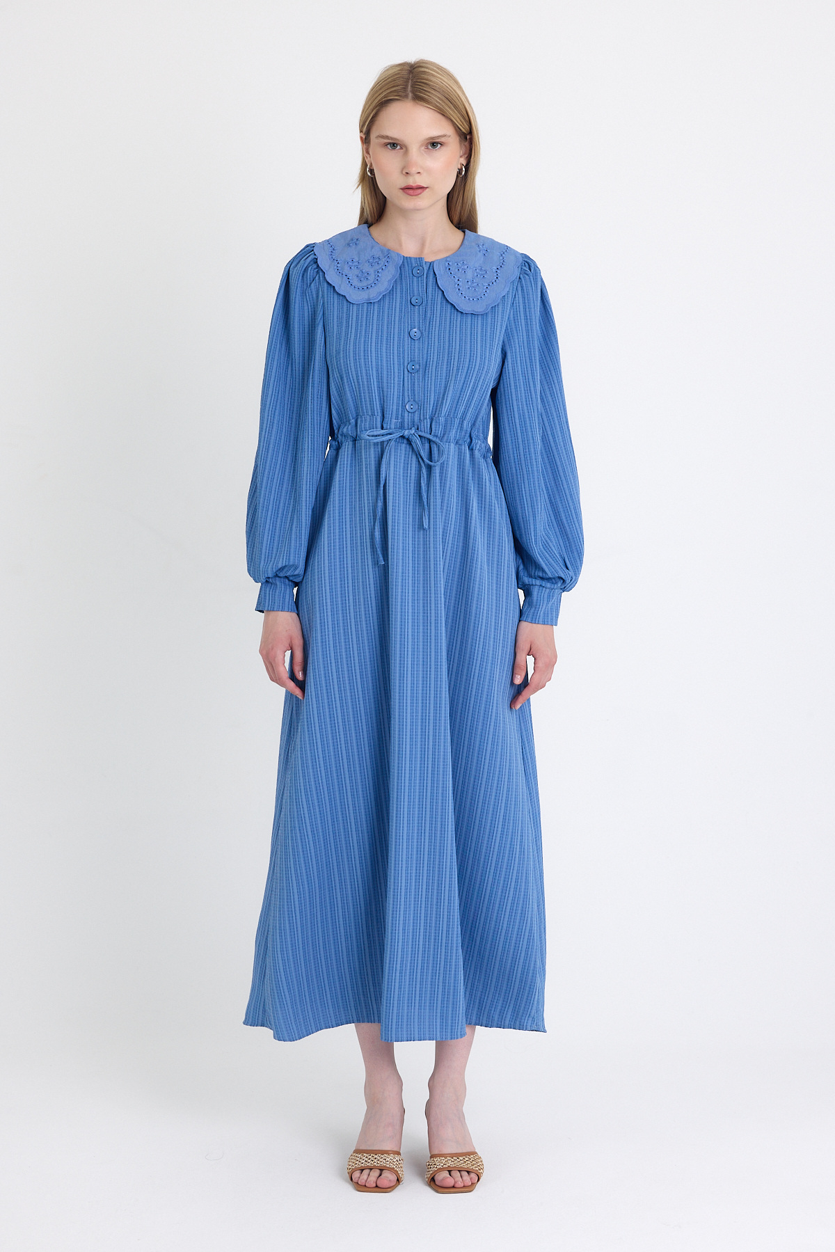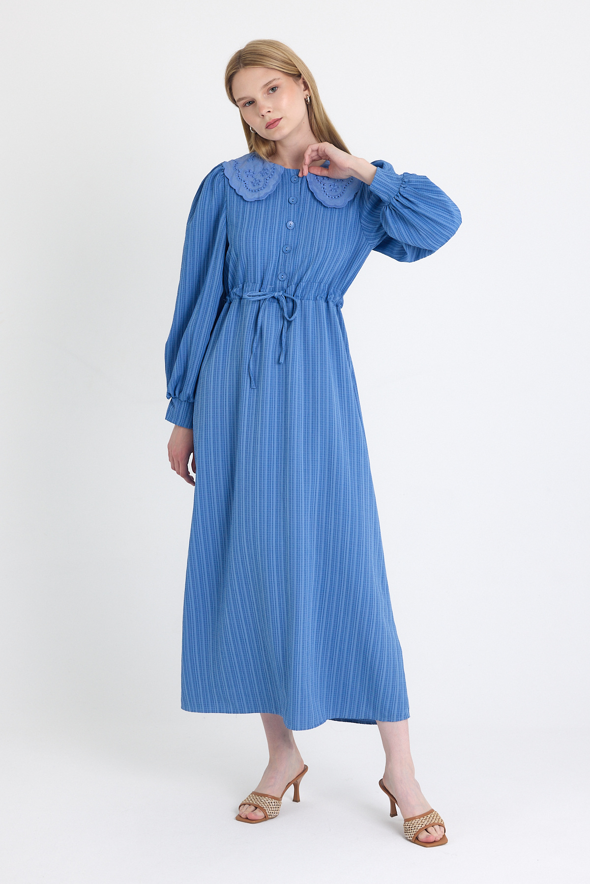 Mavi Fisto Detaylı Geniş Yaka Kuşaklı Çizgili Elbise 4330A