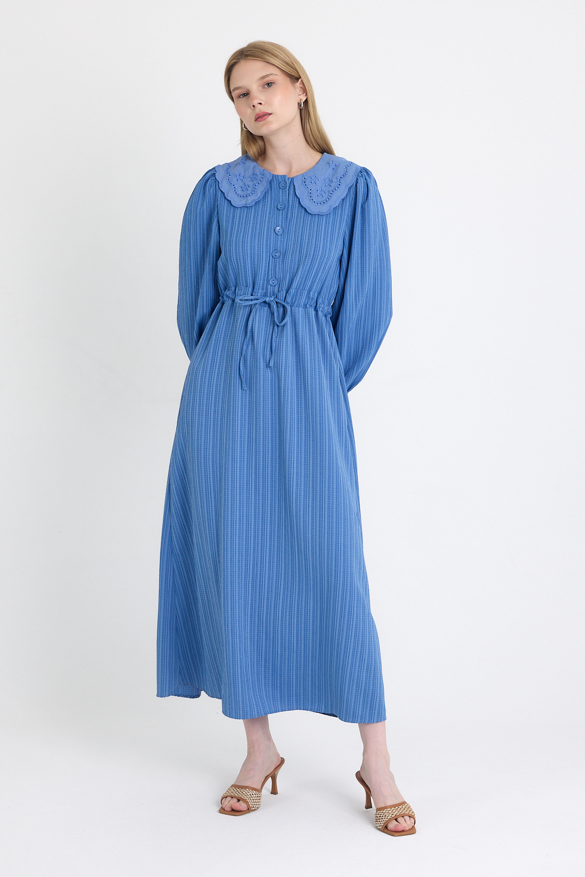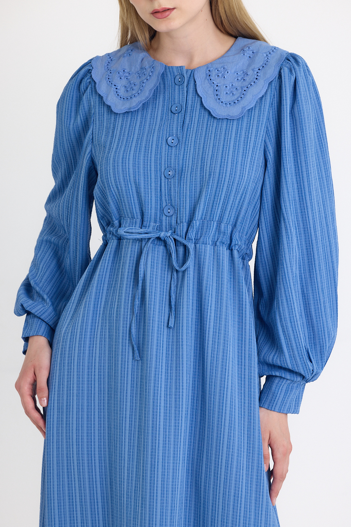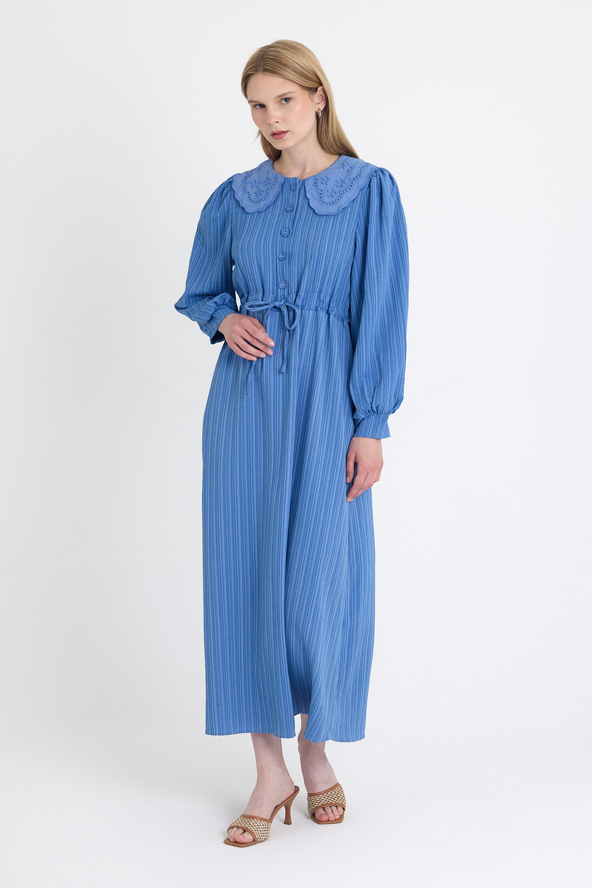 Mavi Fisto Detaylı Geniş Yaka Kuşaklı Çizgili Elbise 4330A