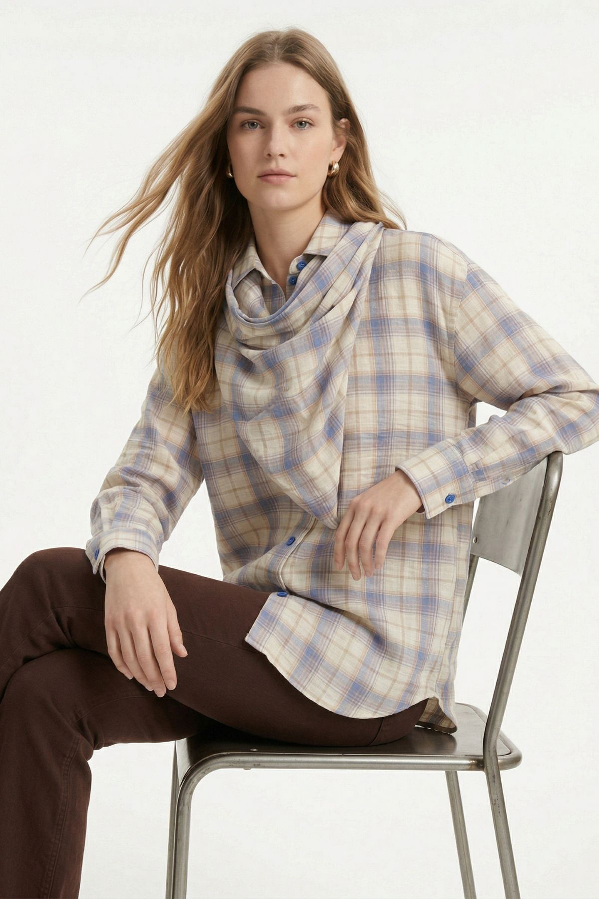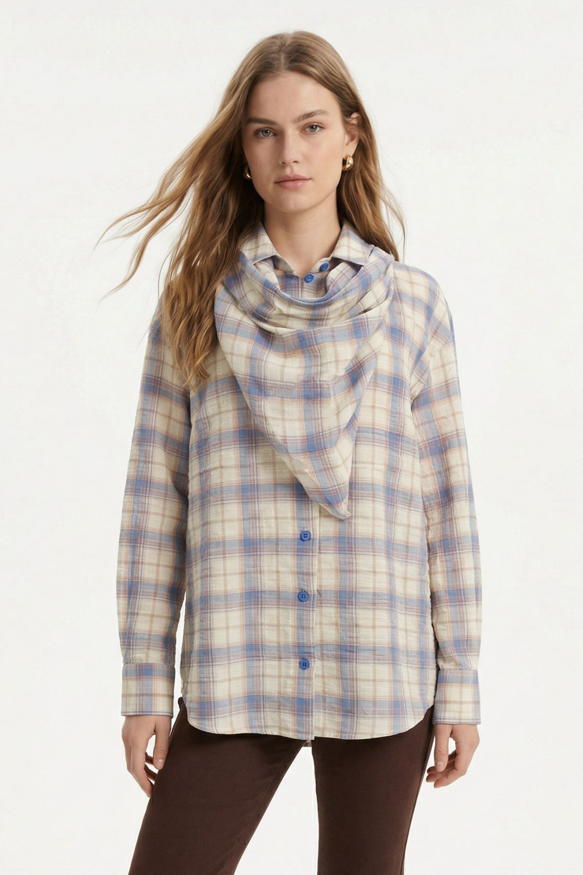 Mavi Üçgen Fularlı Oversize Ekose Gömlek 5484