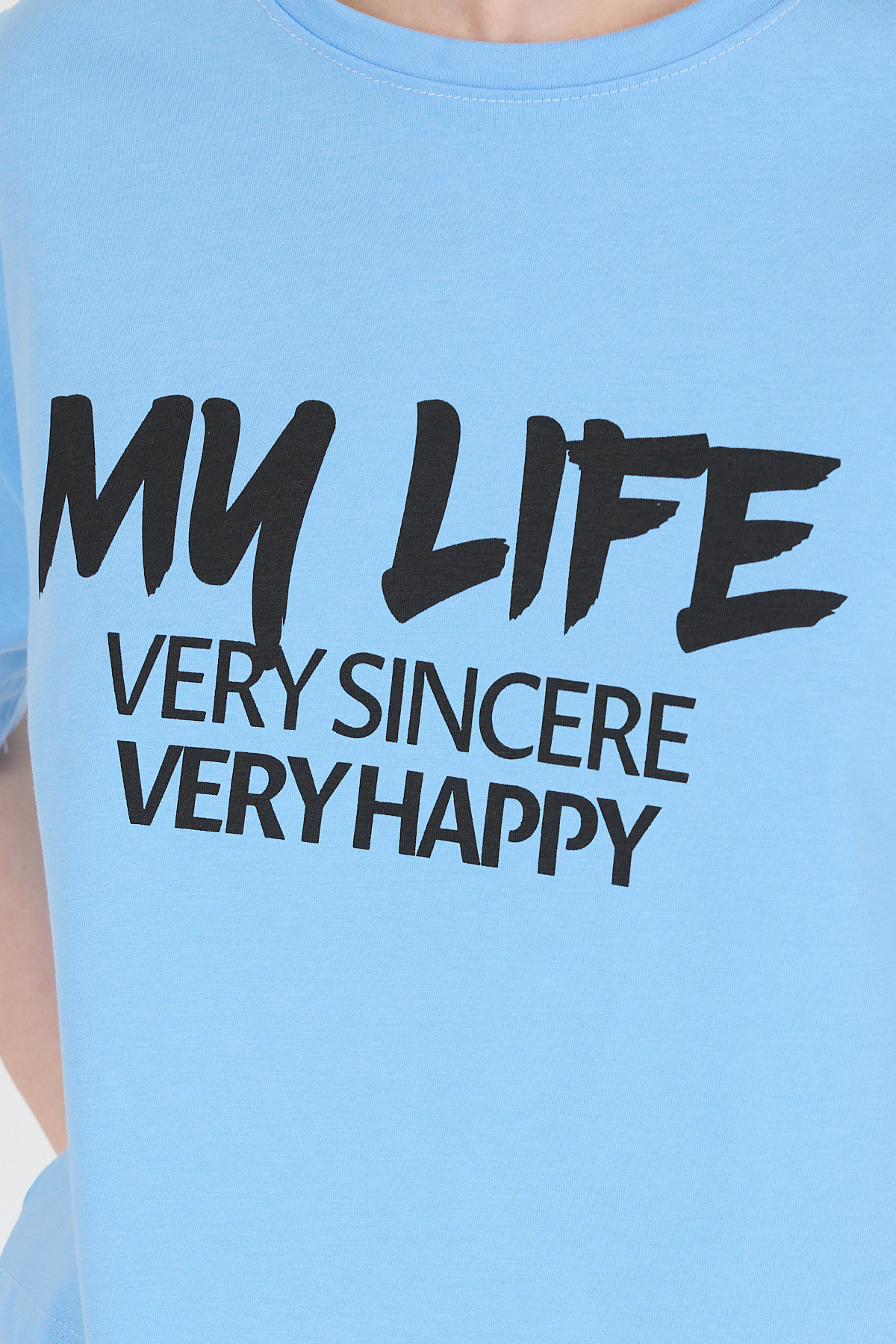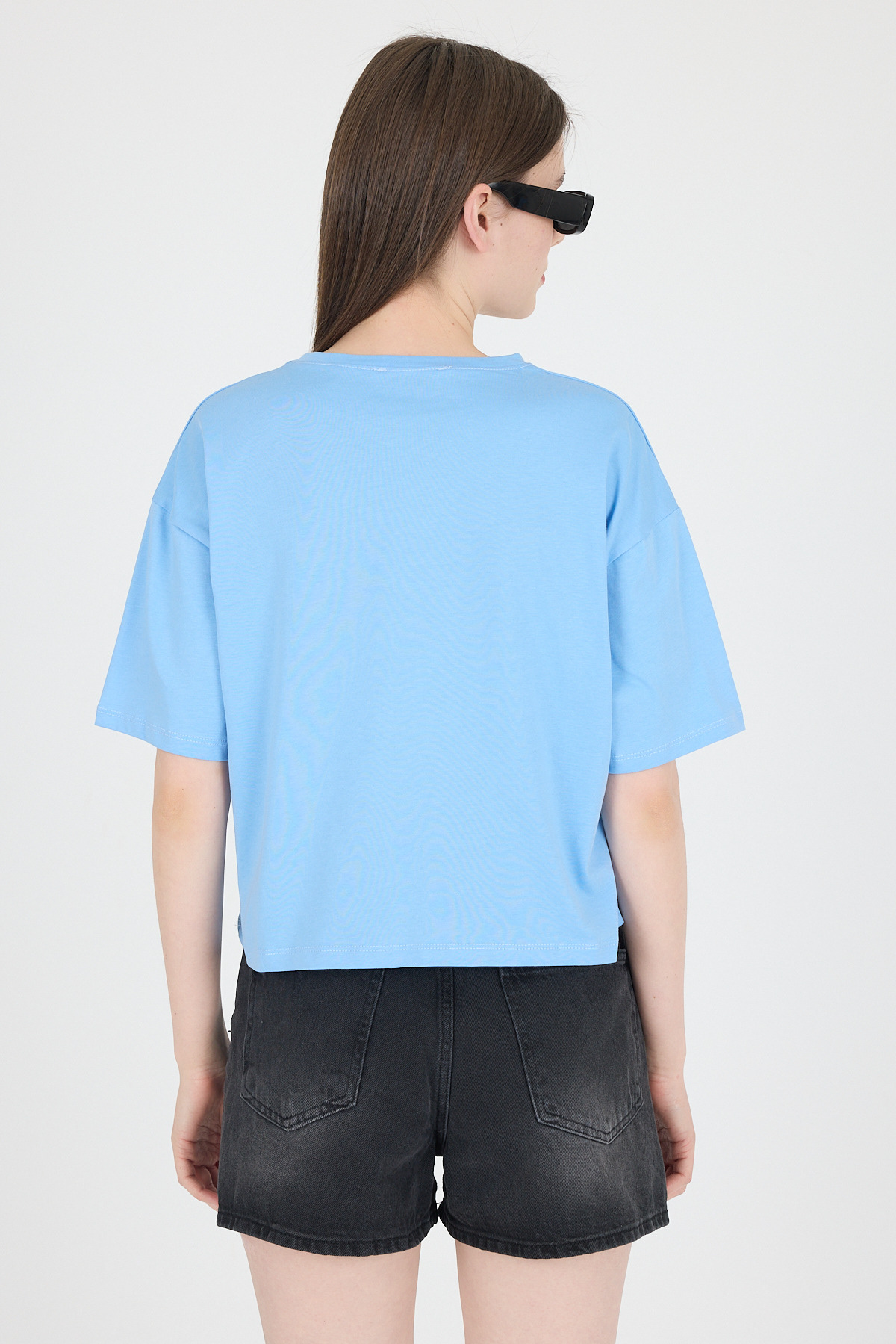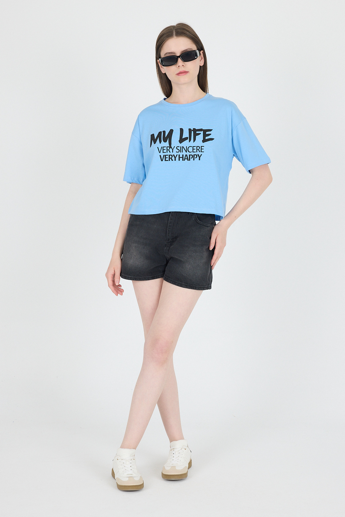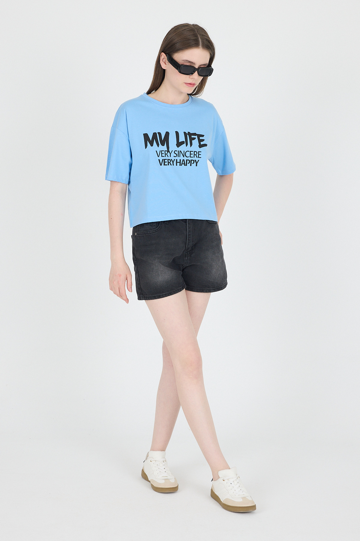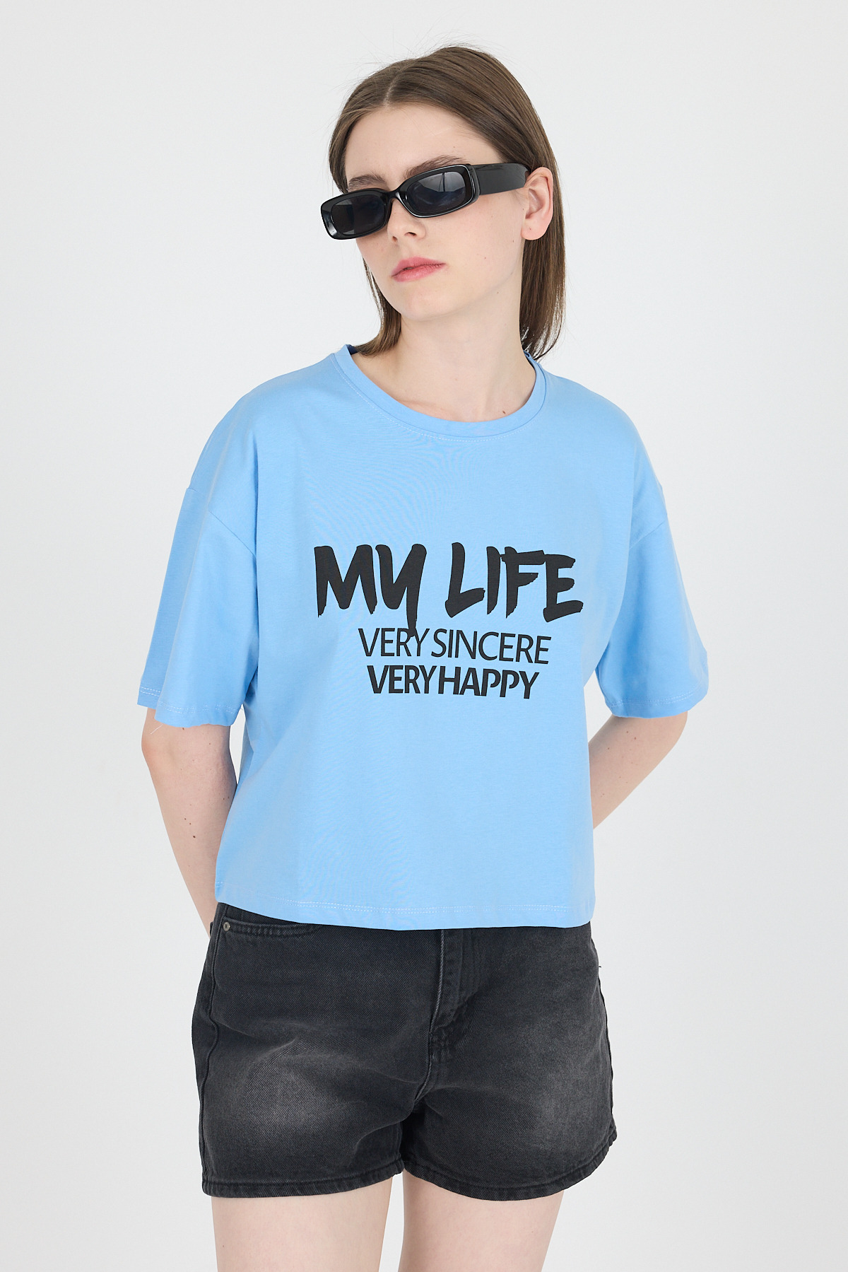 Mavi Yazı Baskılı %100 Pamuk Crop Tişört 9187M