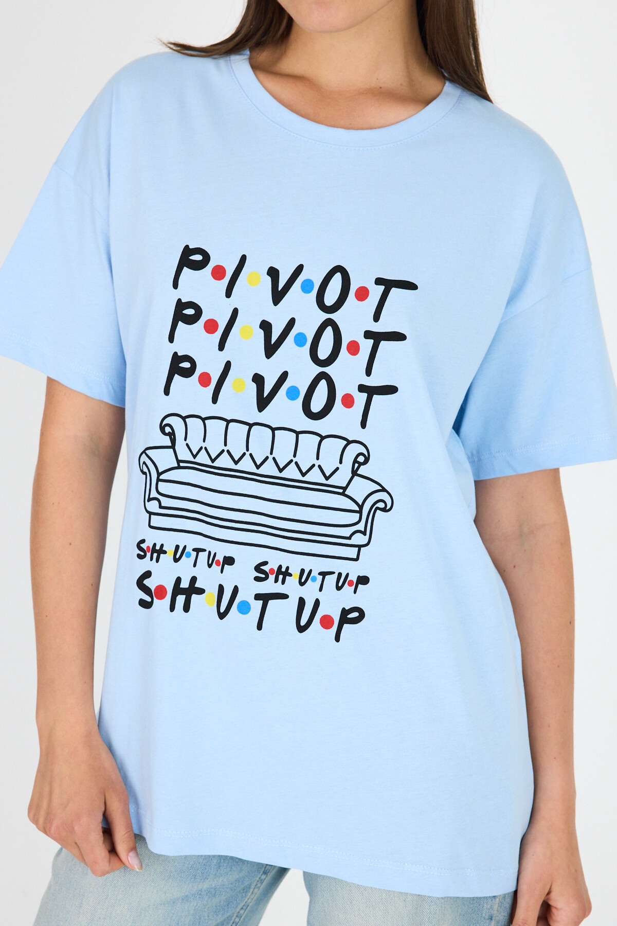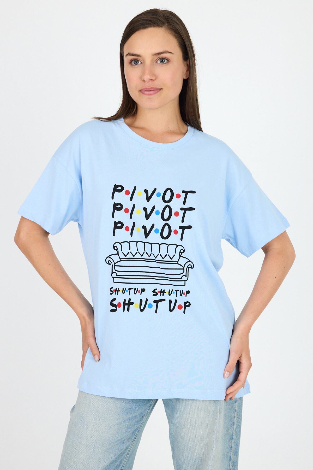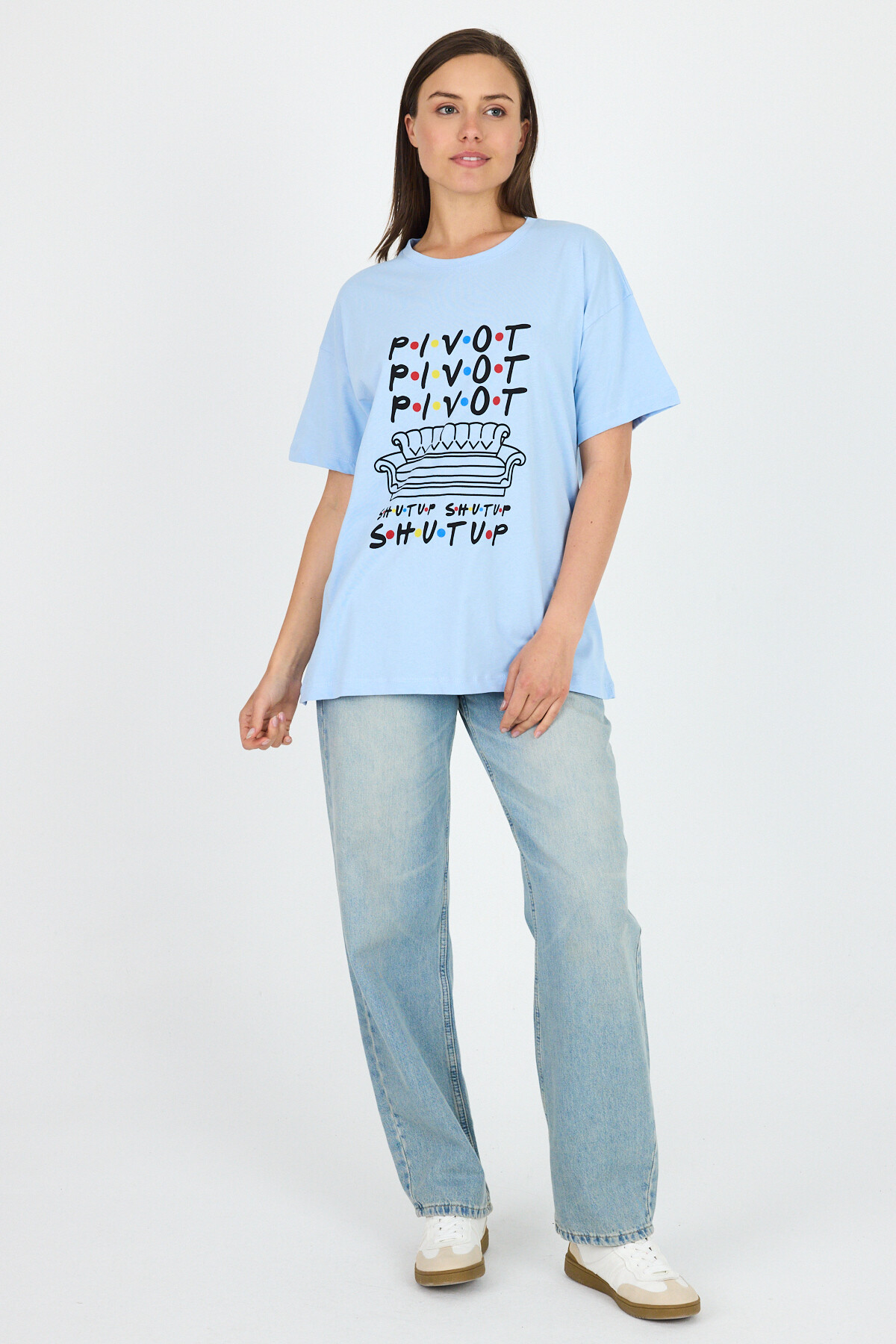 Mavi Yazı Baskılı %100 Pamuk Oversize Tişört 2150-10M