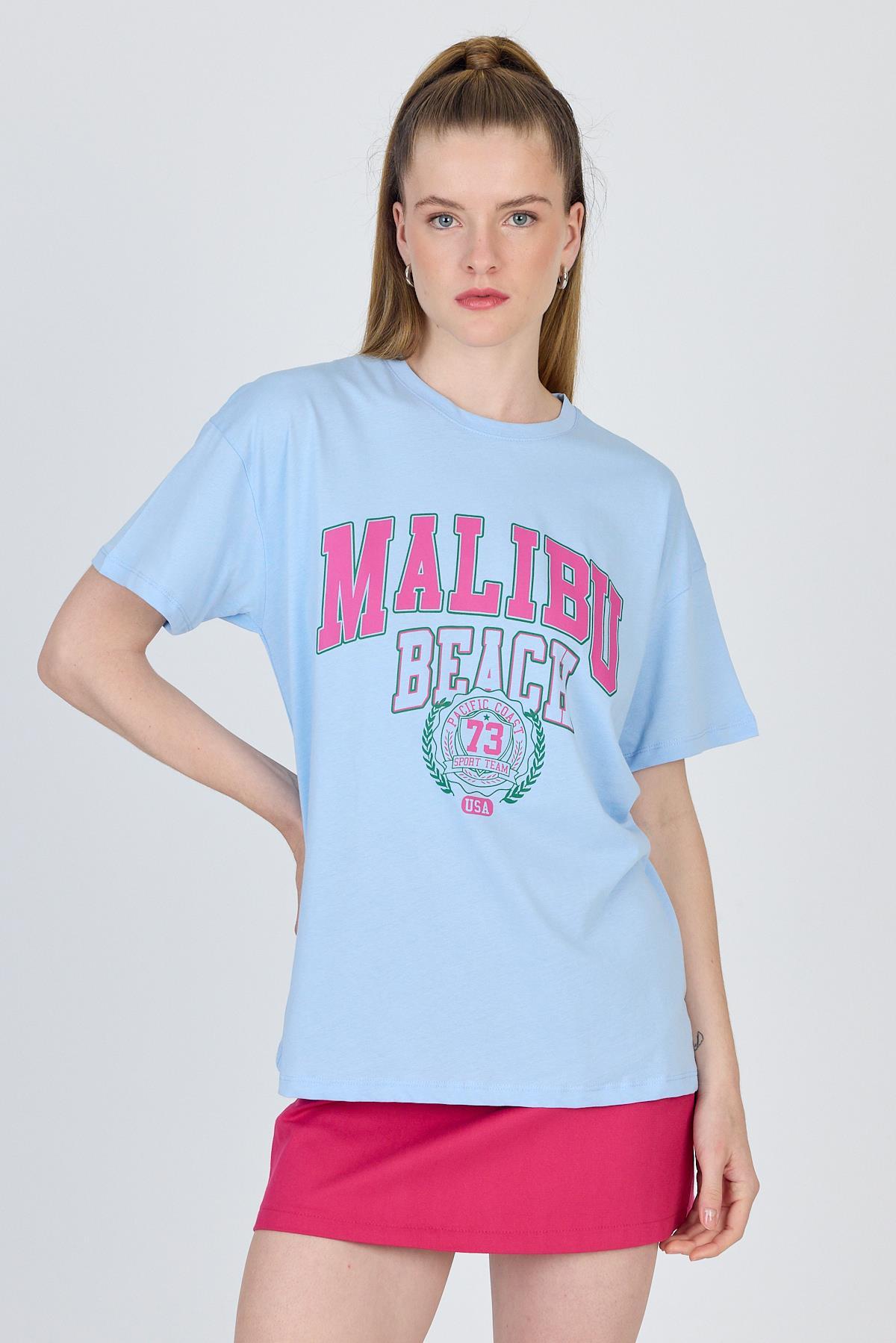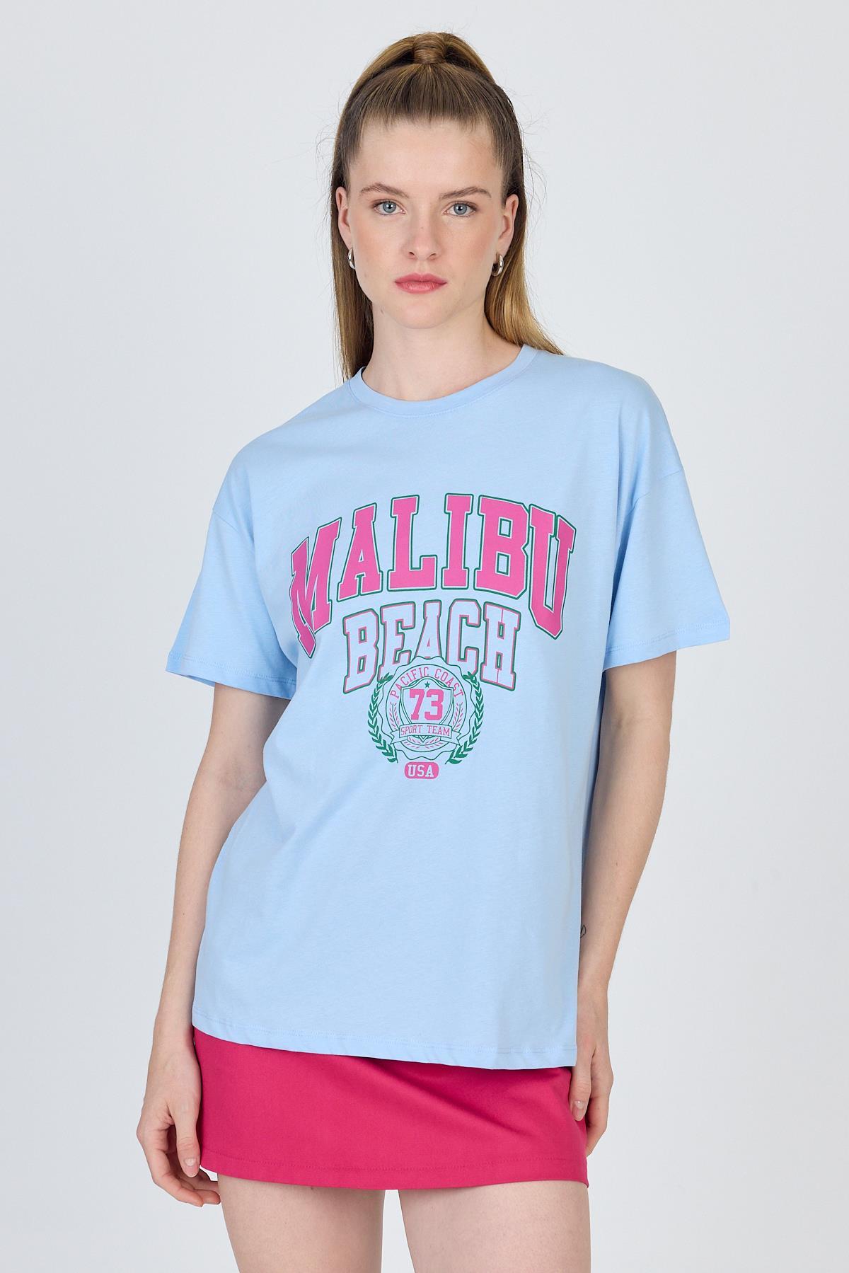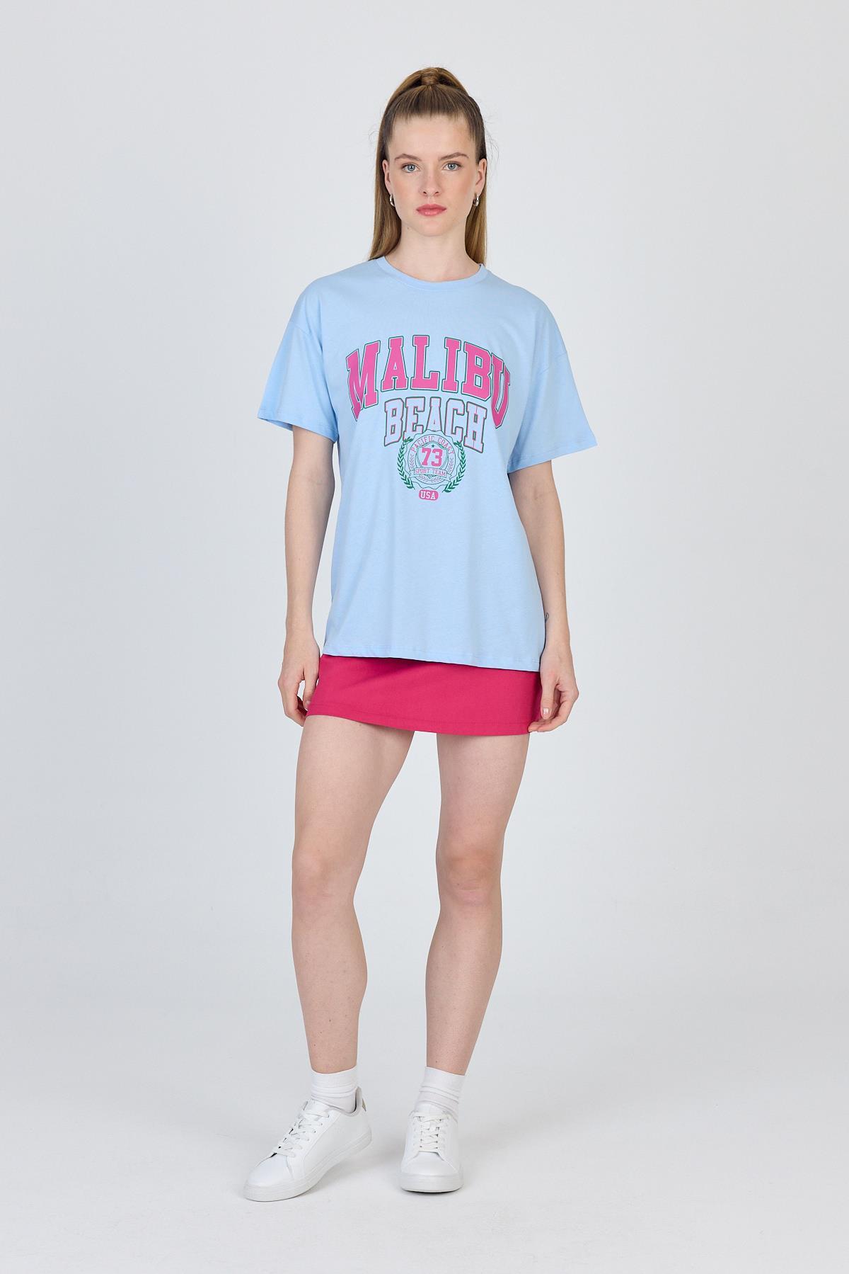 Mavi Yazı Baskılı %100 Pamuk Oversize Tişört 2150-17M