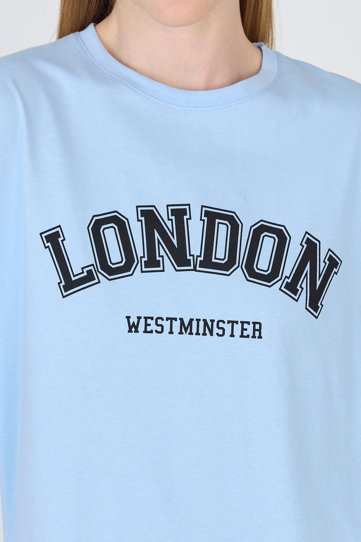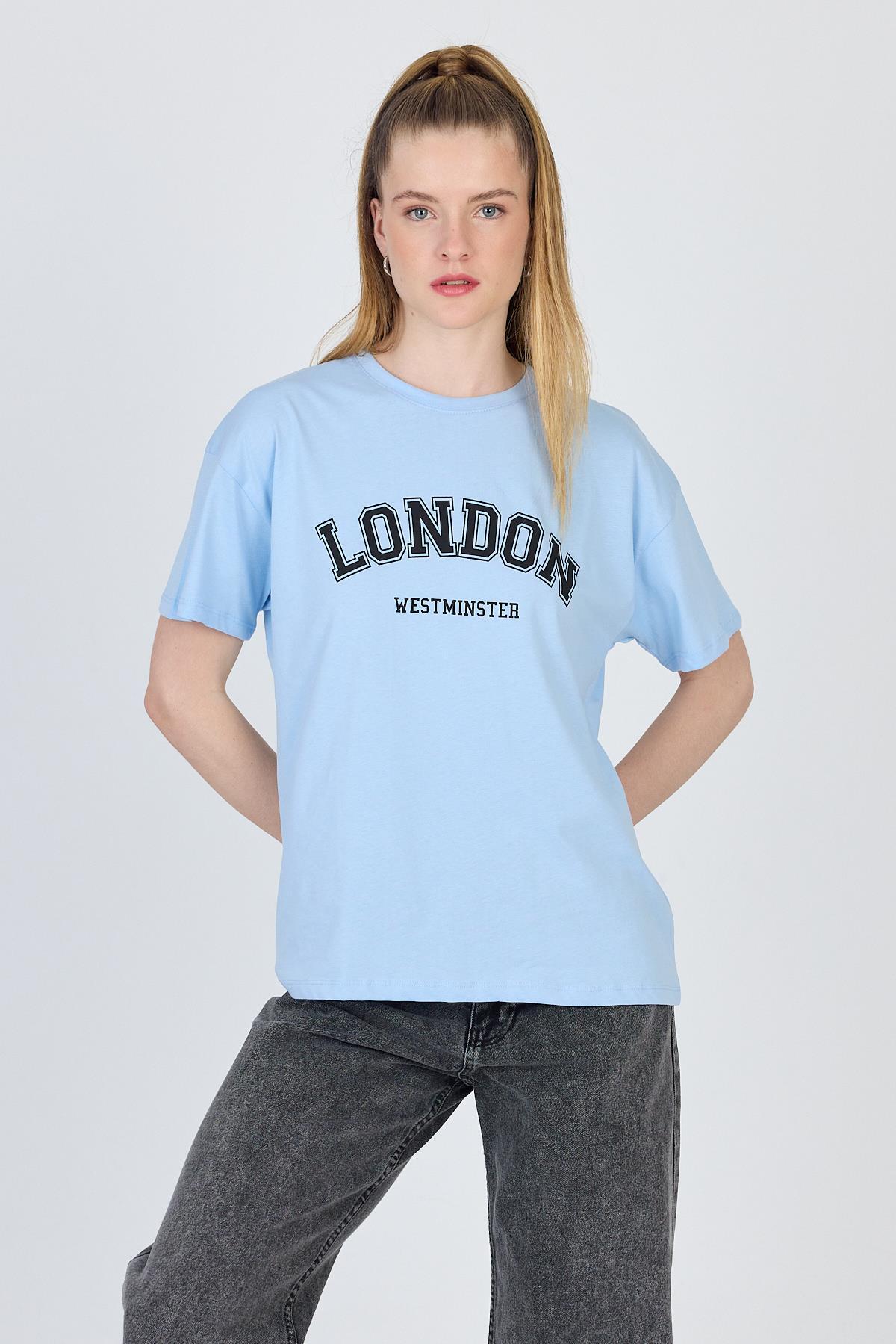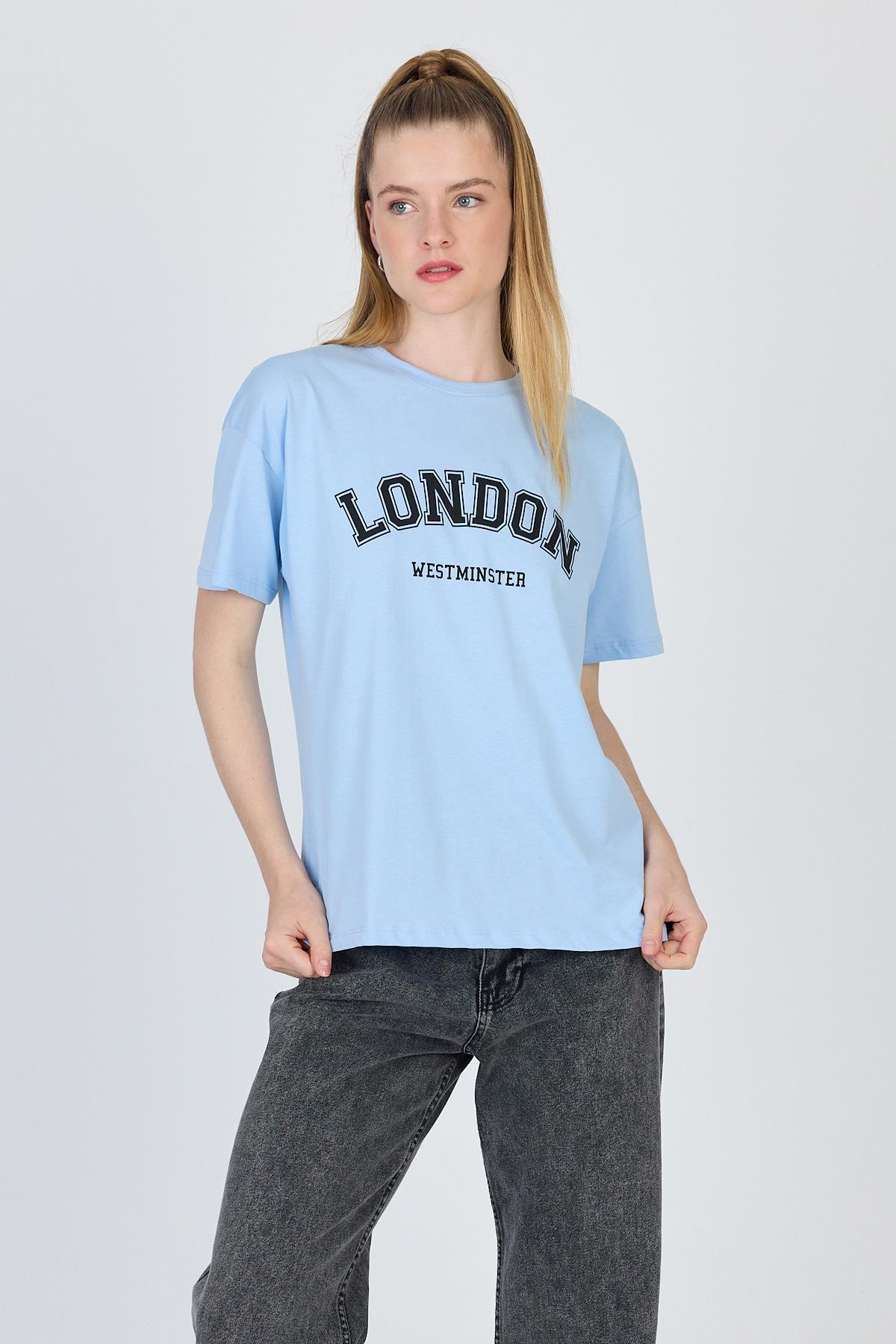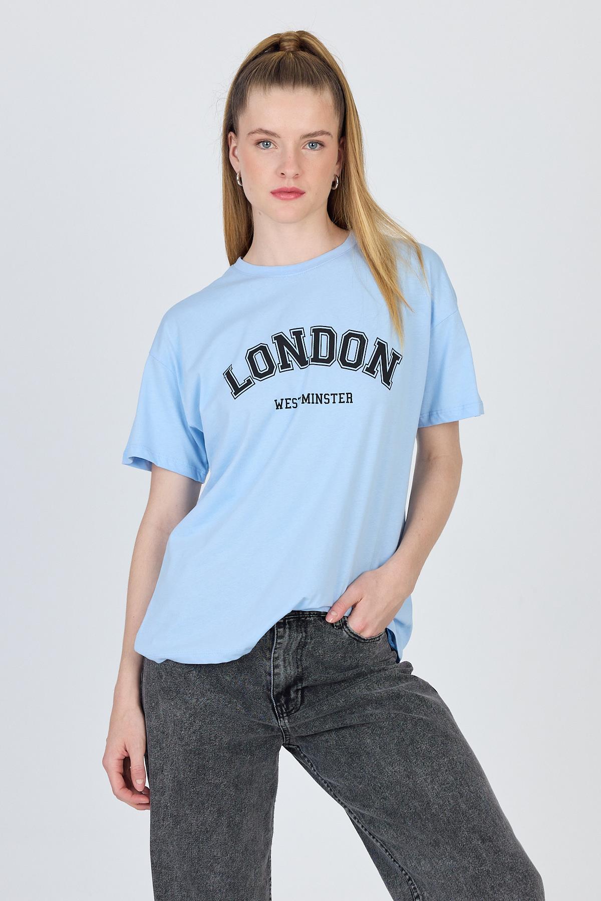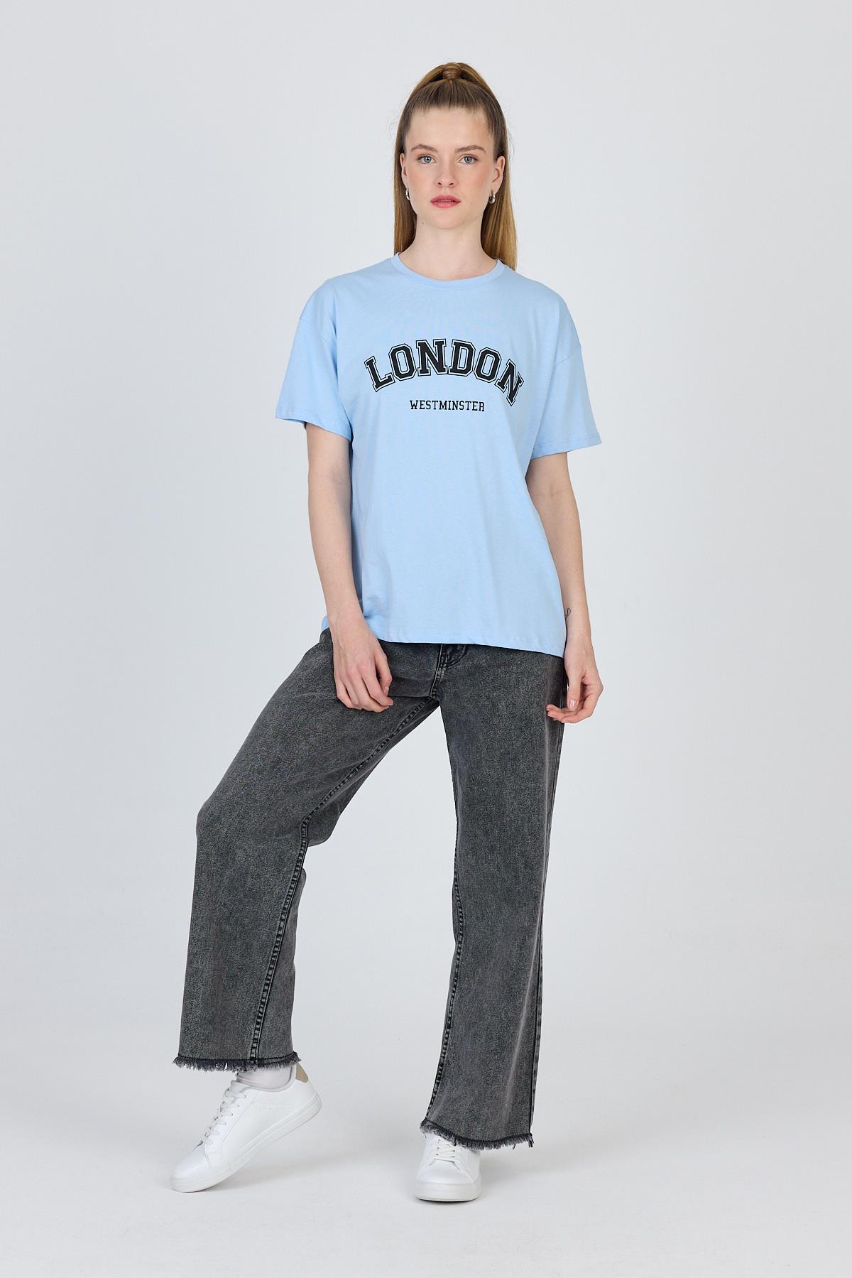 Mavi Yazı Baskılı %100 Pamuk Oversize Tişört 2150-9M