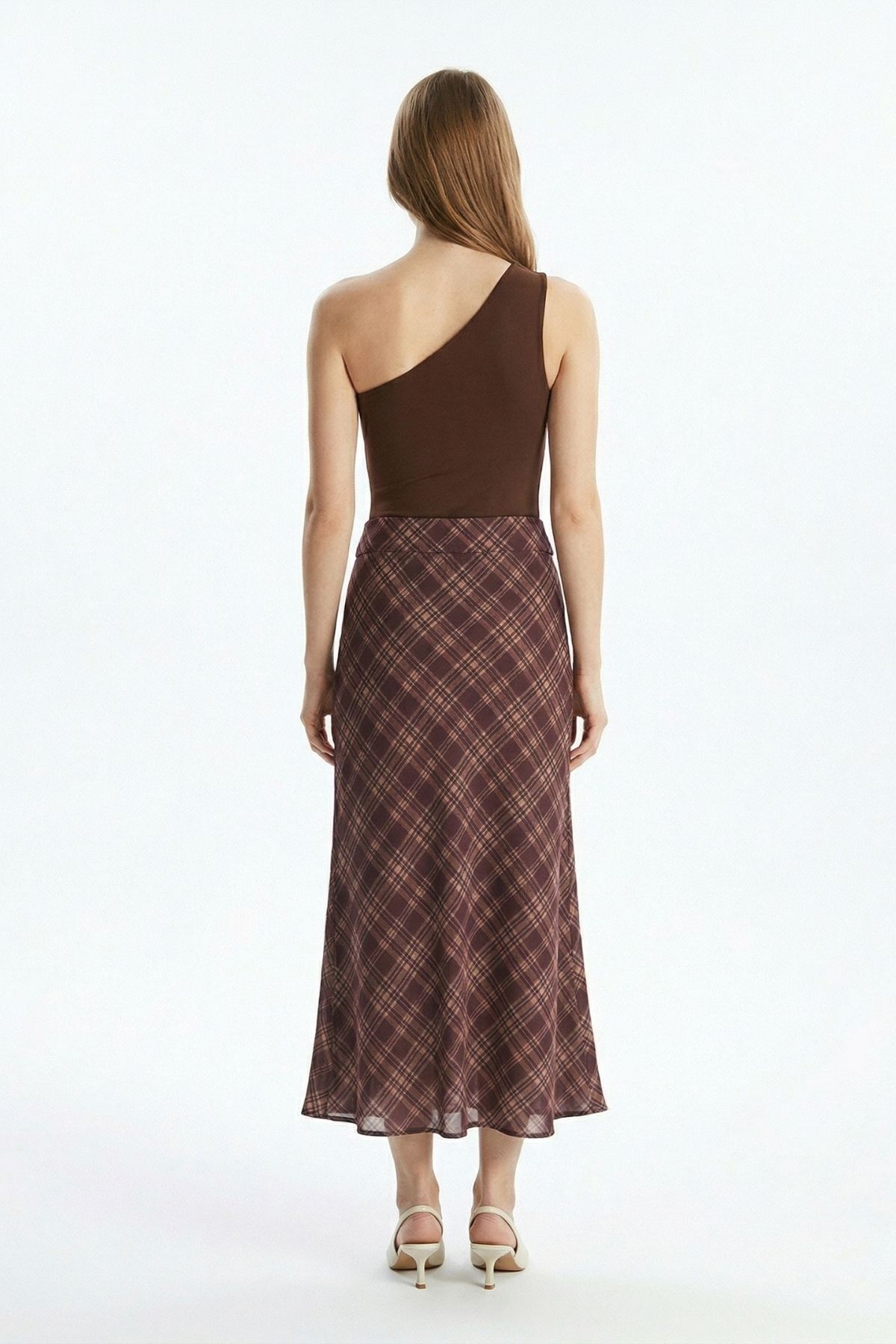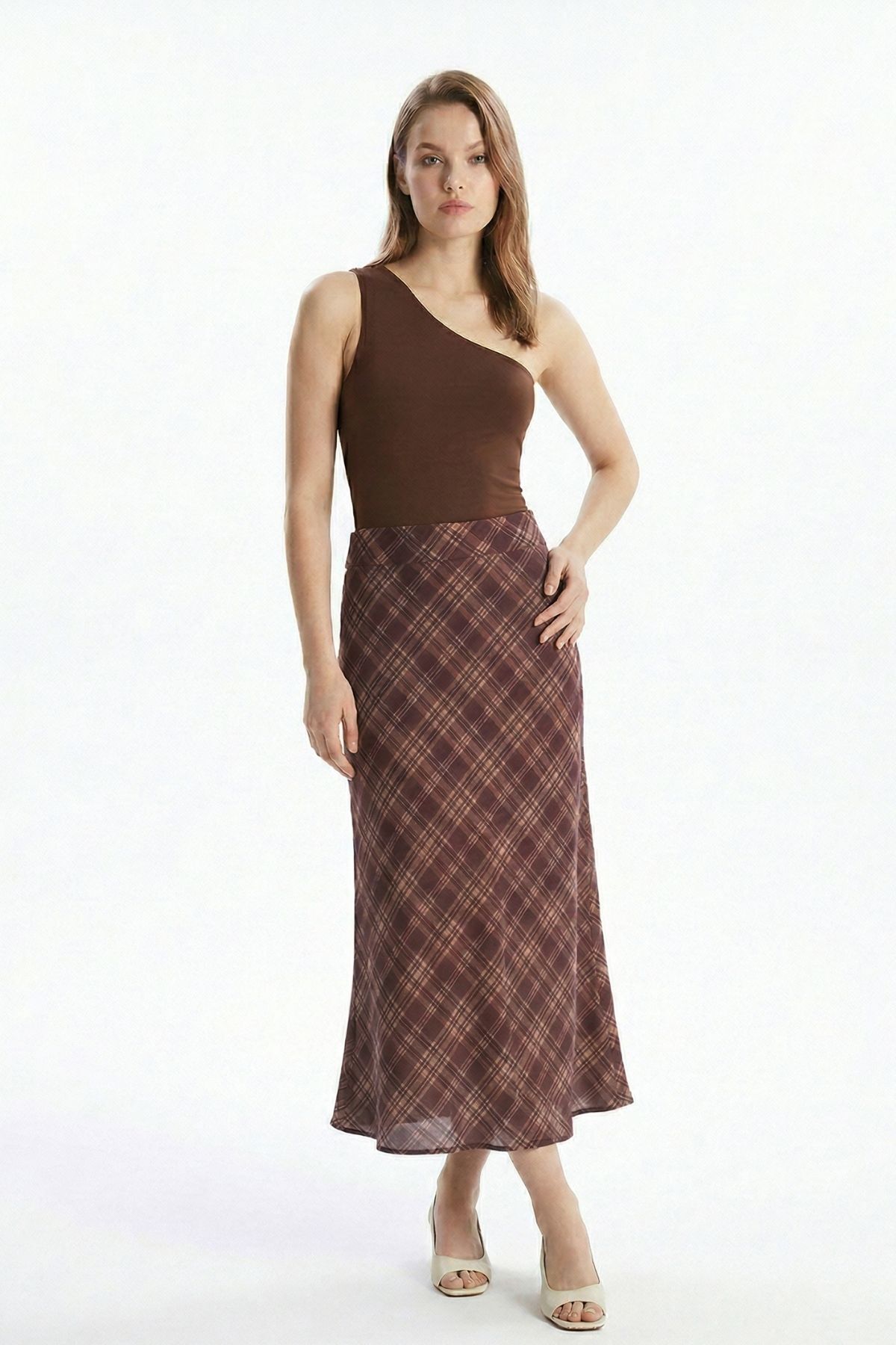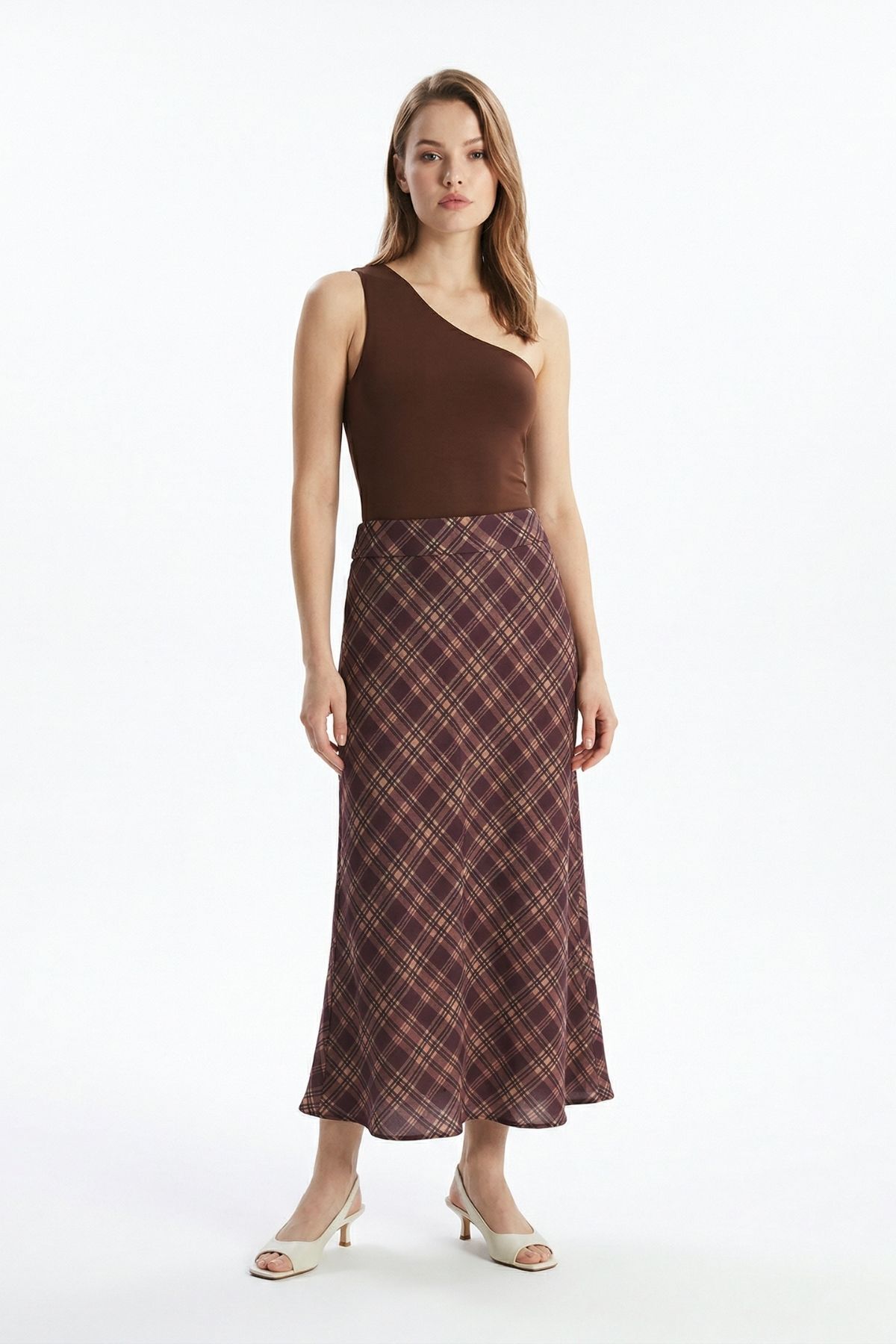 Mürdüm Ekose Desen Bel Lastikli Etek 3507-1