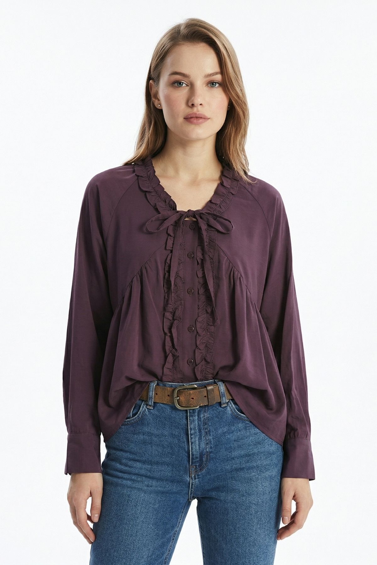 Mürdüm V Yaka Fırfırlı Bağlama Detay Bluz 0108