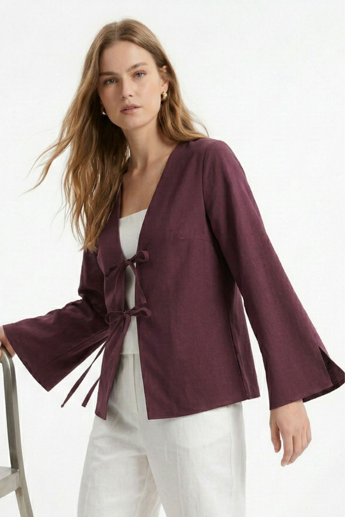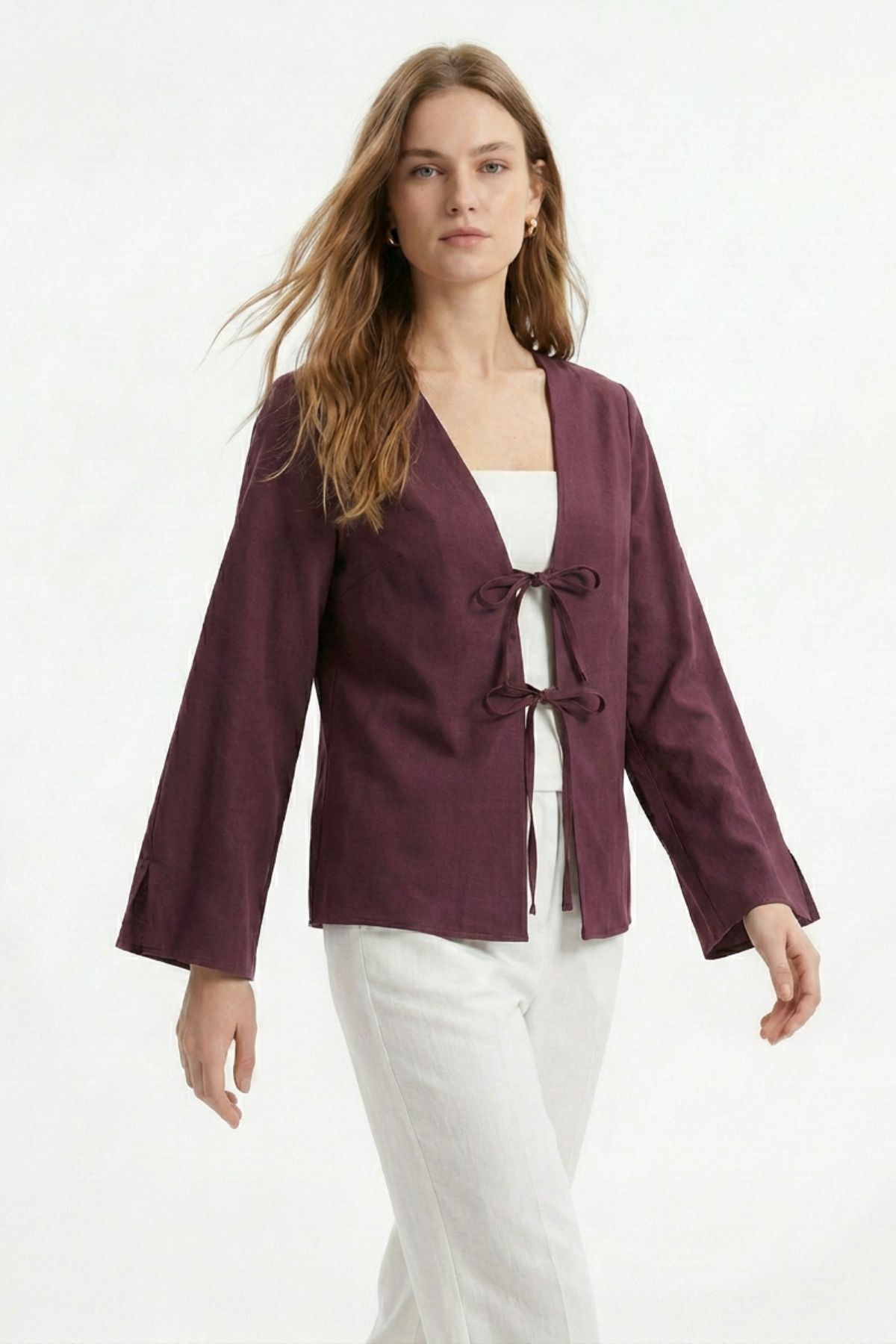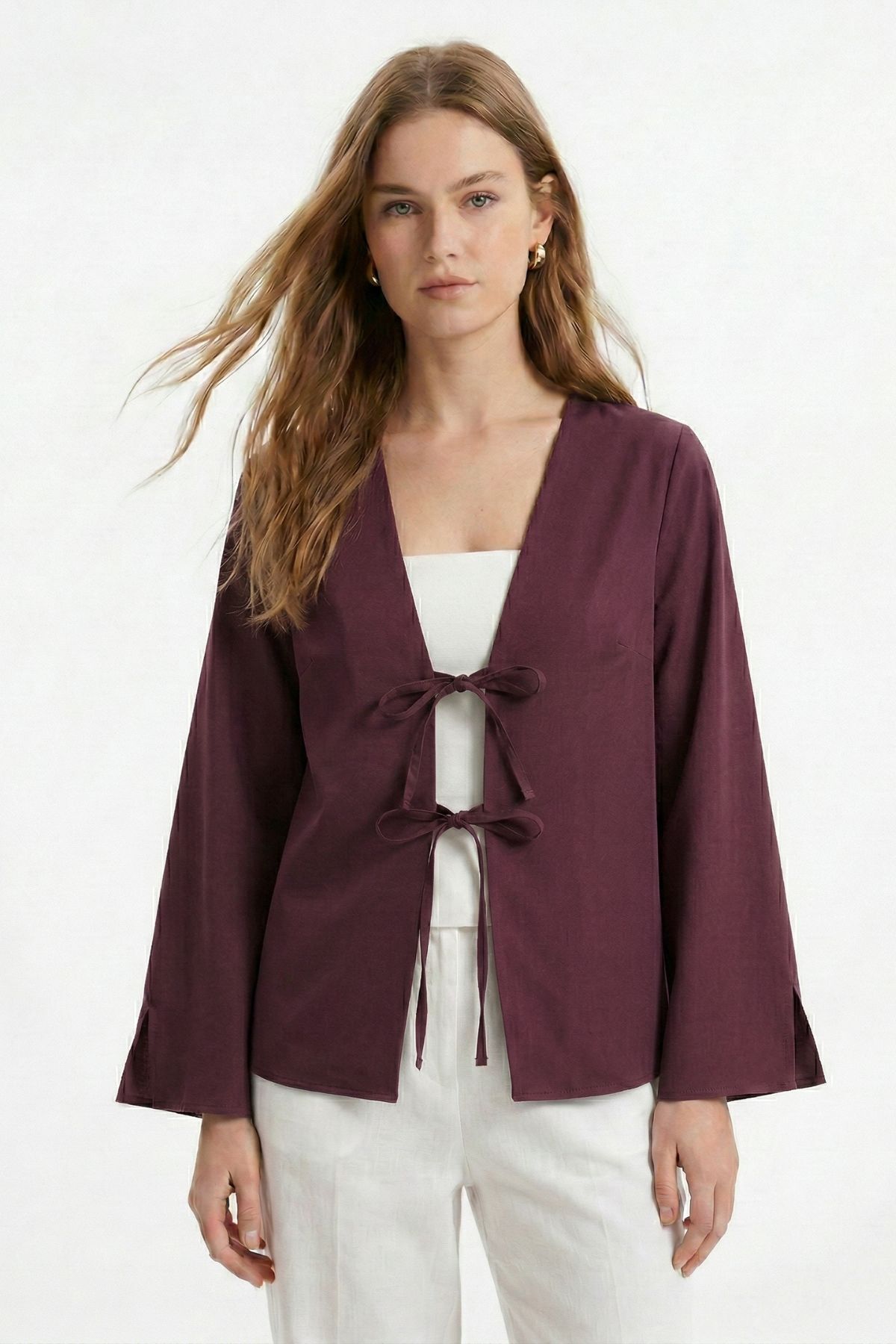 Mürdüm Yırtmaçlı İspanyol Kol Ön Bağlama Kimono 5425