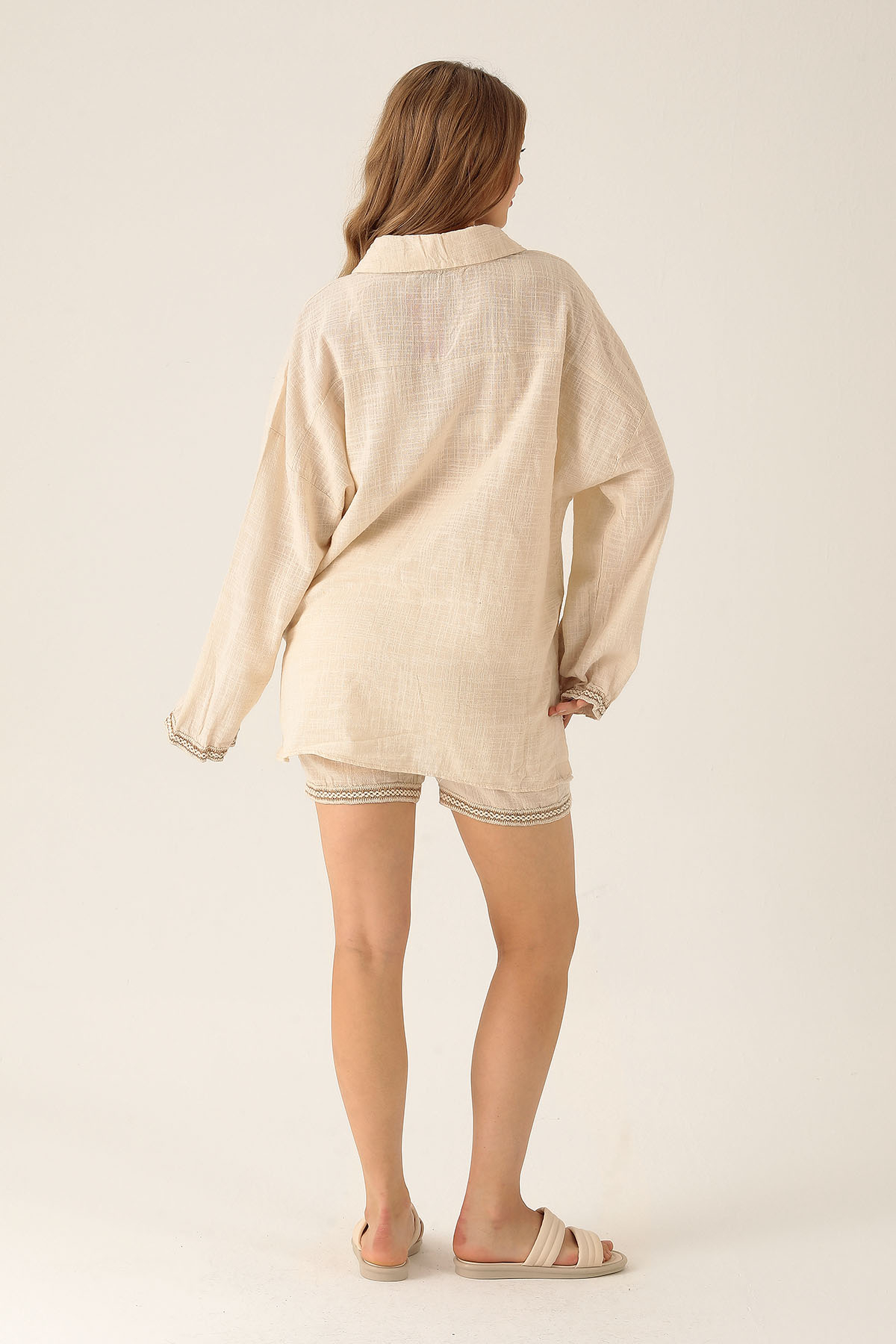 Nakış Detay Bayan Gömlek Şort Takım - 2745 Natural