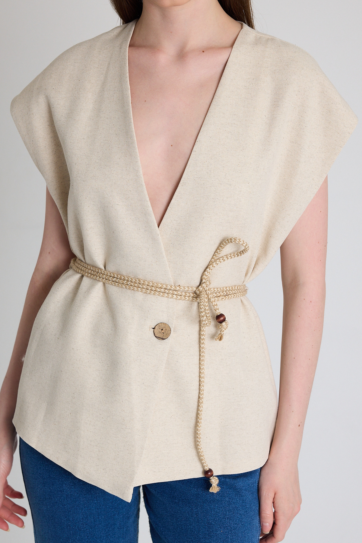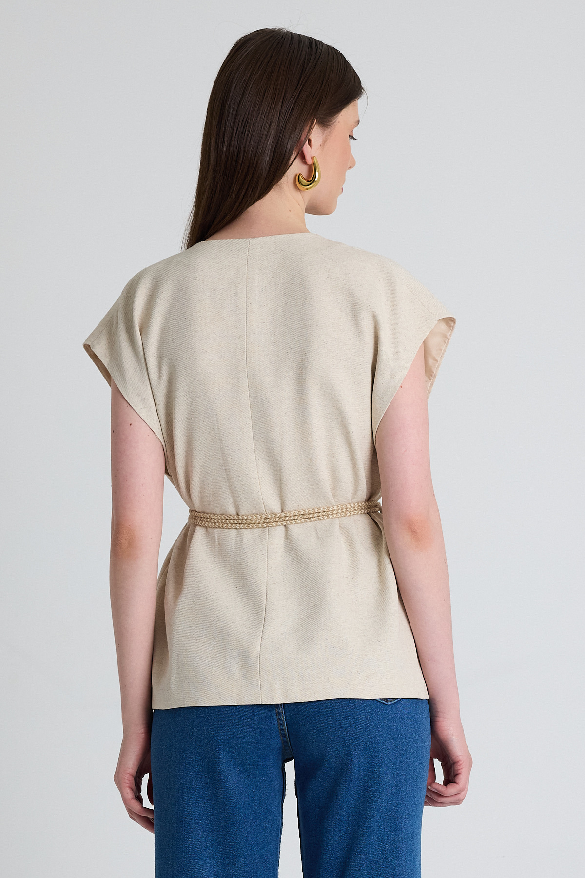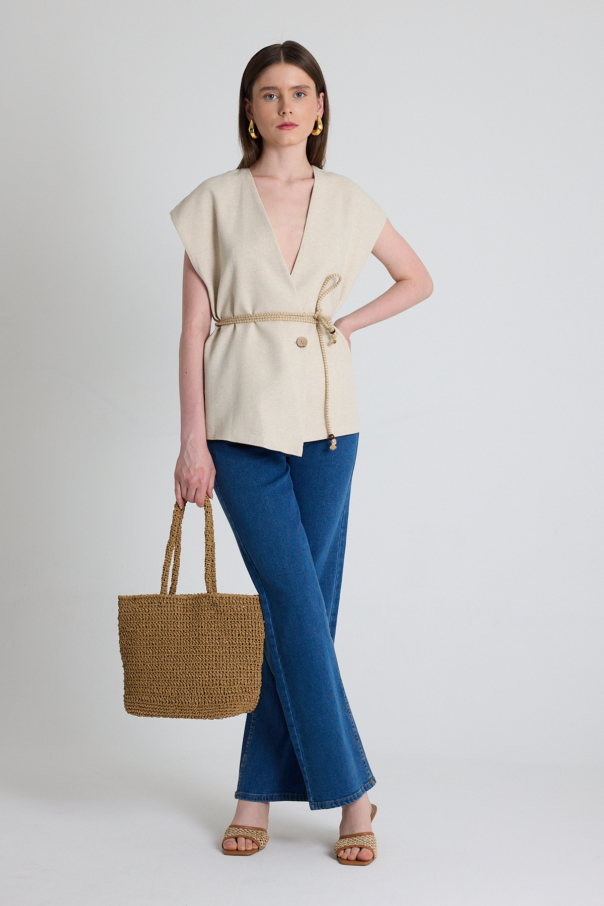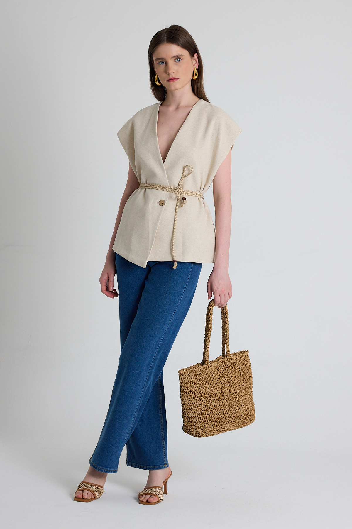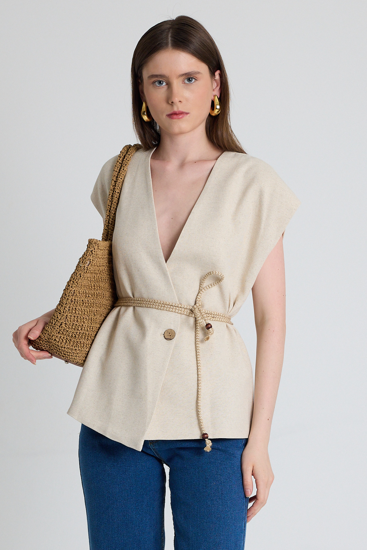 Natural Hasır Kemerli V Yaka Kısa Kollu Ceket Yelek 2378