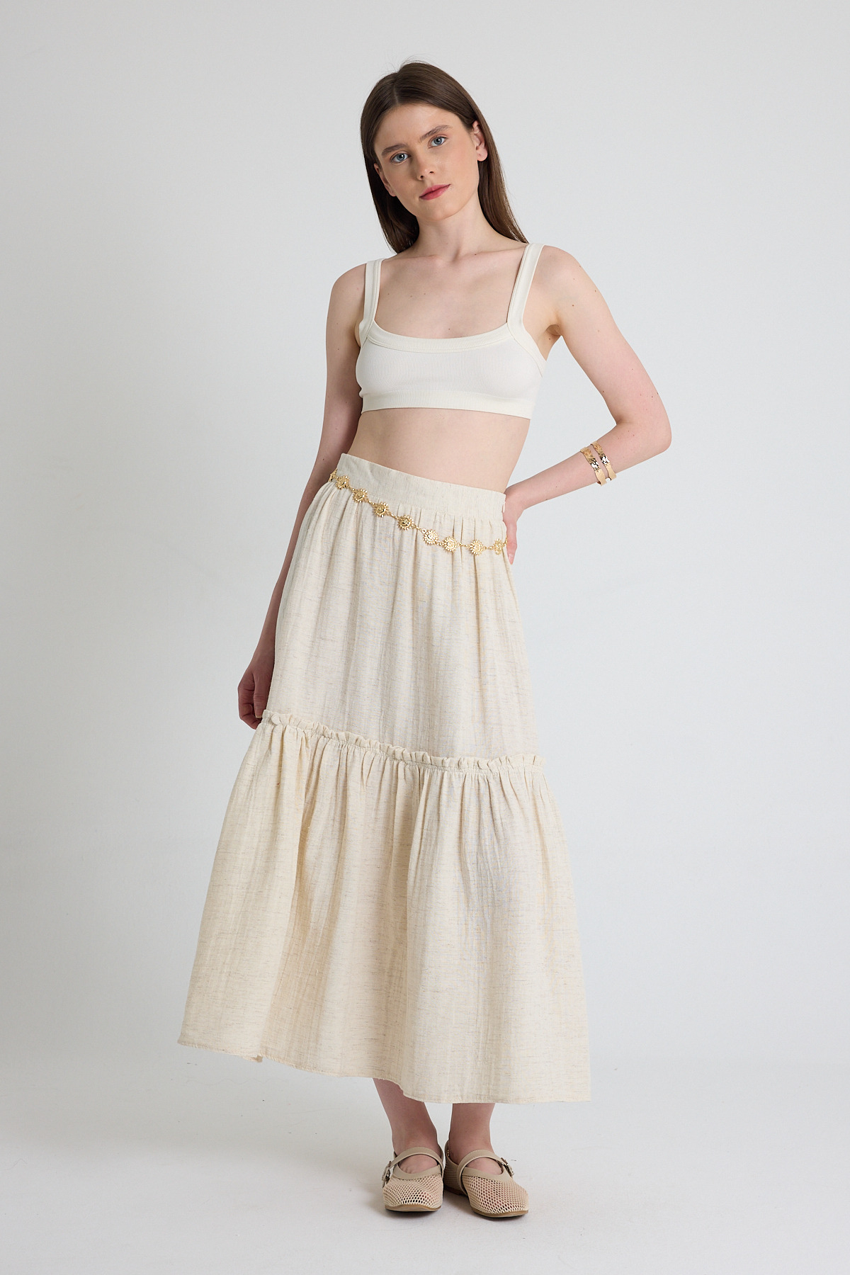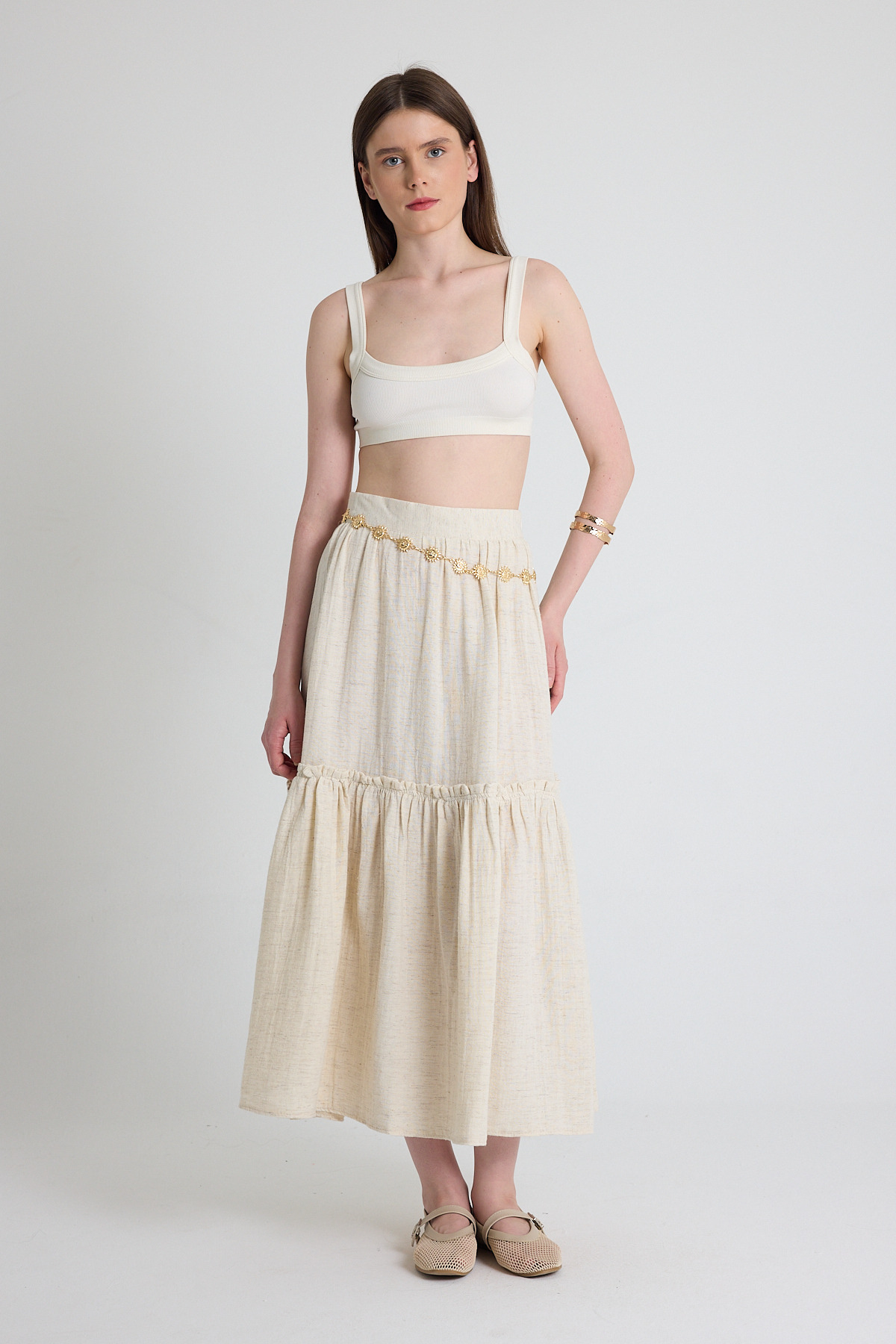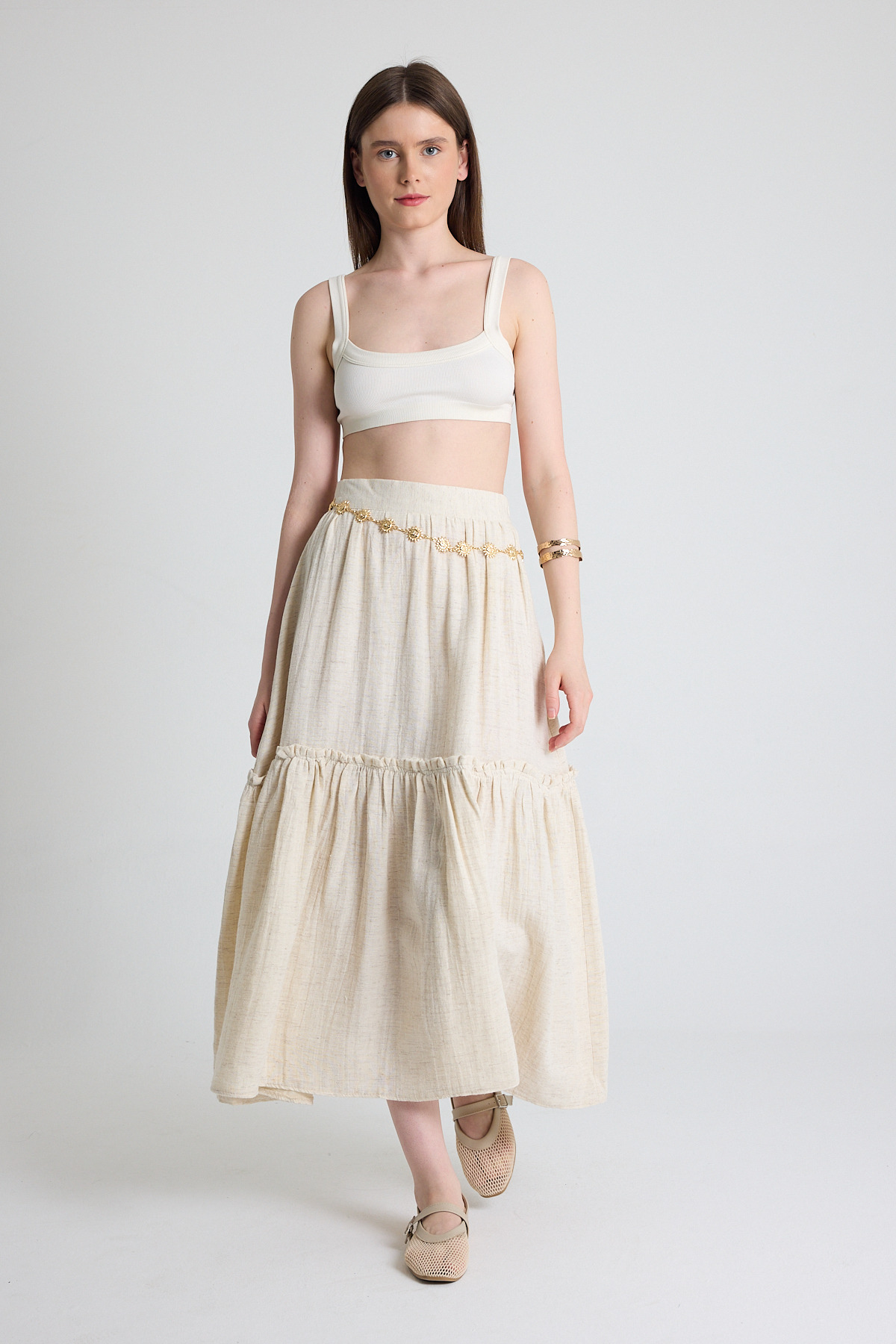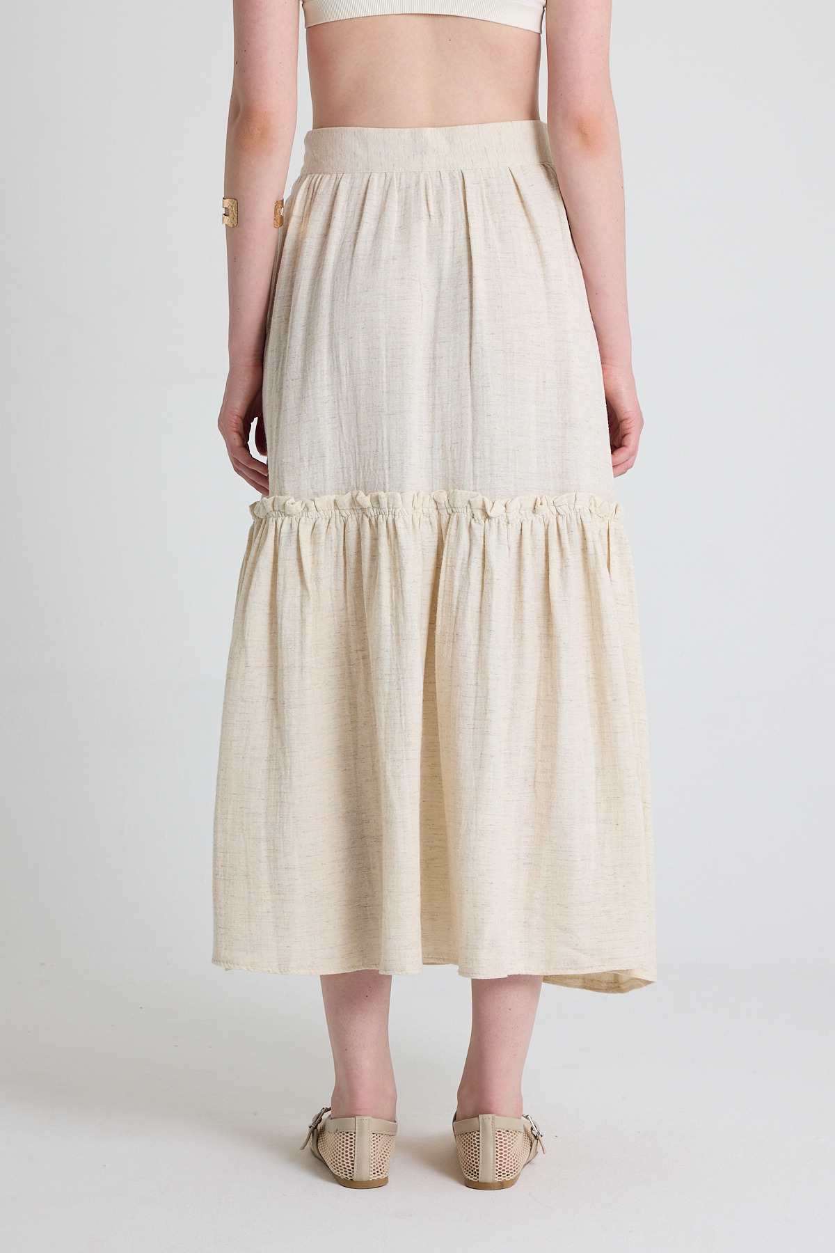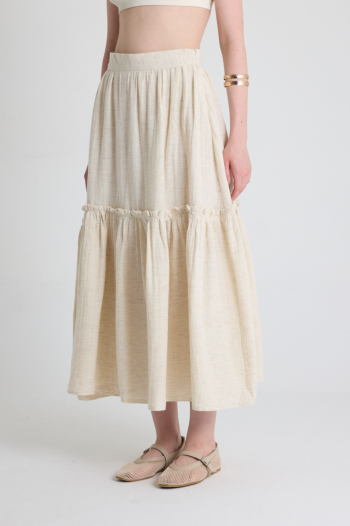 Natural Keten Görünümlü %100 Pamuk Kat Detaylı Fırfırlı Etek 4711A