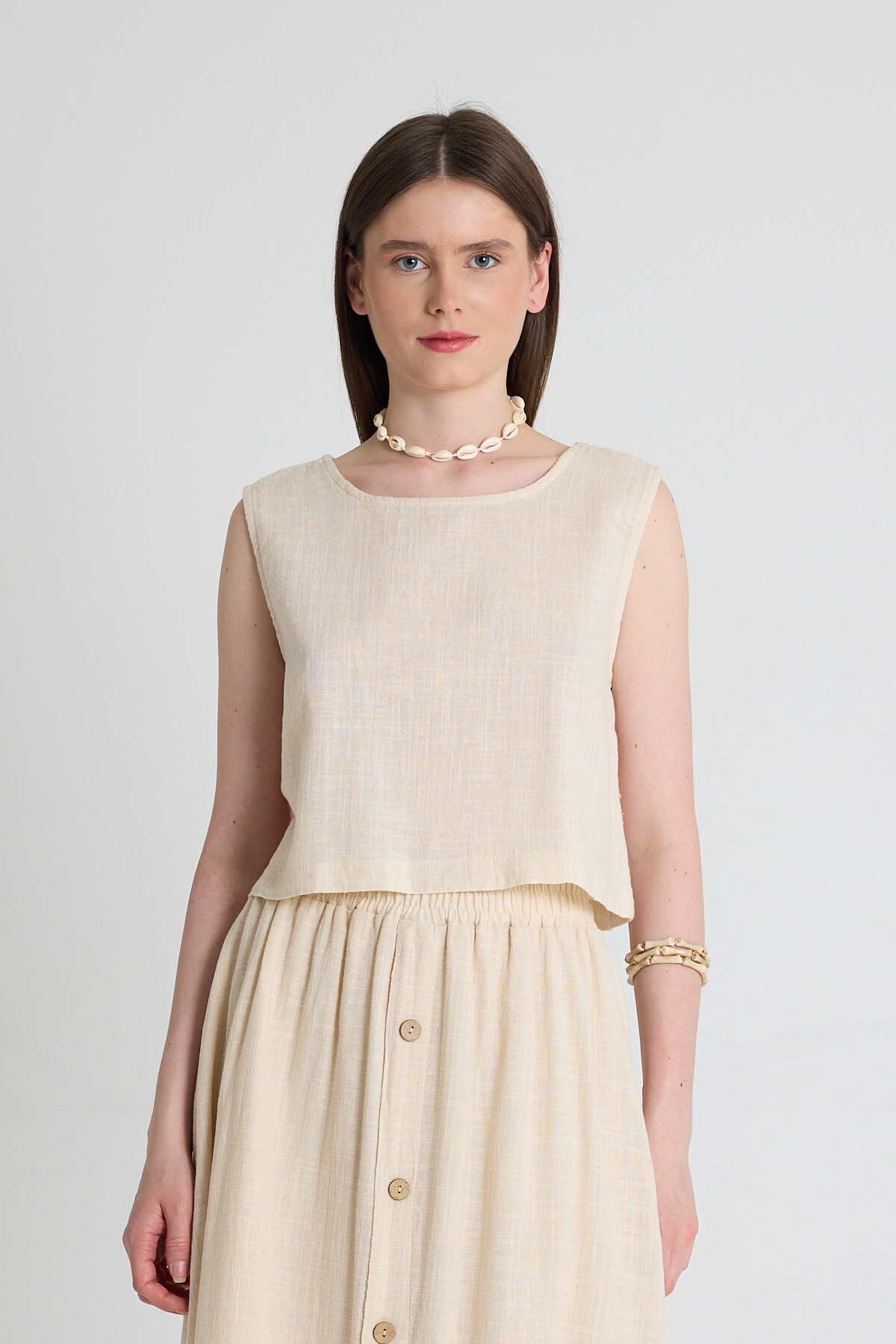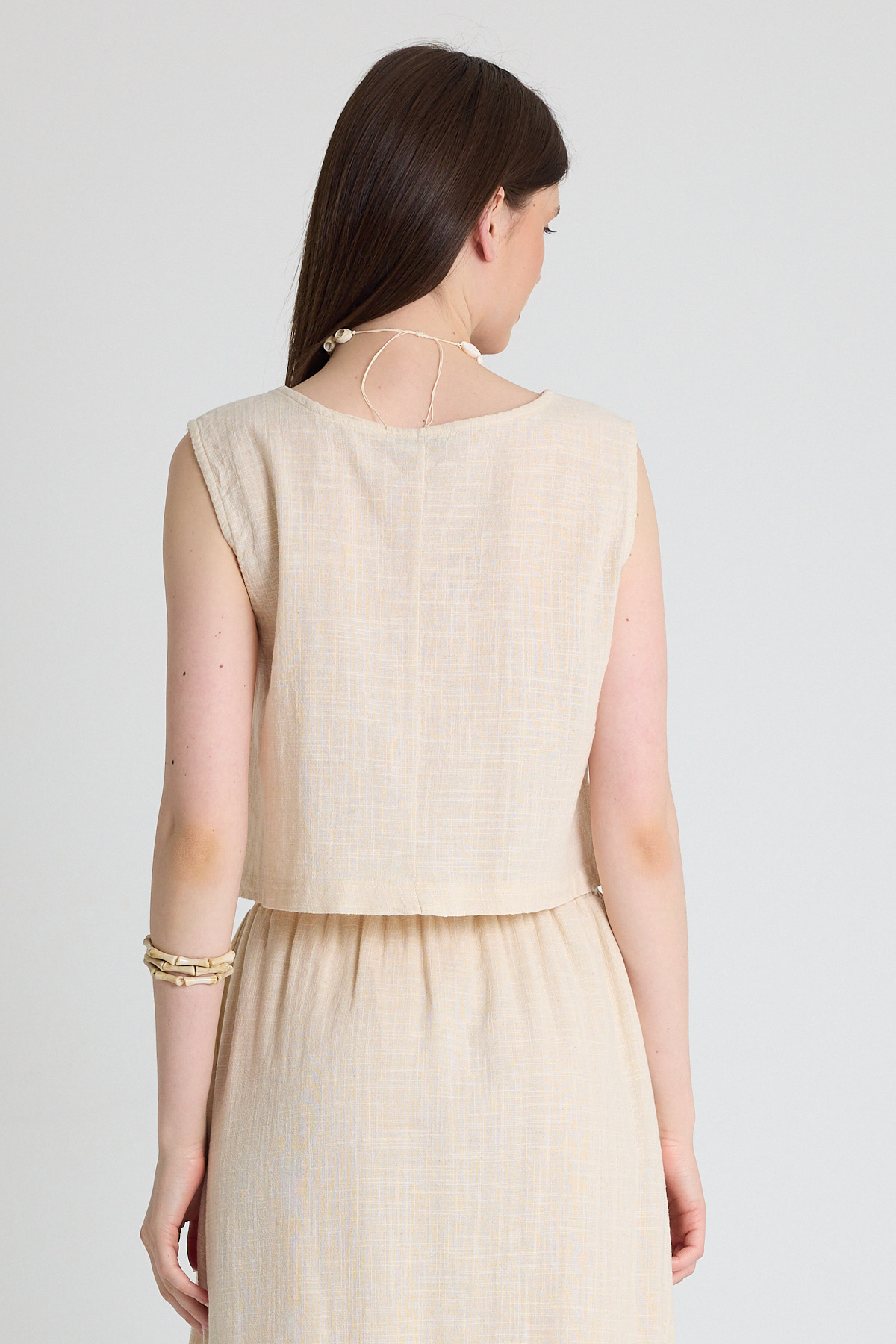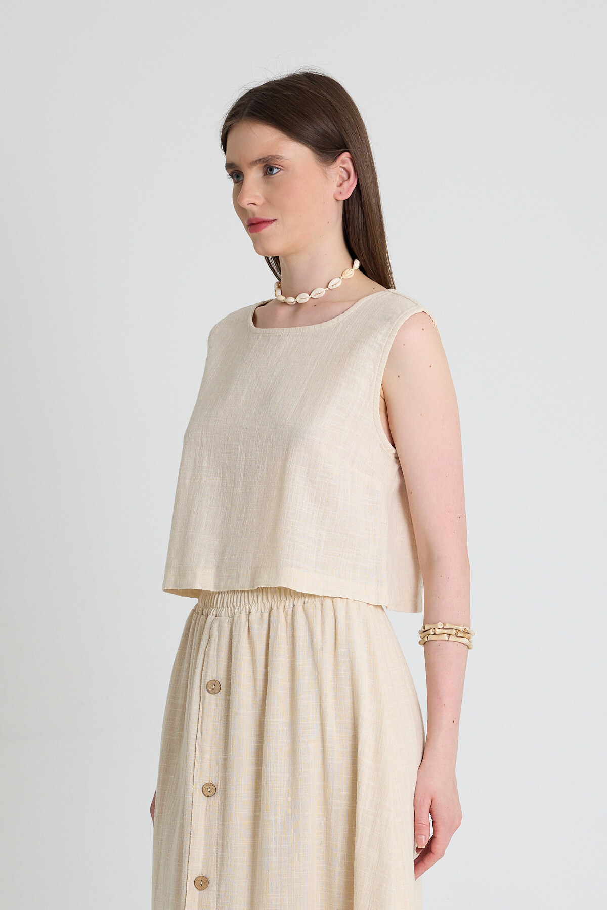 Natural Keten Görünümlü %100 Pamuk Kolsuz Crop Bluz 3419-1