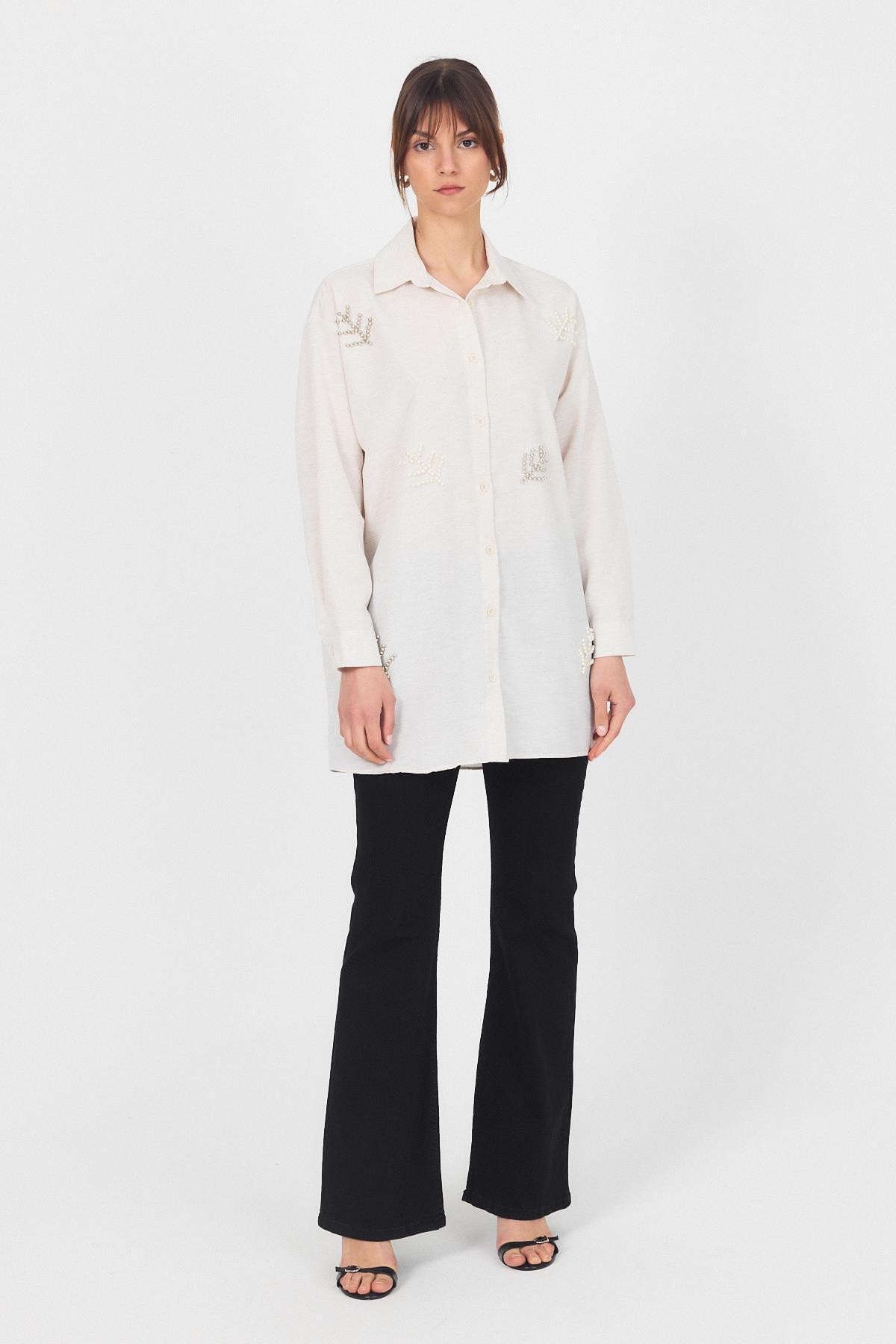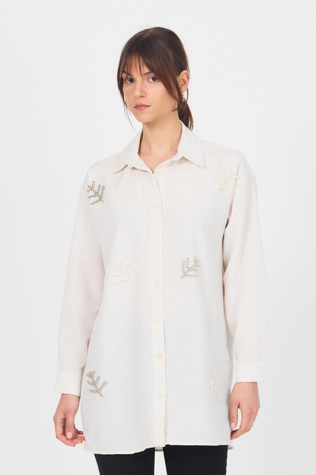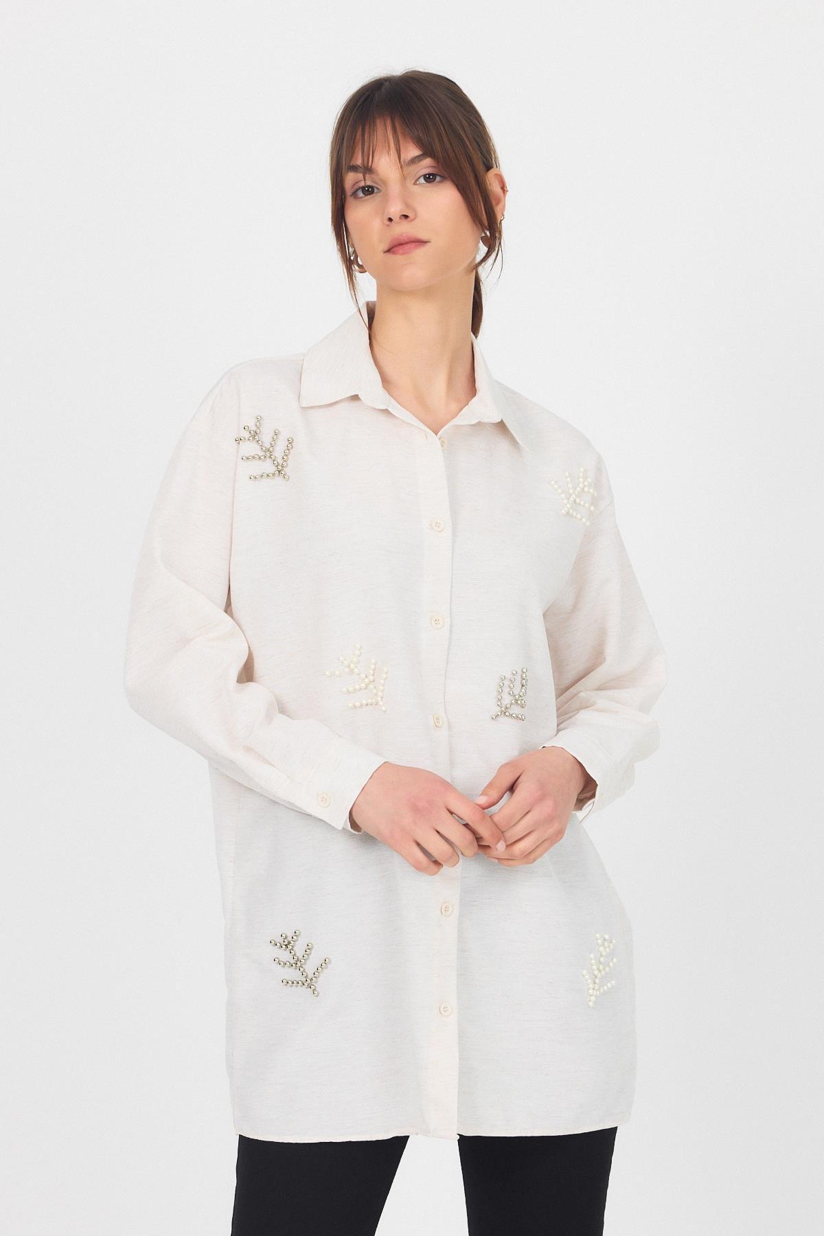 Natural Yaprak Desenli İncili Gömlek 4660A