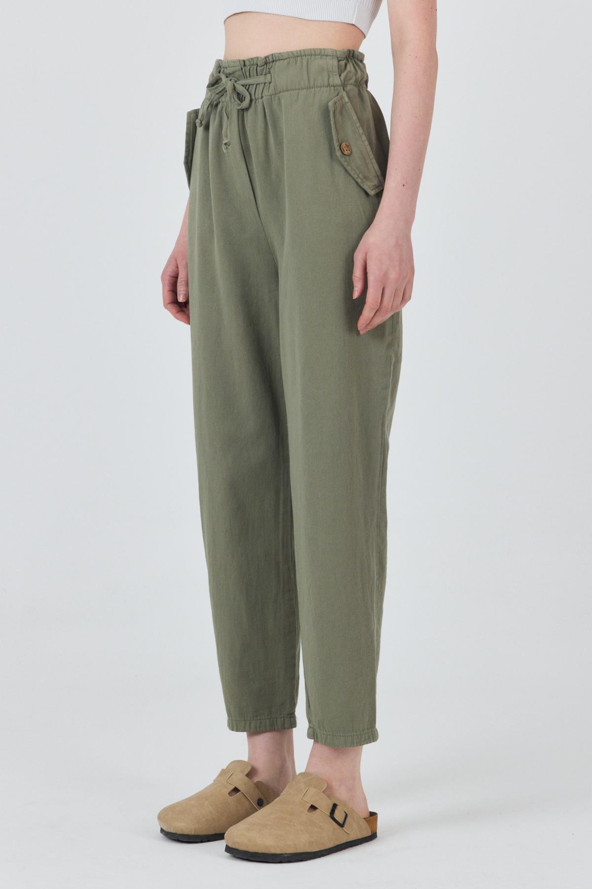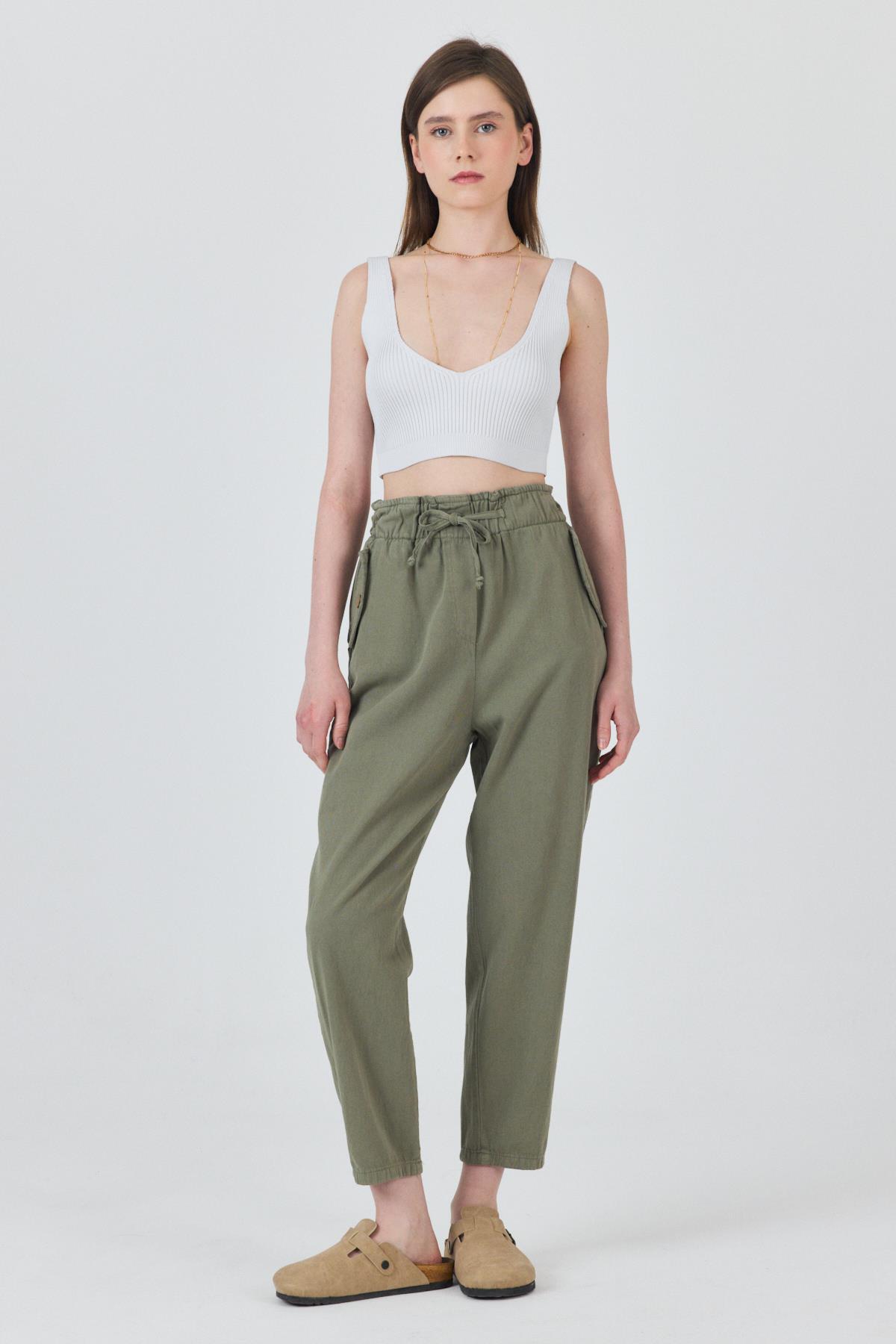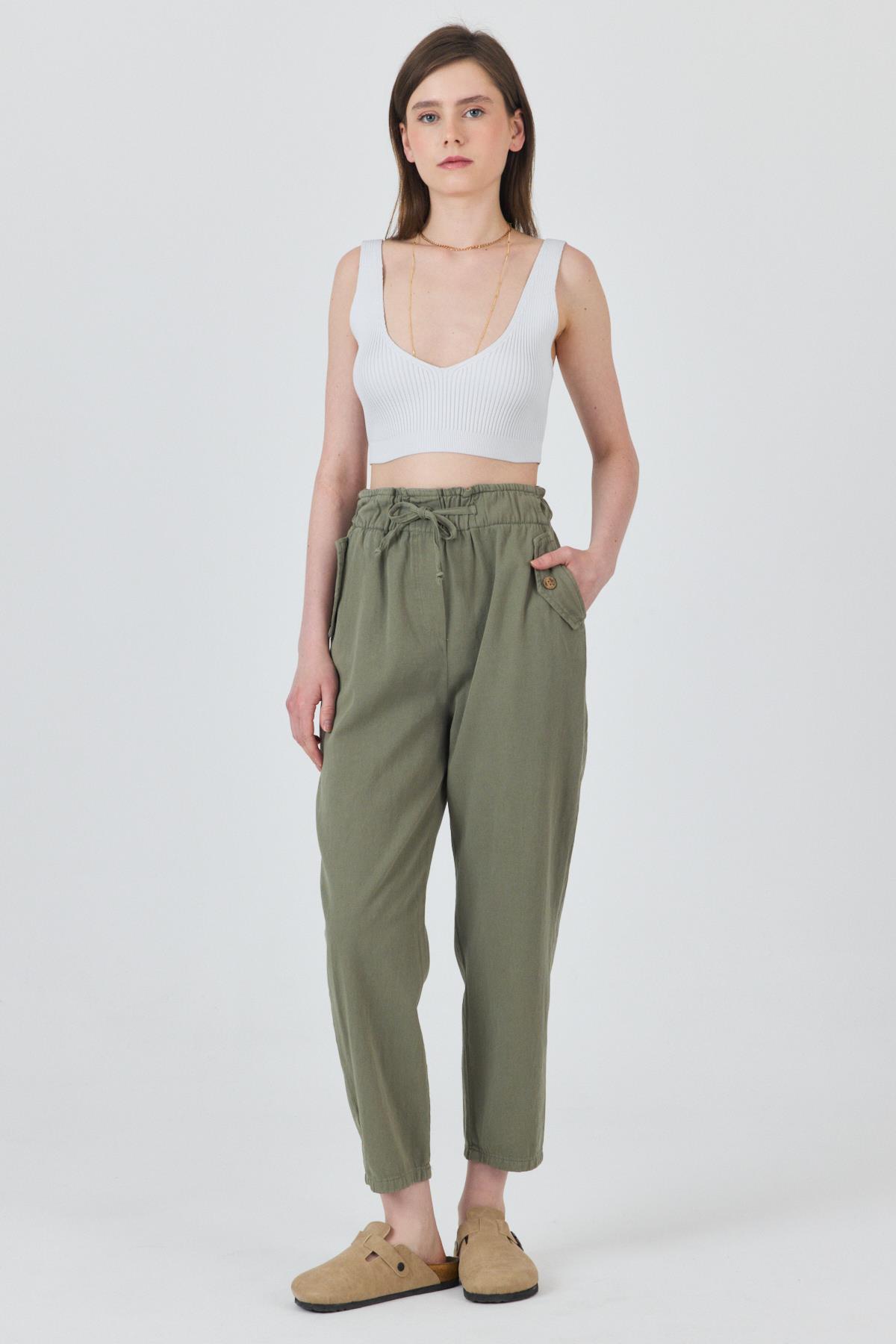 Olive Yeşili Cep Düğme Detaylı Bel Lastikli Pantolon 006