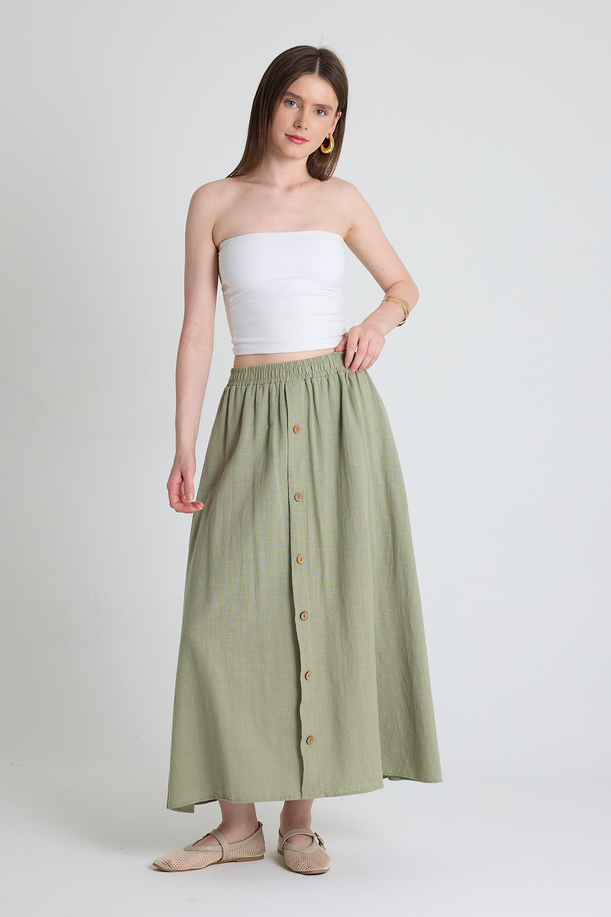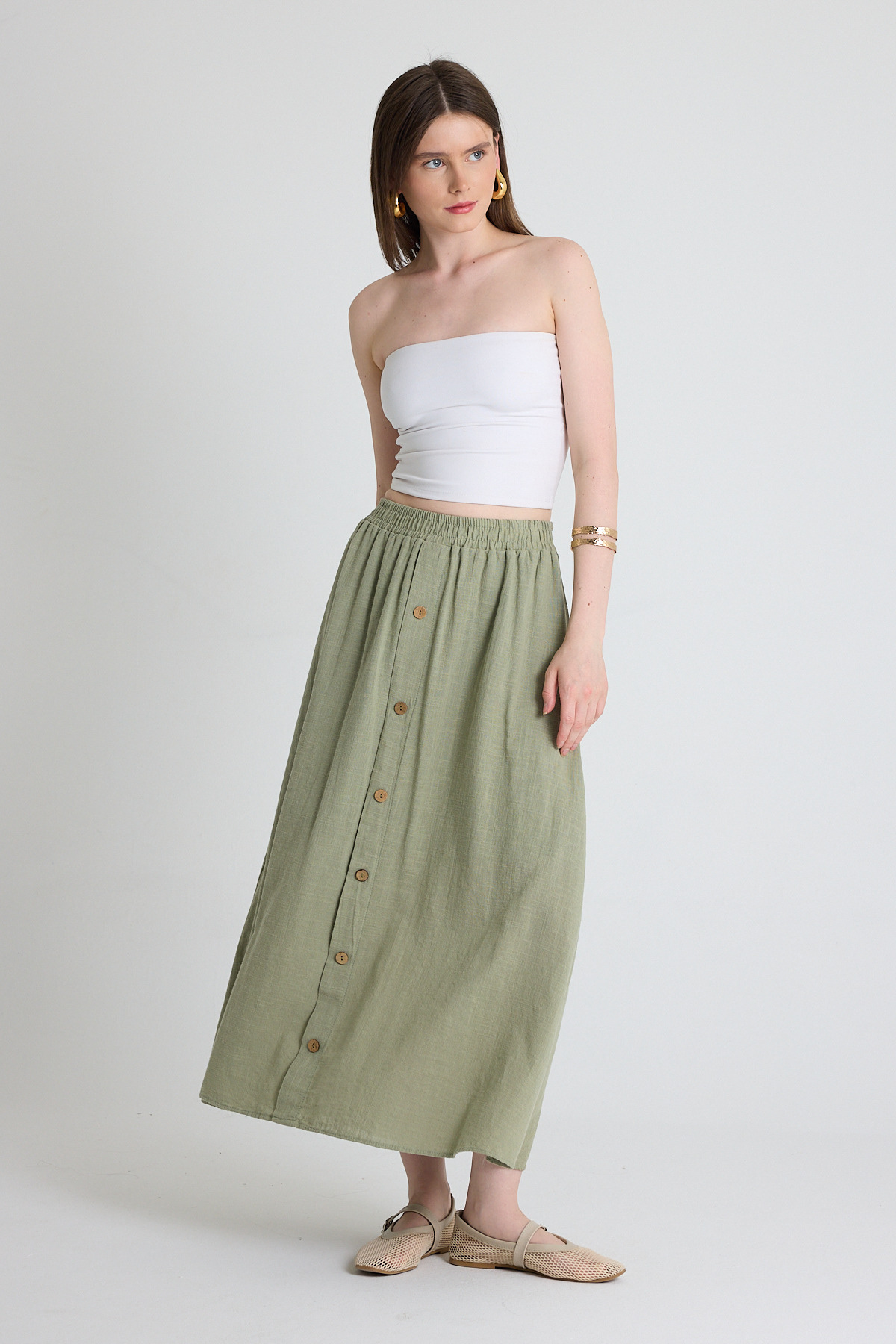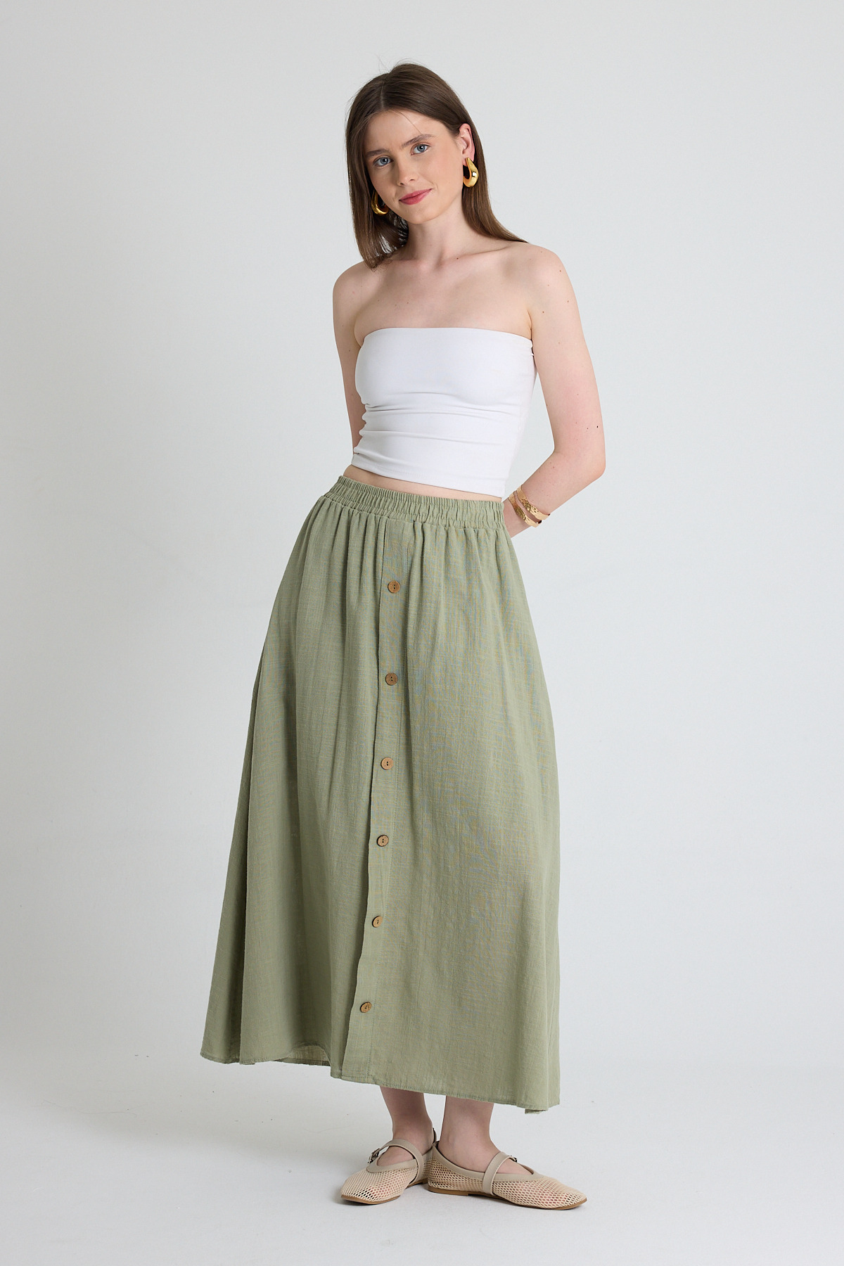 Olive Yeşili Keten Görünümlü %100 Pamuk Düğmeli Midi Etek 3419