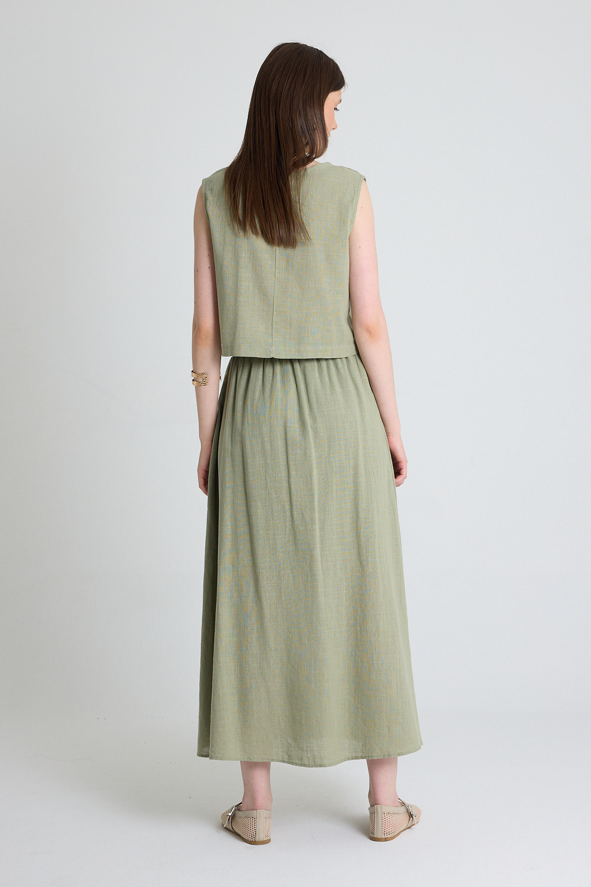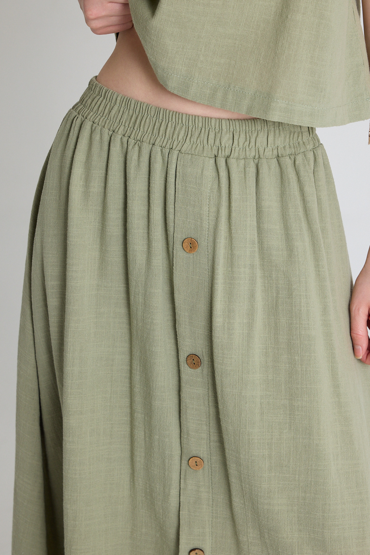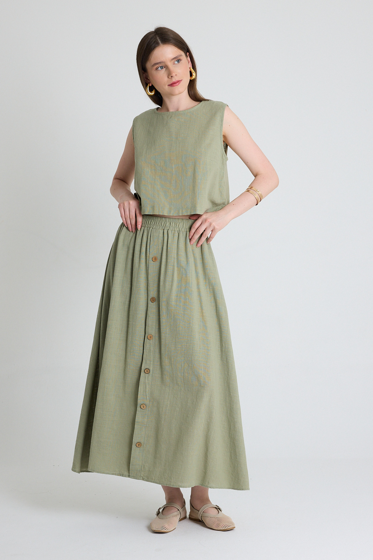 Olive Yeşili Keten Görünümlü %100 Pamuk Düğmeli Midi Etek 3419