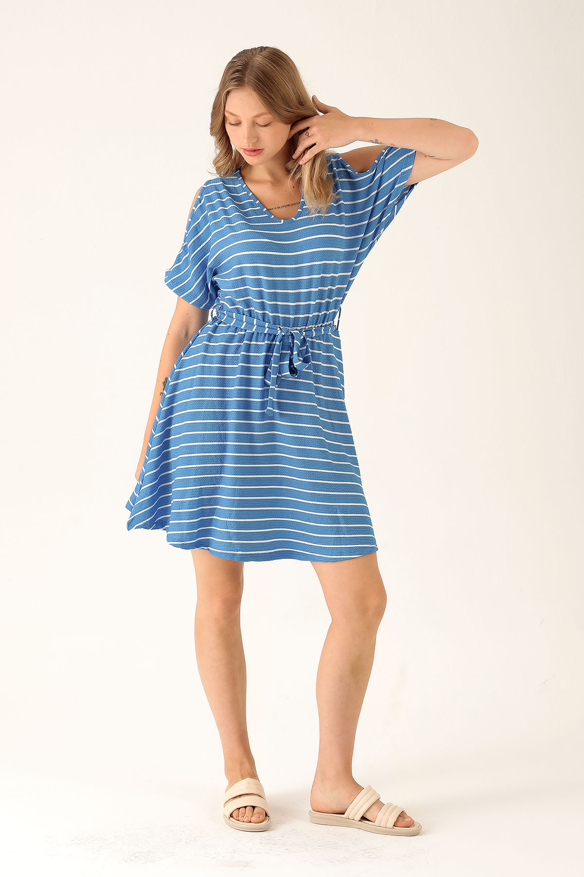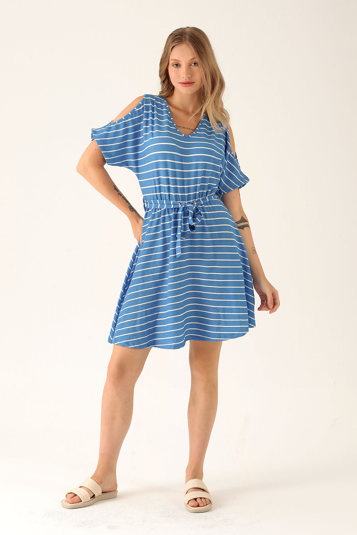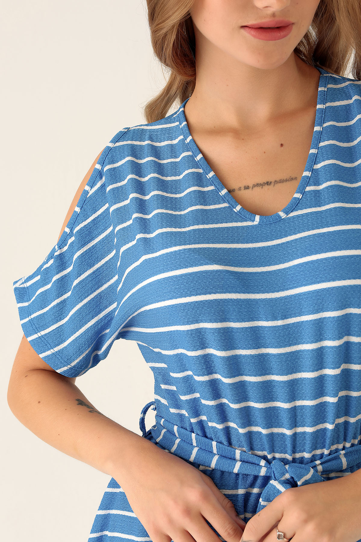 Omuz Dekolte Detay Elbise - 10613 Mavi