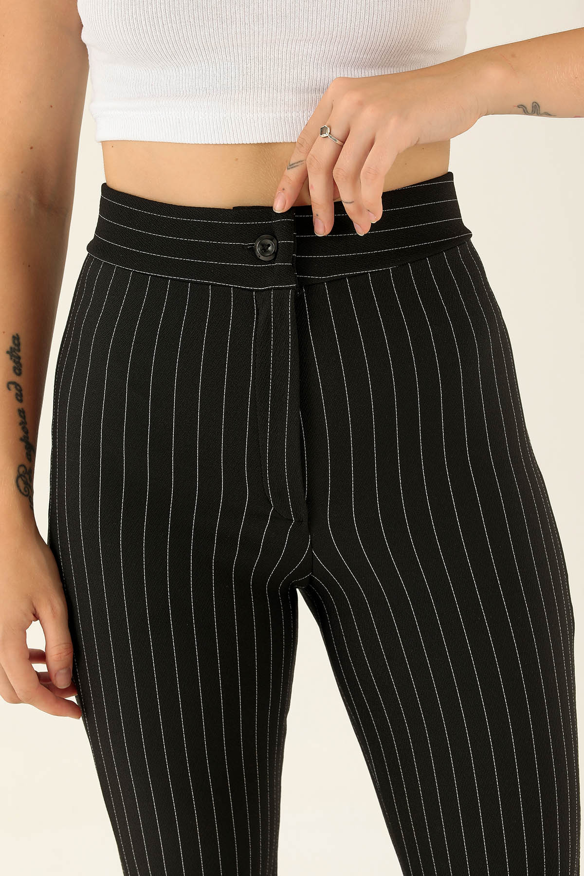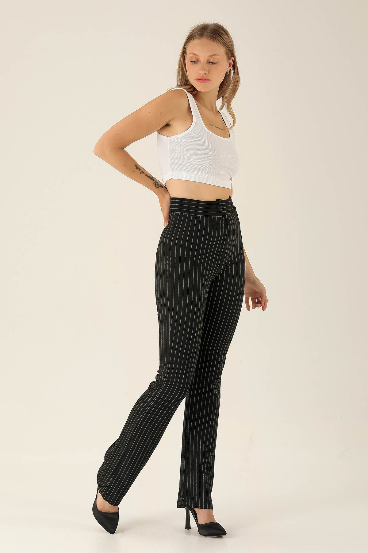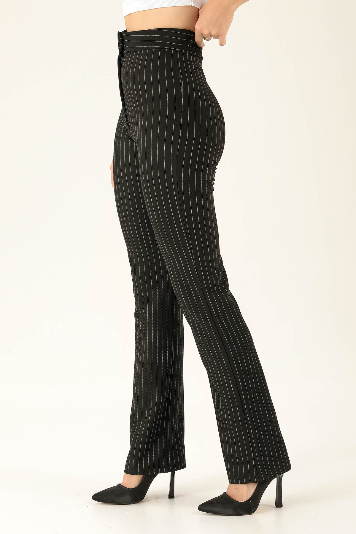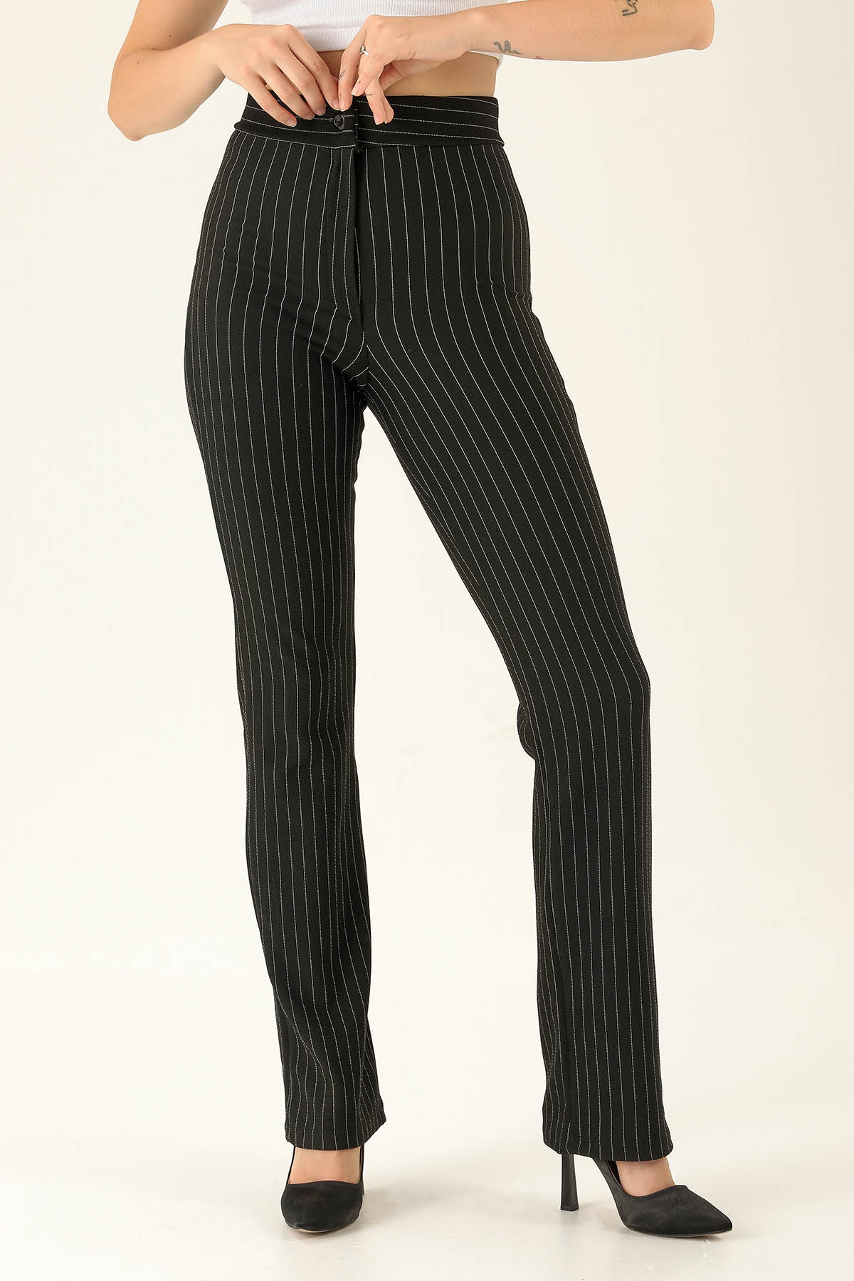 Ön Cima Detaylı Bayan Pantolon - 1240 Çizgili-Siyah