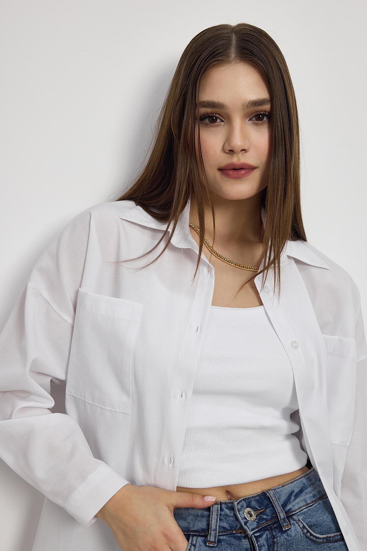 Beyaz Çift Cepli Oversize Uzun Basic Gömlek TCR 6256A