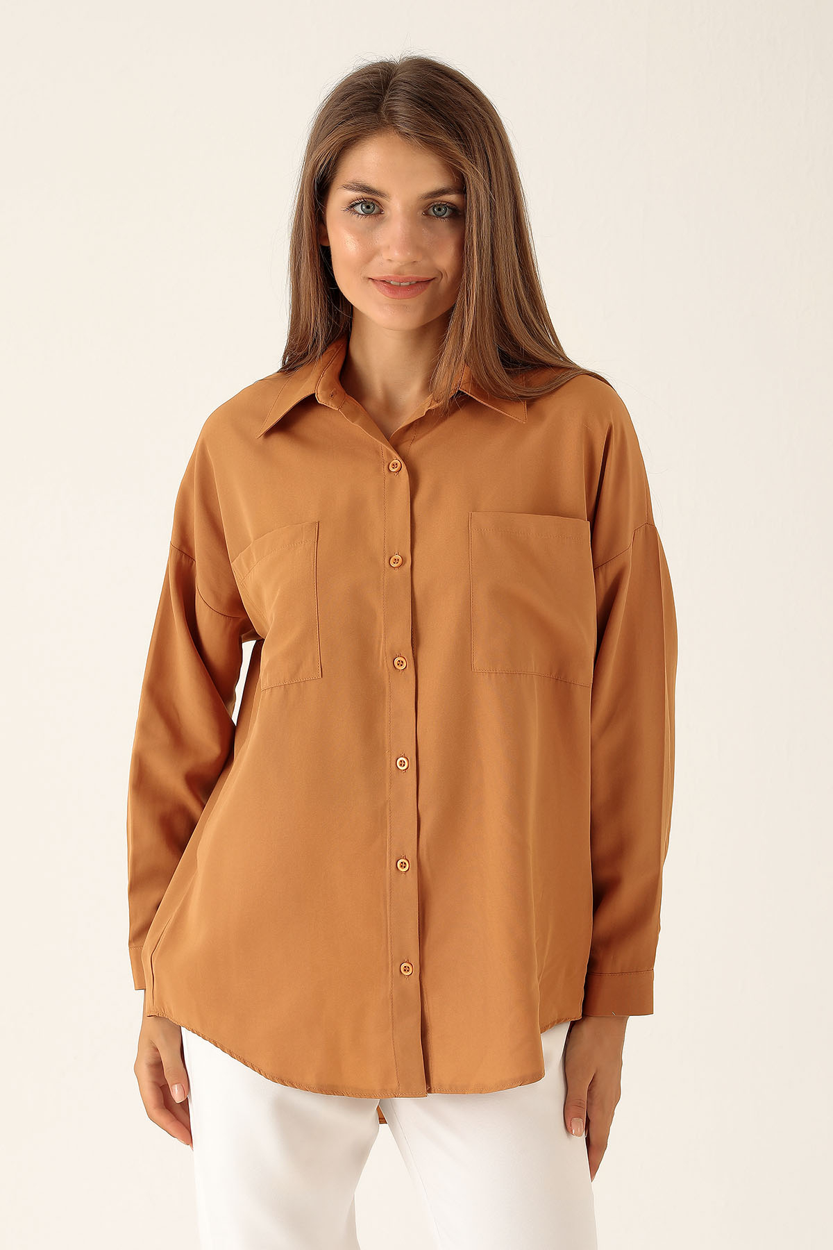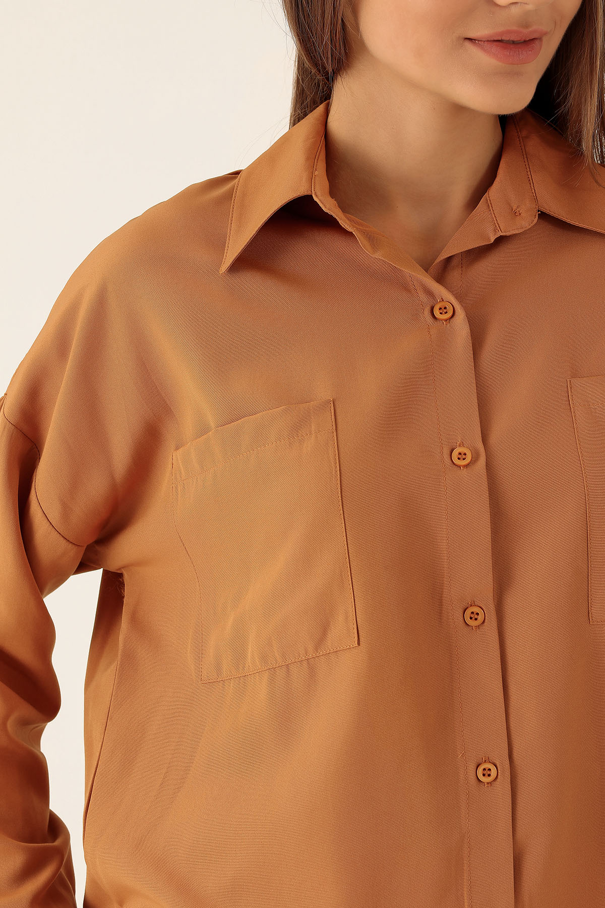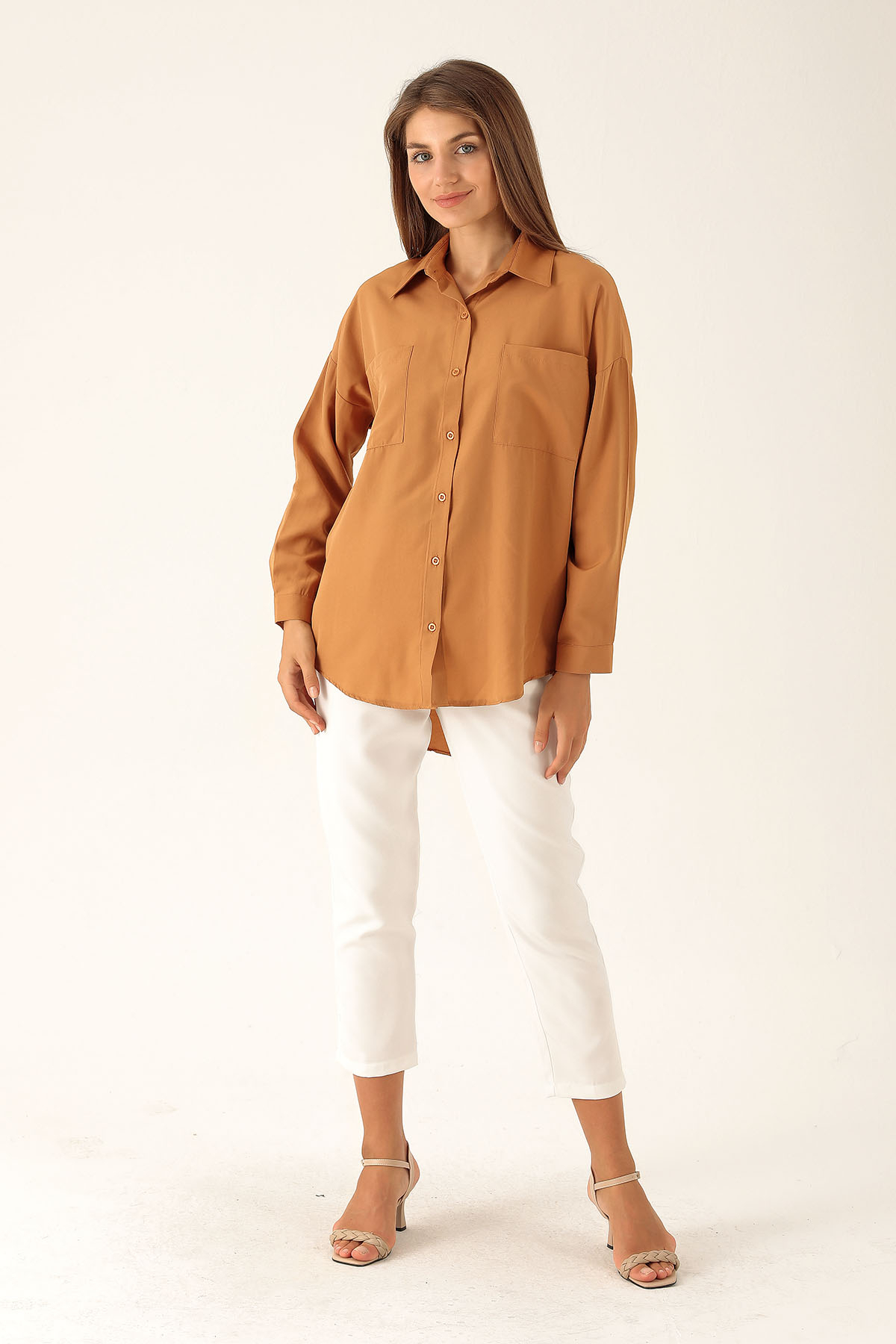 Bisküvi Çift Cepli Oversize Uzun Basic Gömlek TCR 6256A