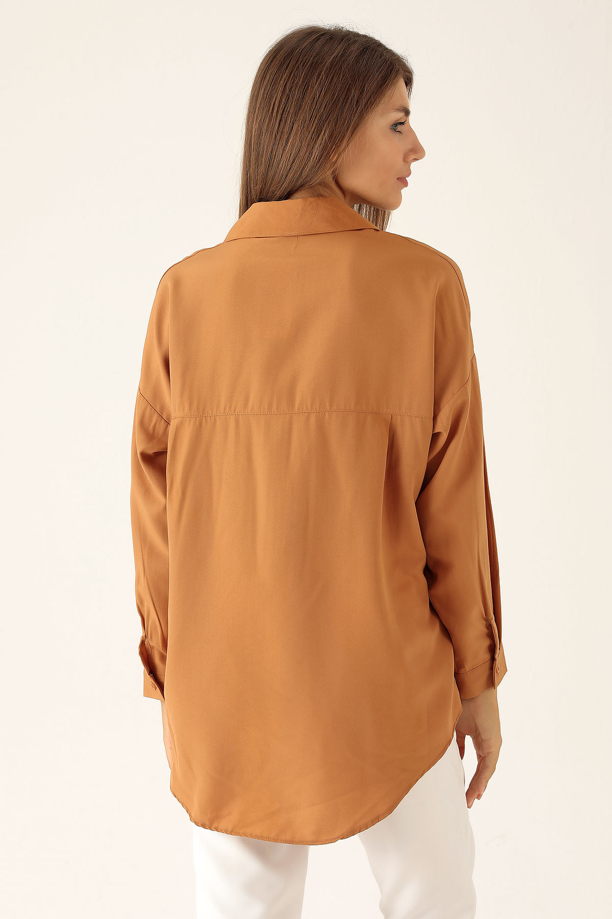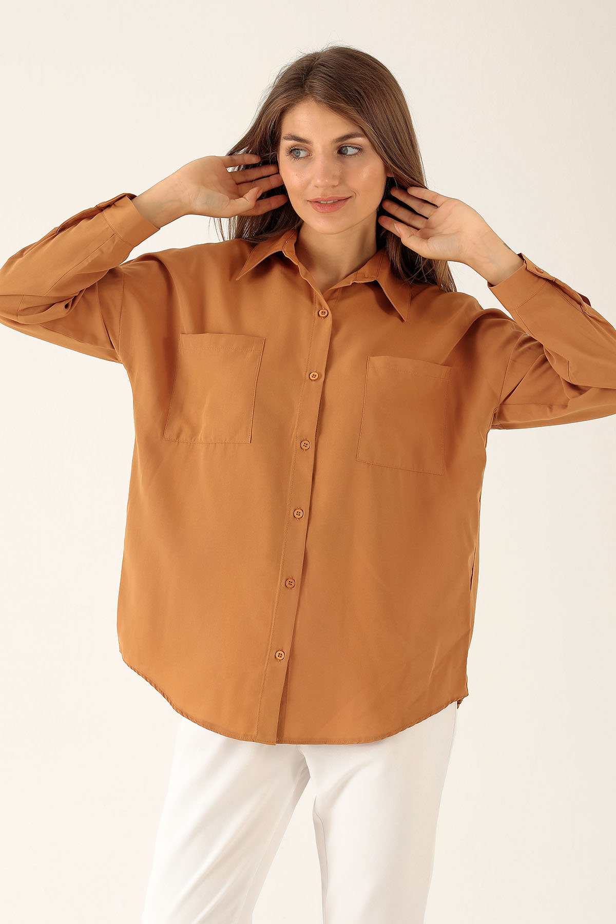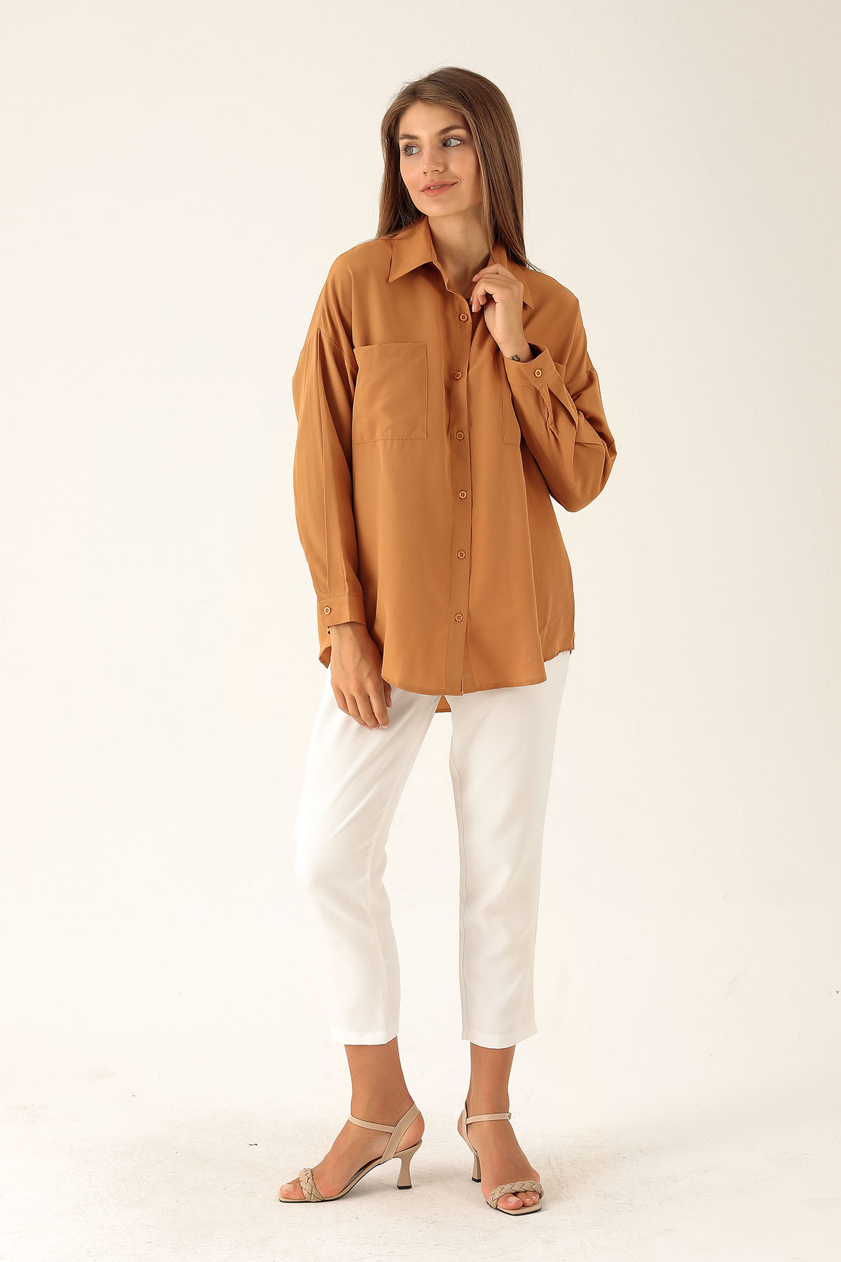 Bisküvi Çift Cepli Oversize Uzun Basic Gömlek TCR 6256A