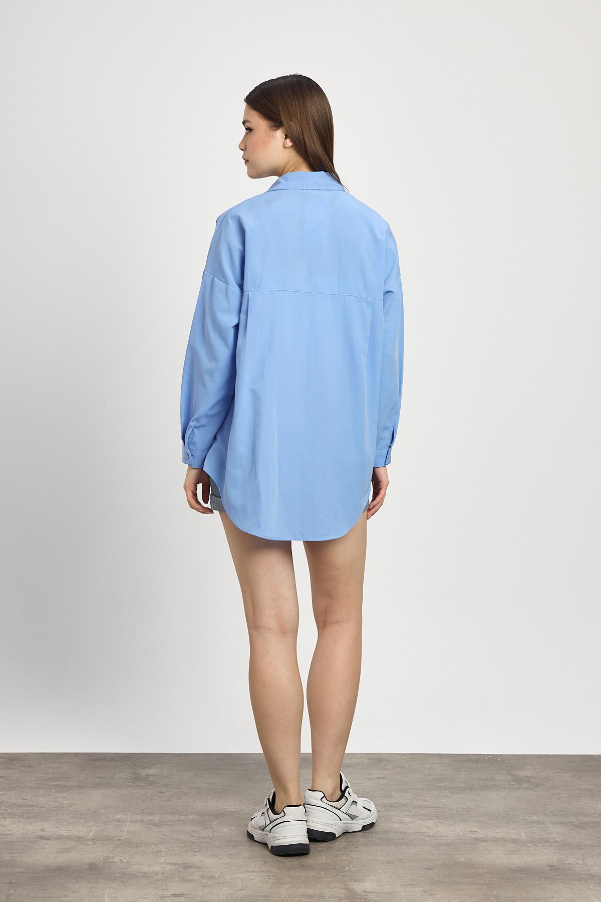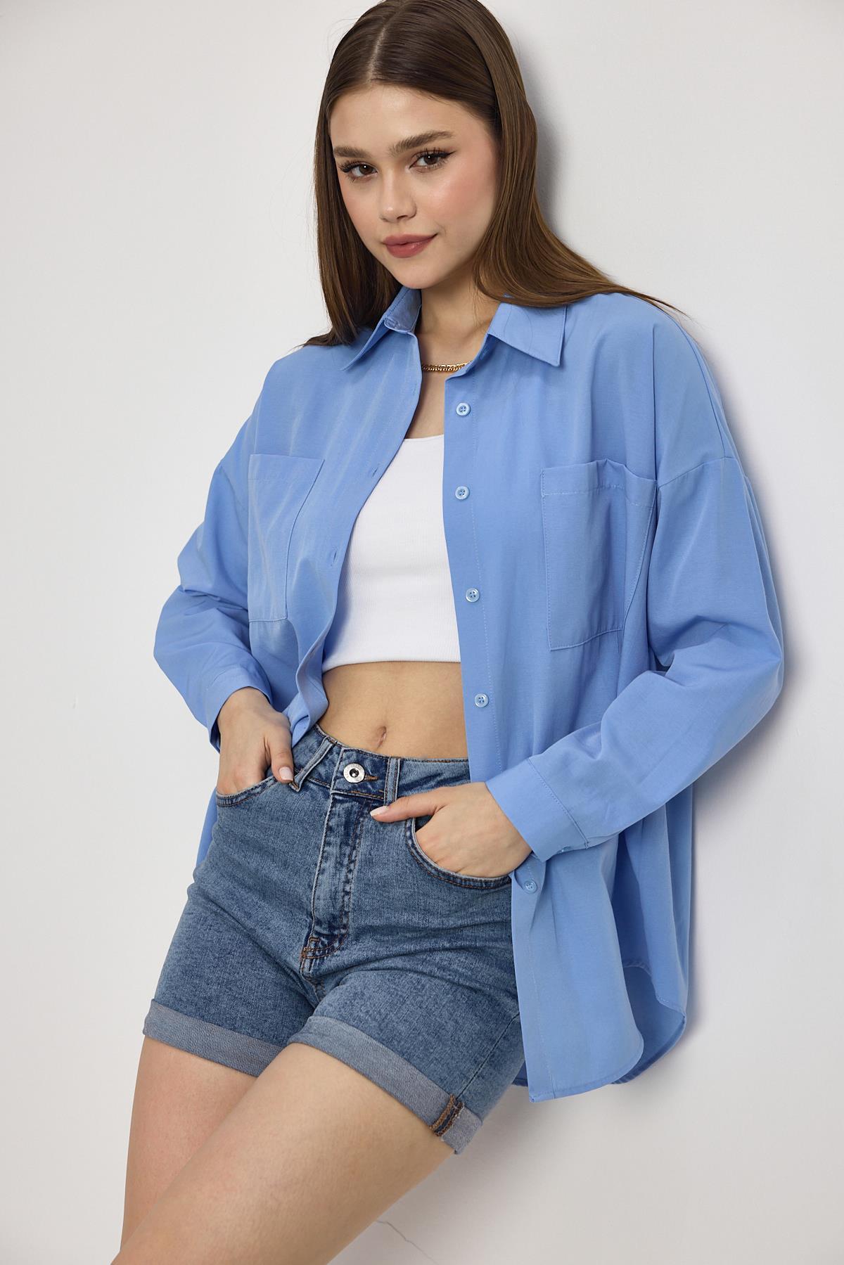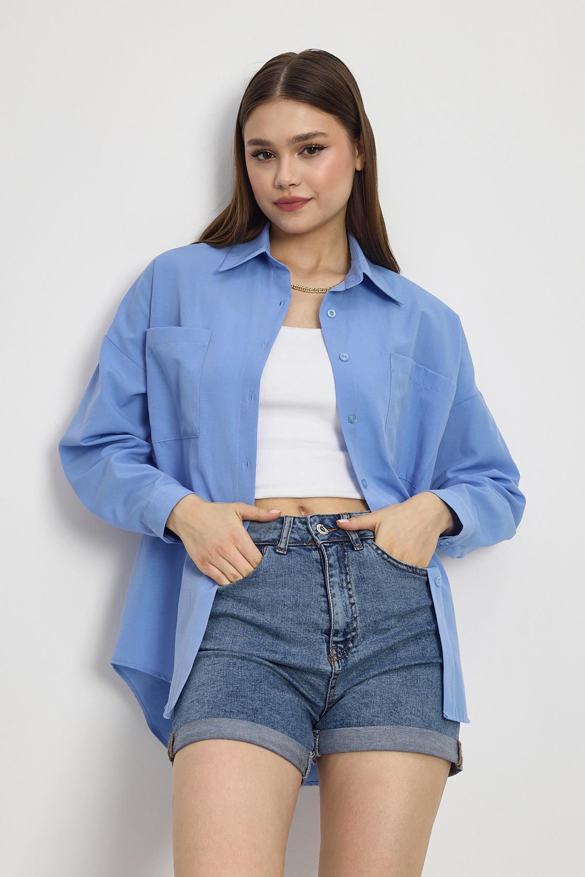 Mavi Çift Cepli Oversize Uzun Basic Gömlek TCR 6256A