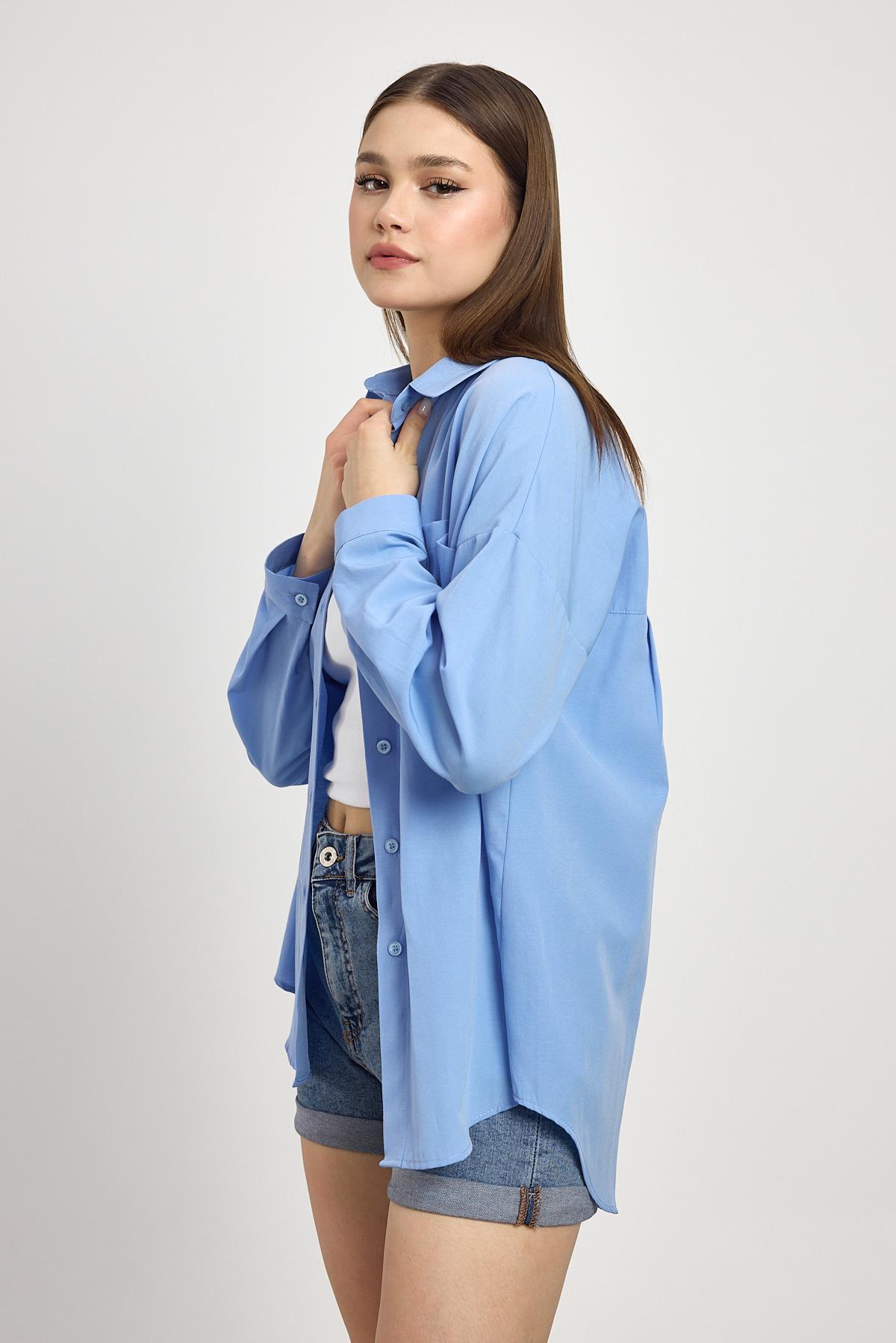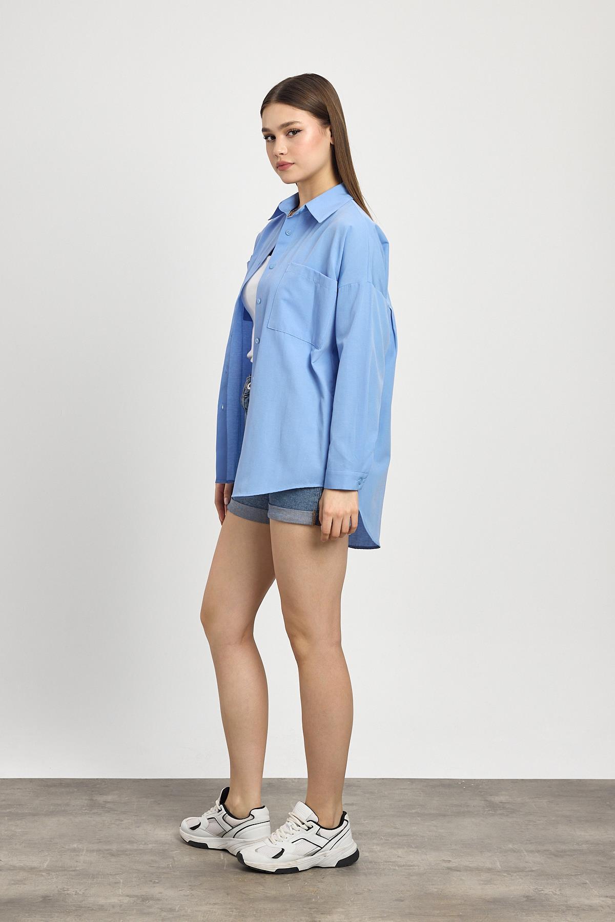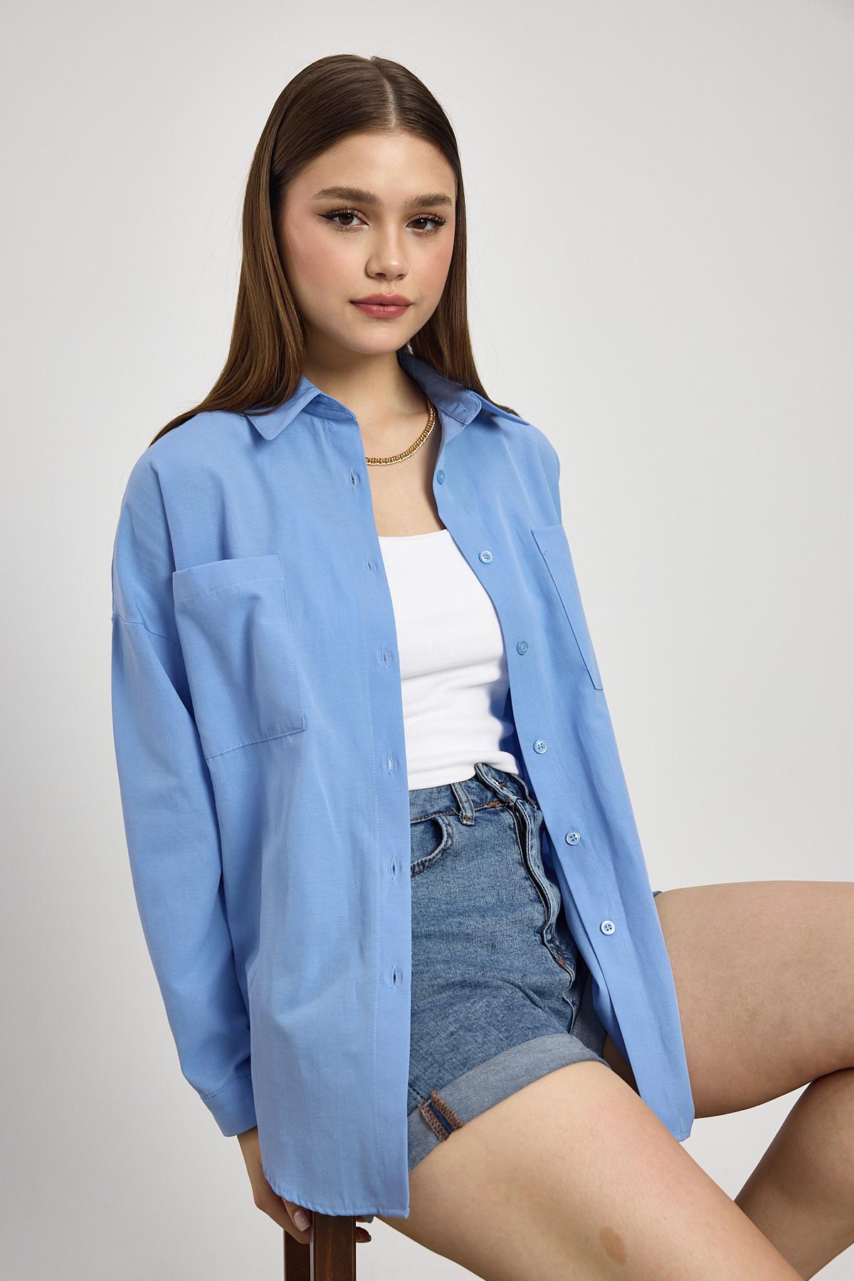Mavi Çift Cepli Oversize Uzun Basic Gömlek TCR 6256A