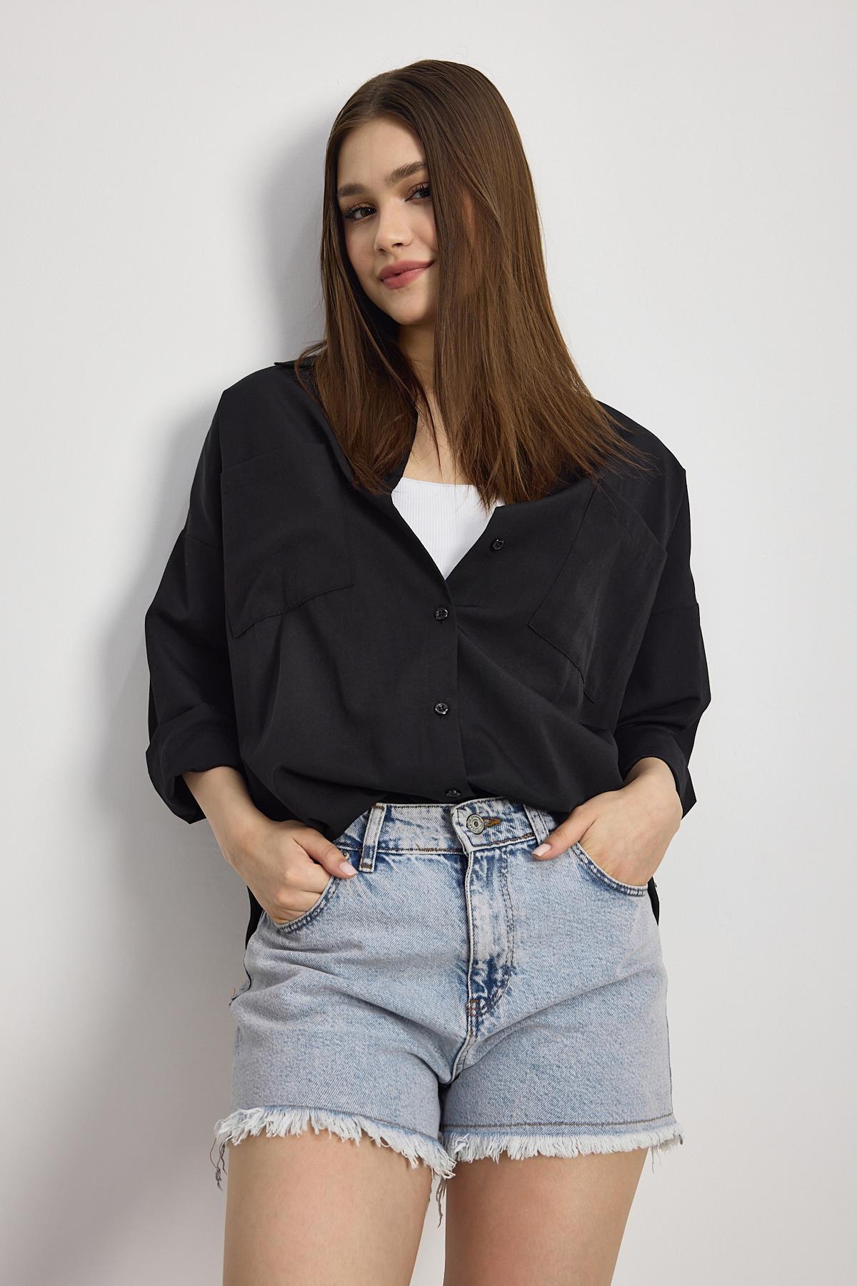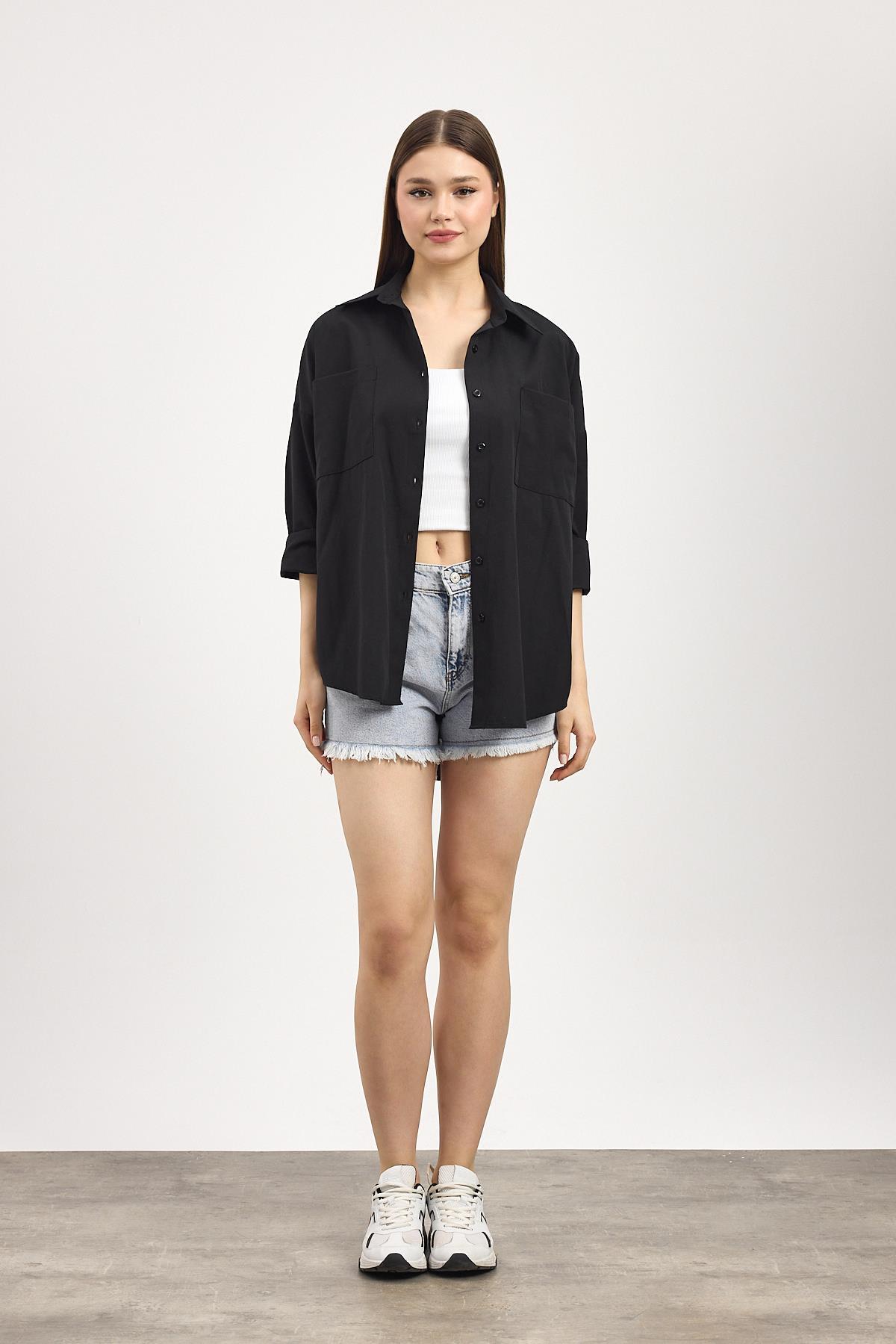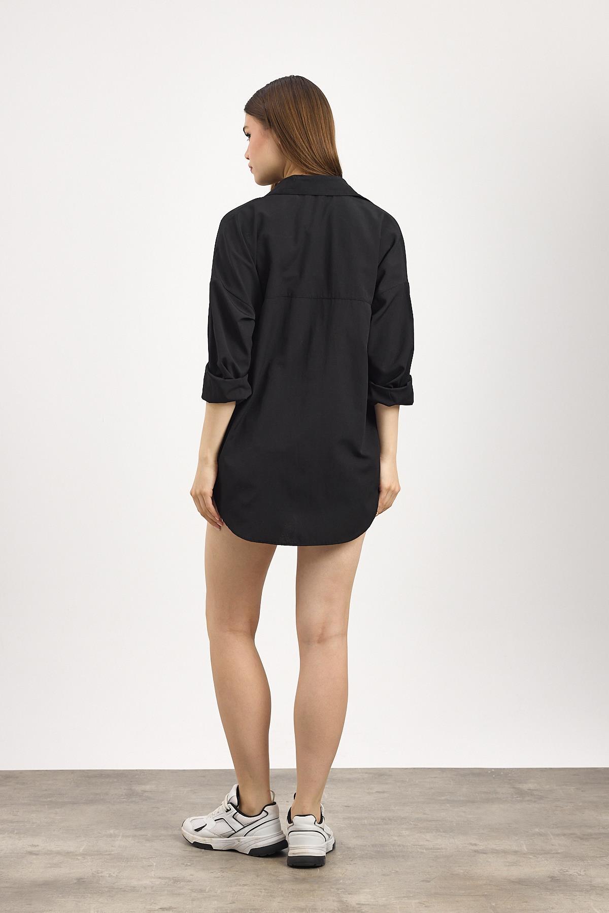 Siyah Çift Cepli Oversize Uzun Basic Gömlek TCR 6256A