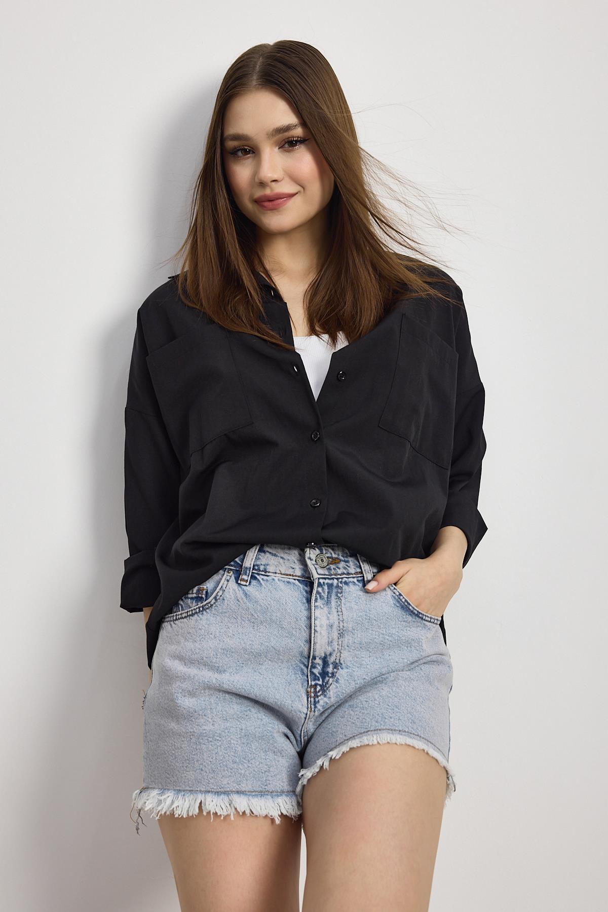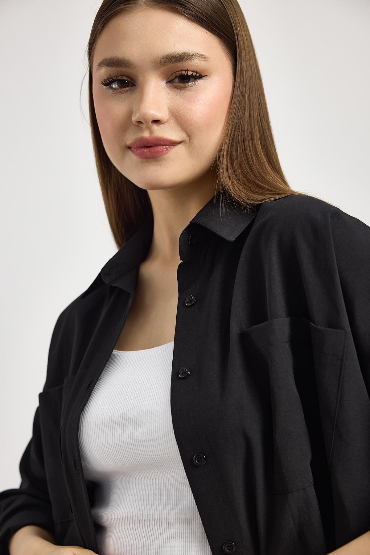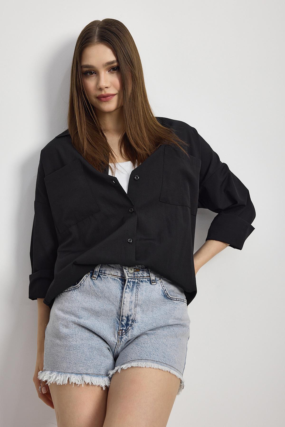 Siyah Çift Cepli Oversize Uzun Basic Gömlek TCR 6256A