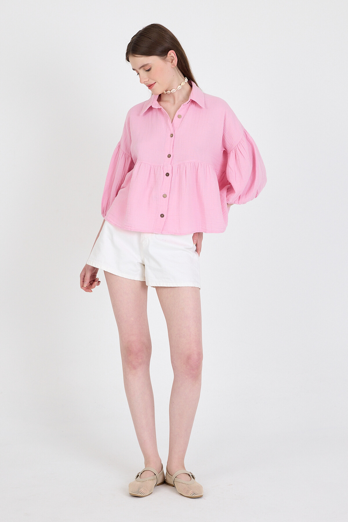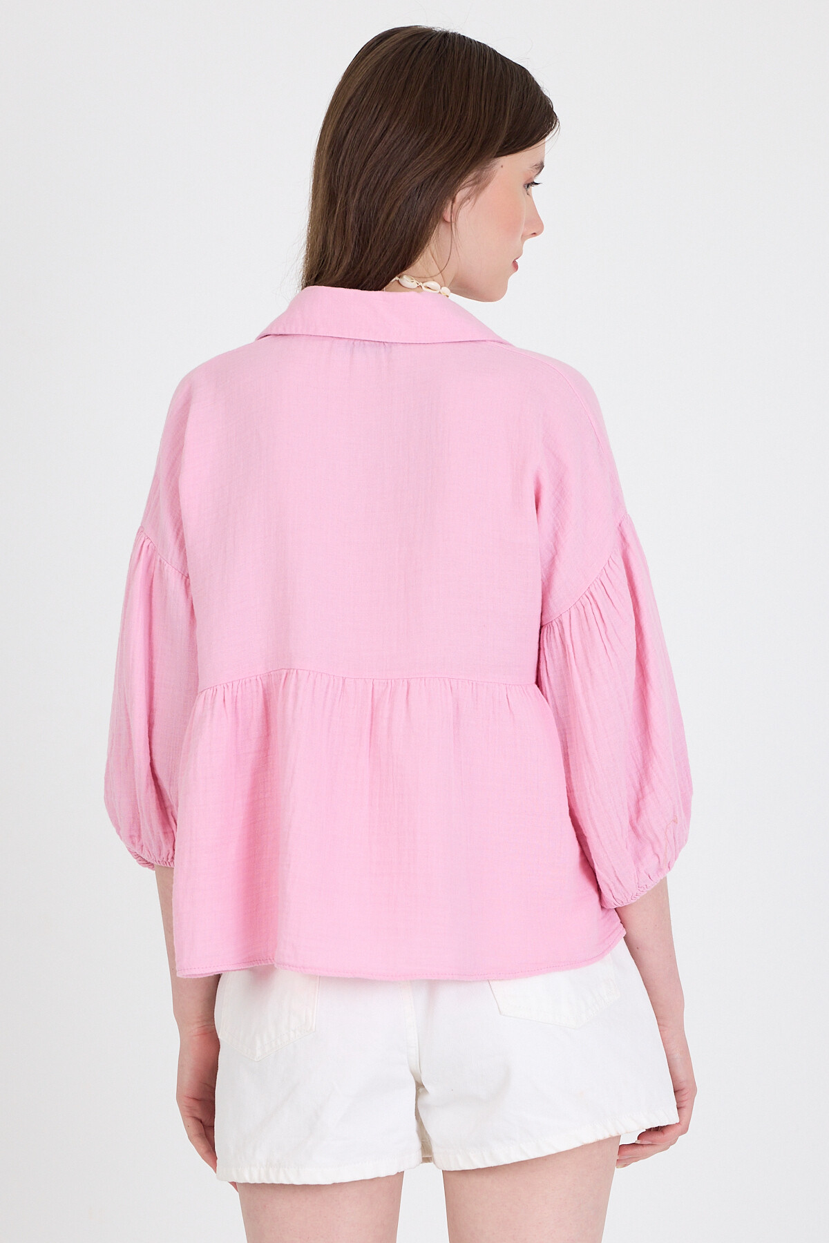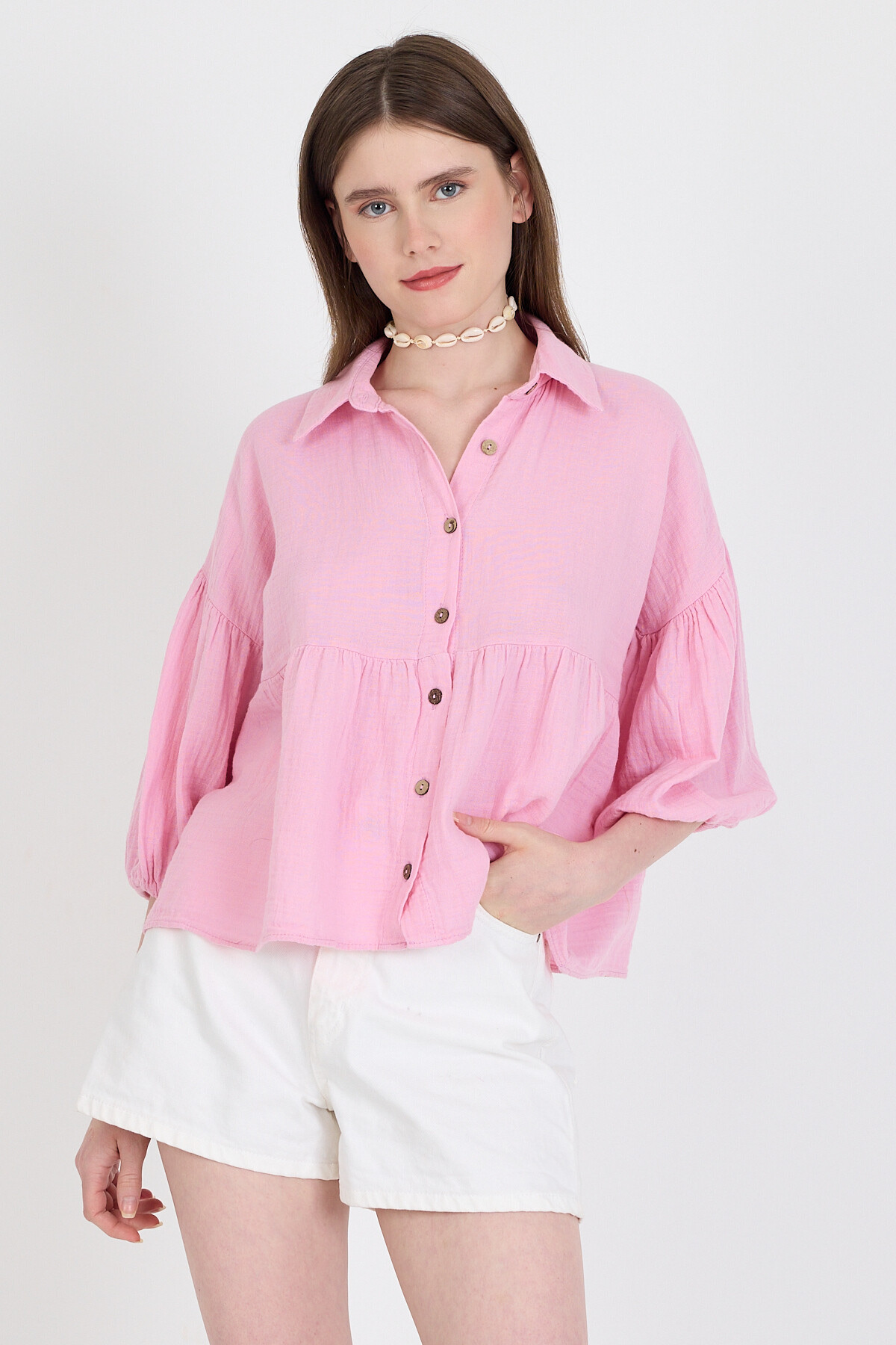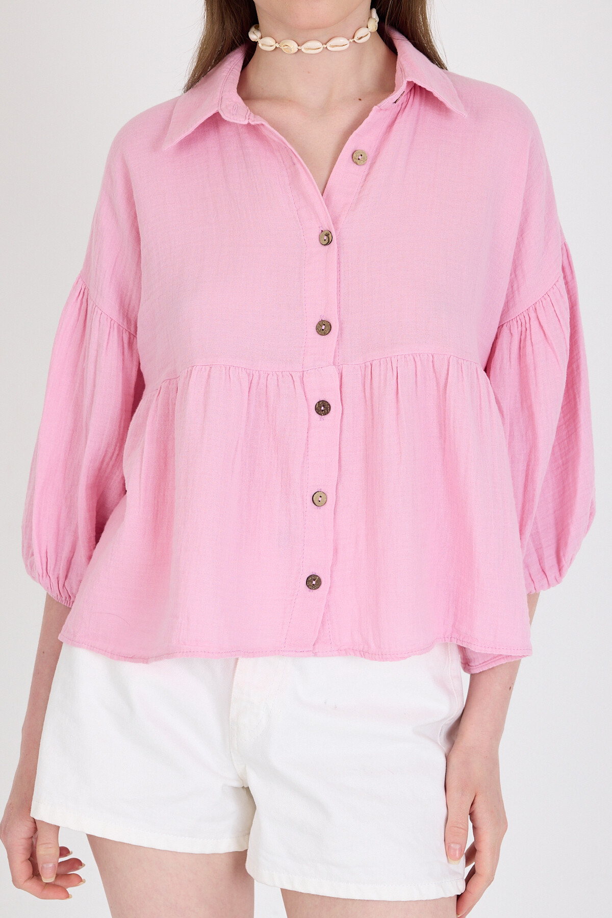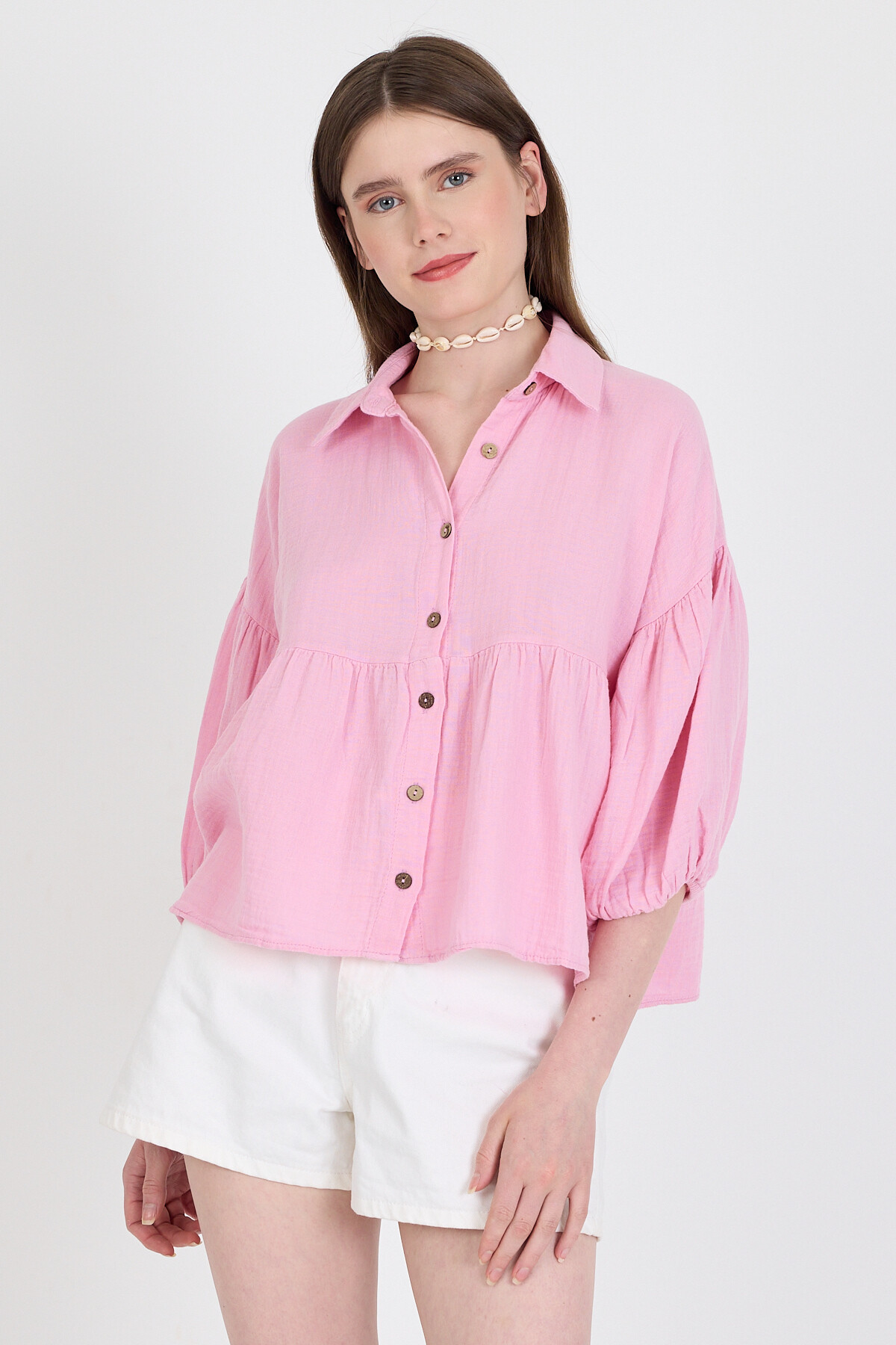 Pembe %100 Pamuk Keten Görünümlü Düğmeli Gömlek 4783A