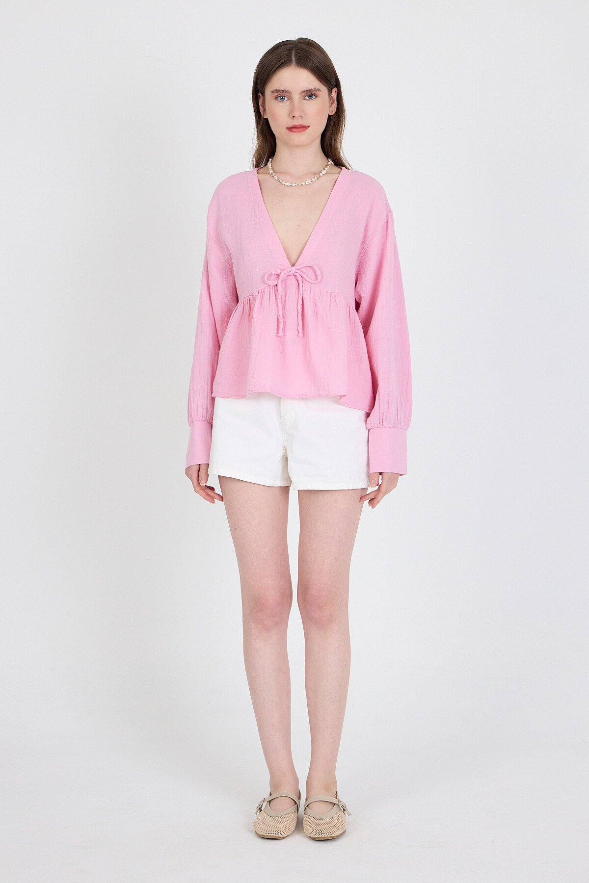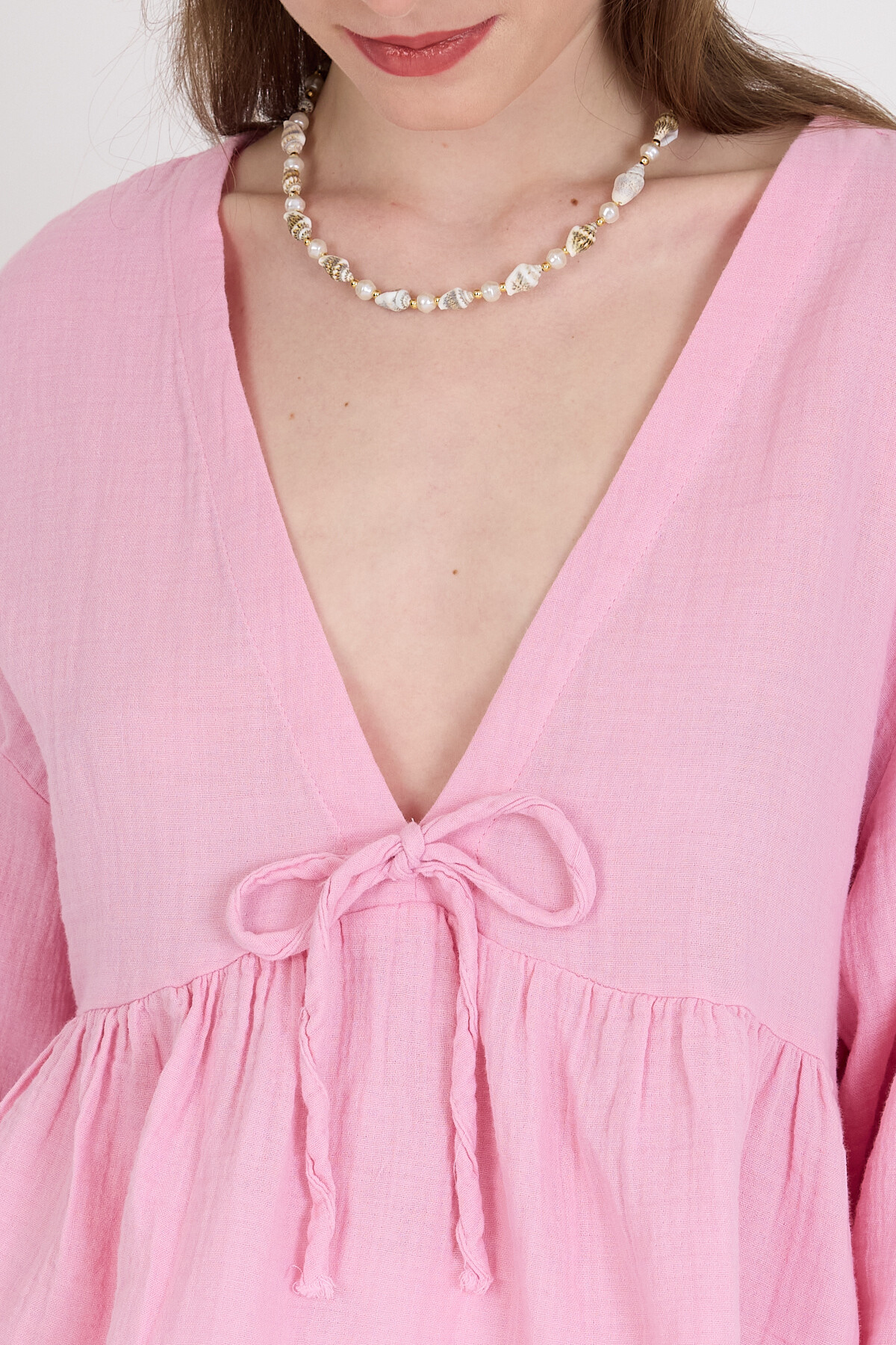 Pembe %100 Pamuk V Yaka Ön Bağlama Detaylı Bluz 4784A
