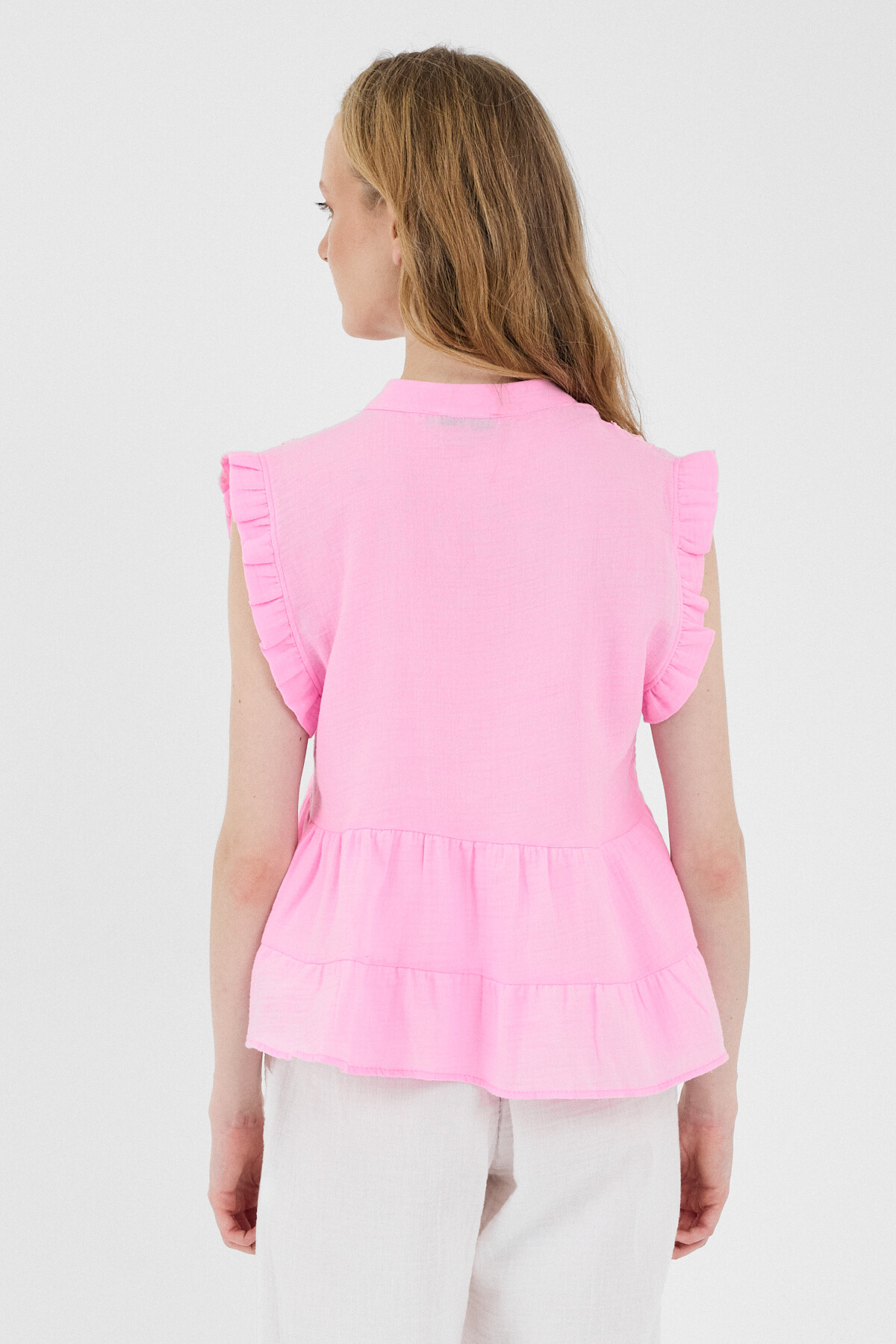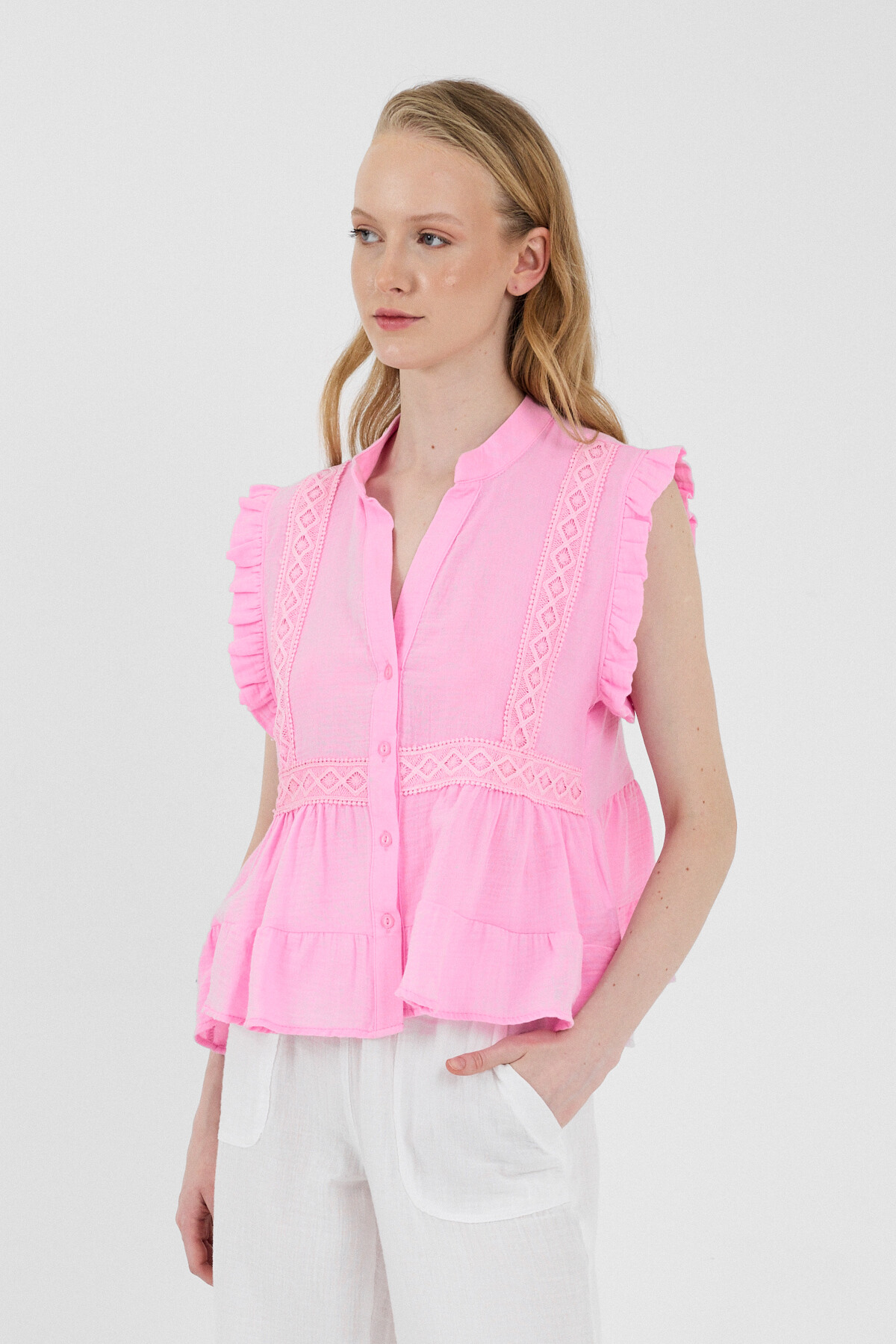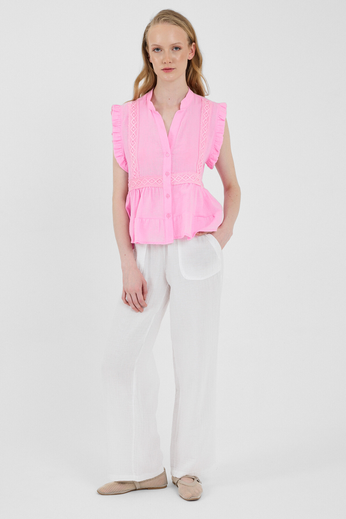 Pembe Fırfır Kollu Dantel Detaylı %100 Pamuk Müslin Bluz 8039A