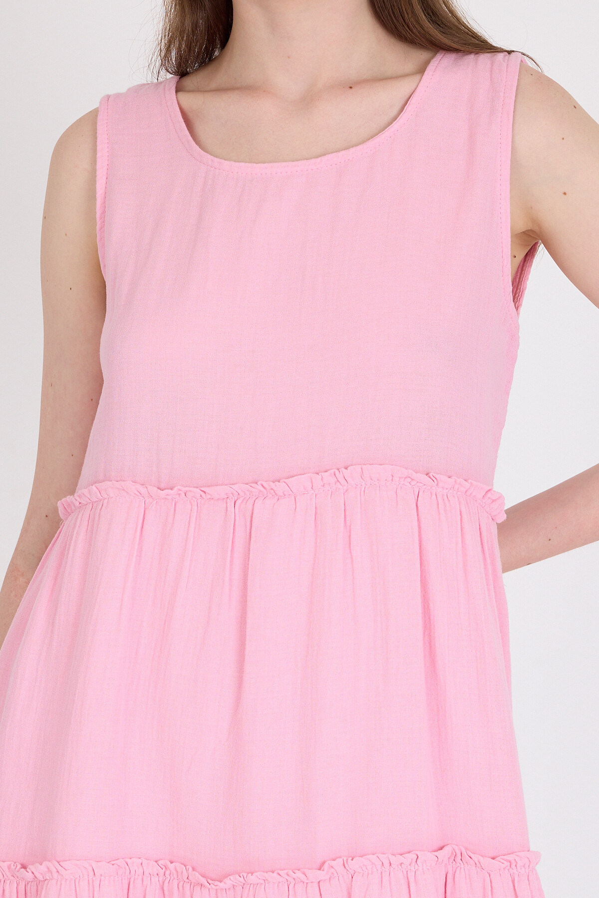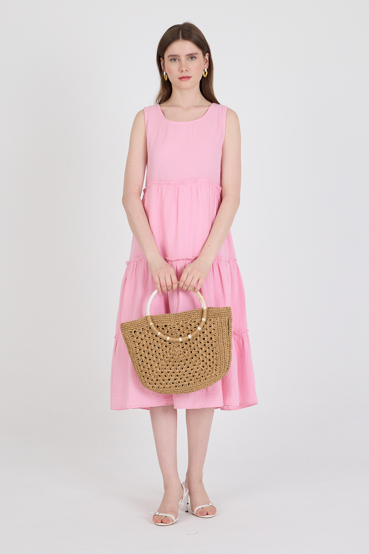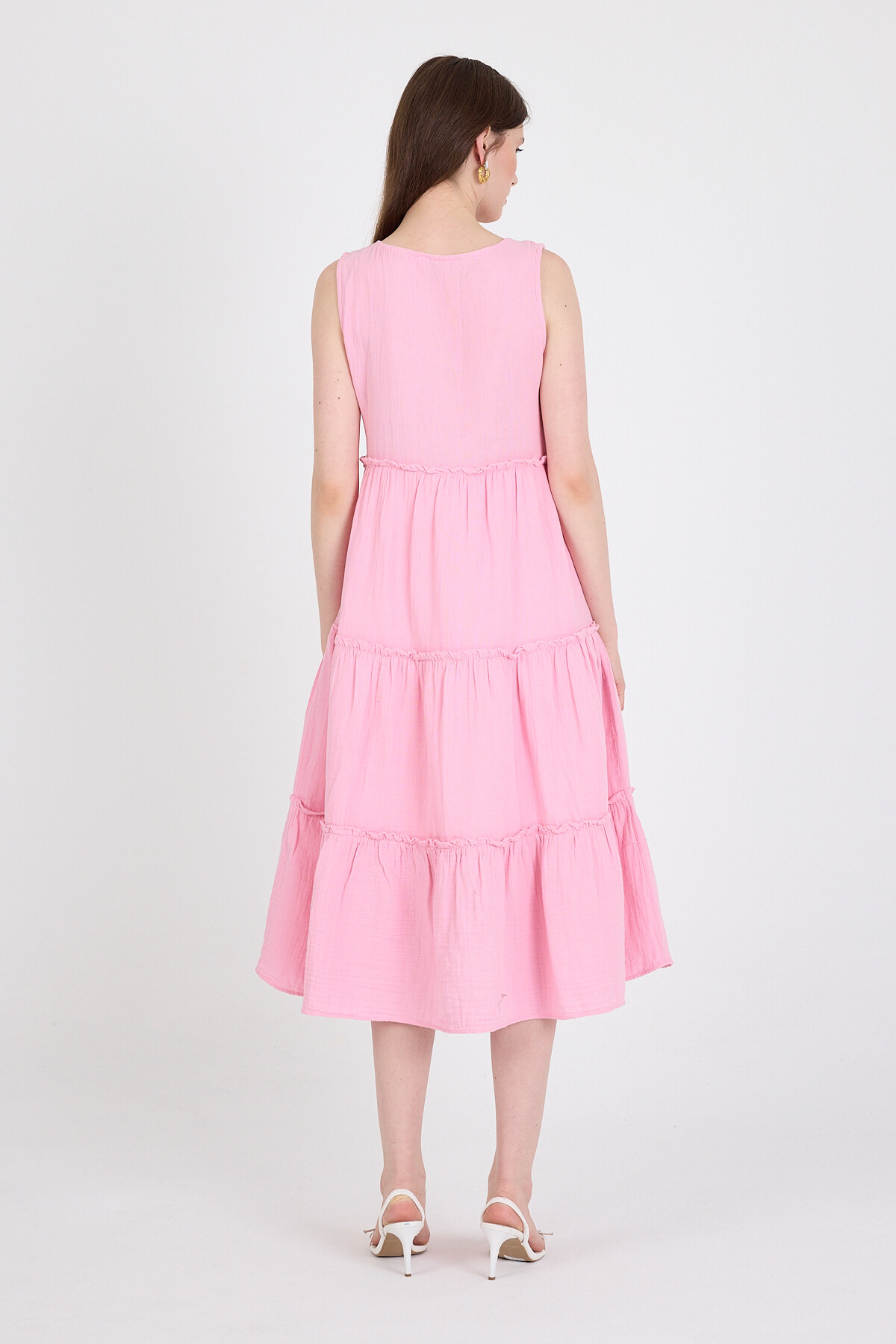 Pembe Keten Görünümlü %100 Pamuk Fırfır Detaylı Kolsuz Midi Elbise 4738A