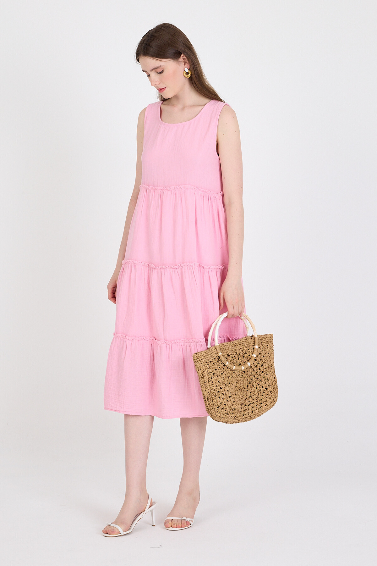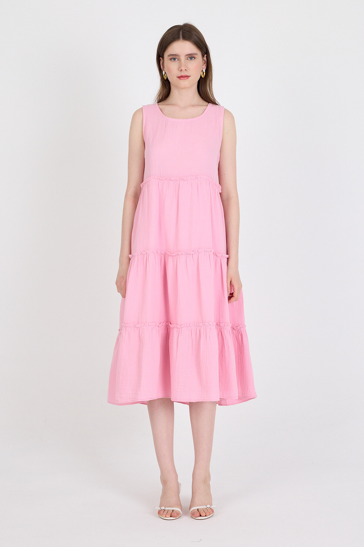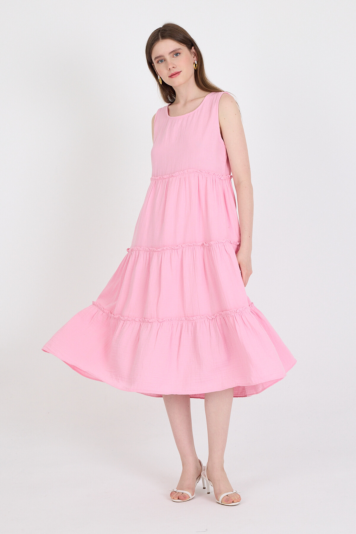 Pembe Keten Görünümlü %100 Pamuk Fırfır Detaylı Kolsuz Midi Elbise 4738A
