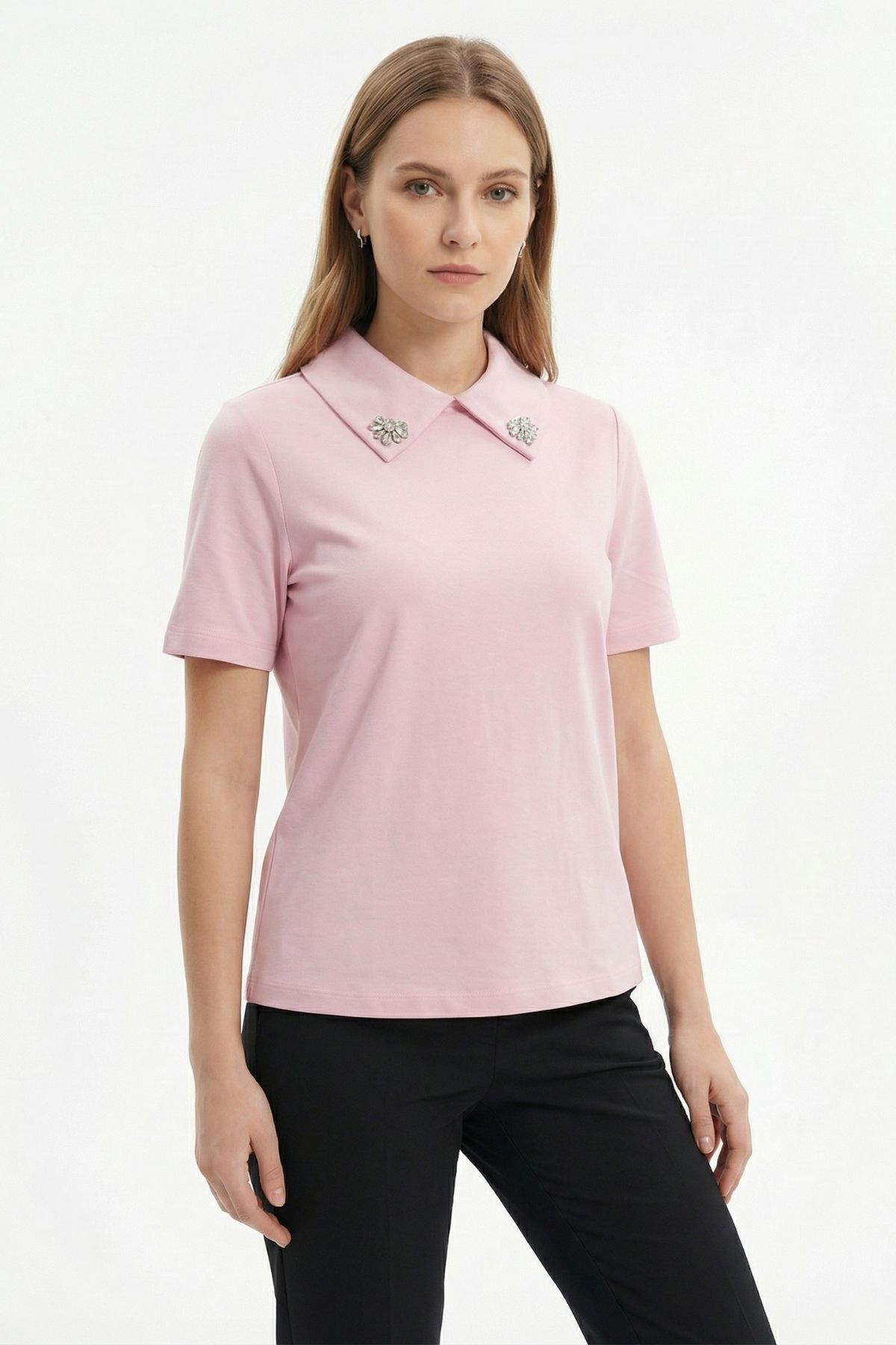 Pembe Yaka Taşlı Kısa Kollu Tişört 6294