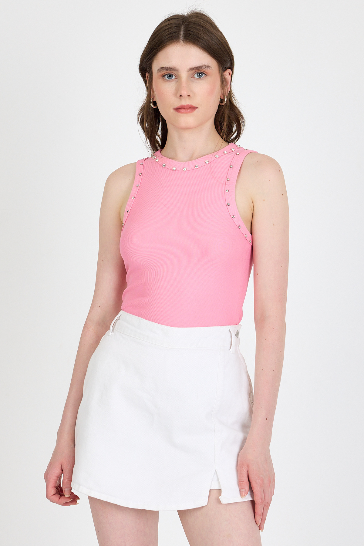 Pembe Yaka Ve Omuz Taş Detaylı Ribanalı Örme Atlet 1249