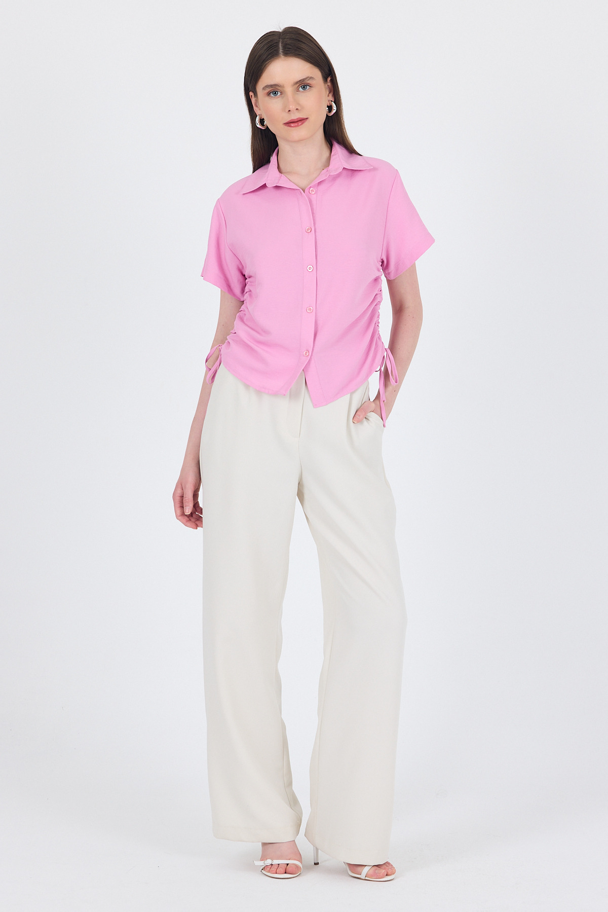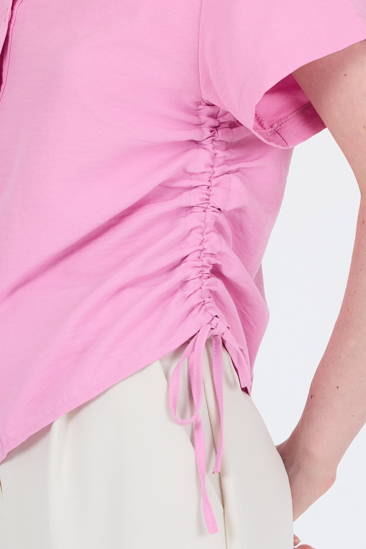 Pembe Yanları Büzgülü Bağcıklı Kısa Kollu Gömlek 4368A