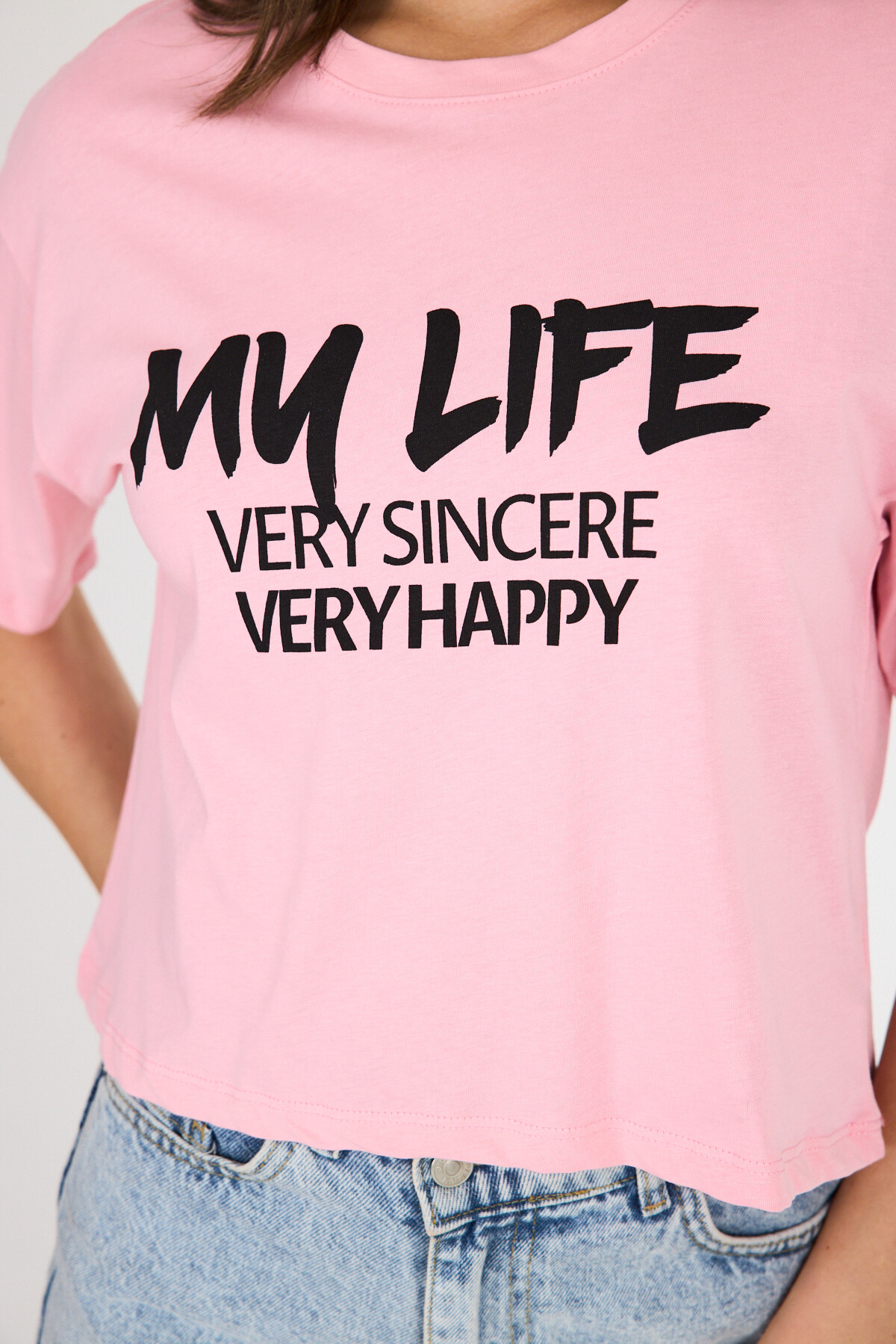 Pembe Yazı Baskılı %100 Pamuk Crop Tişört 9187M