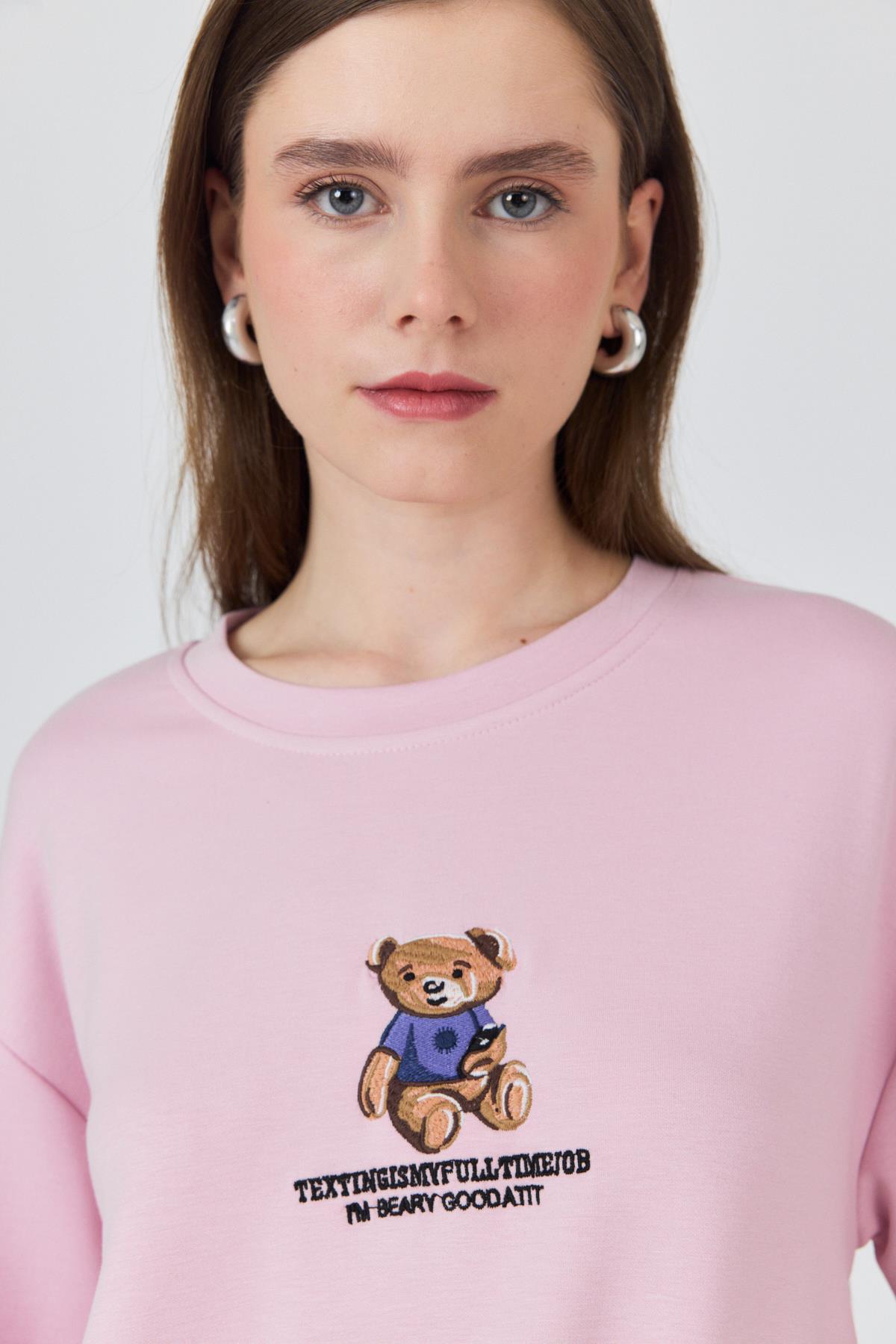 Pudra Ayıcık Baskılı Bisiklet Yaka Oversize Tişört 5530