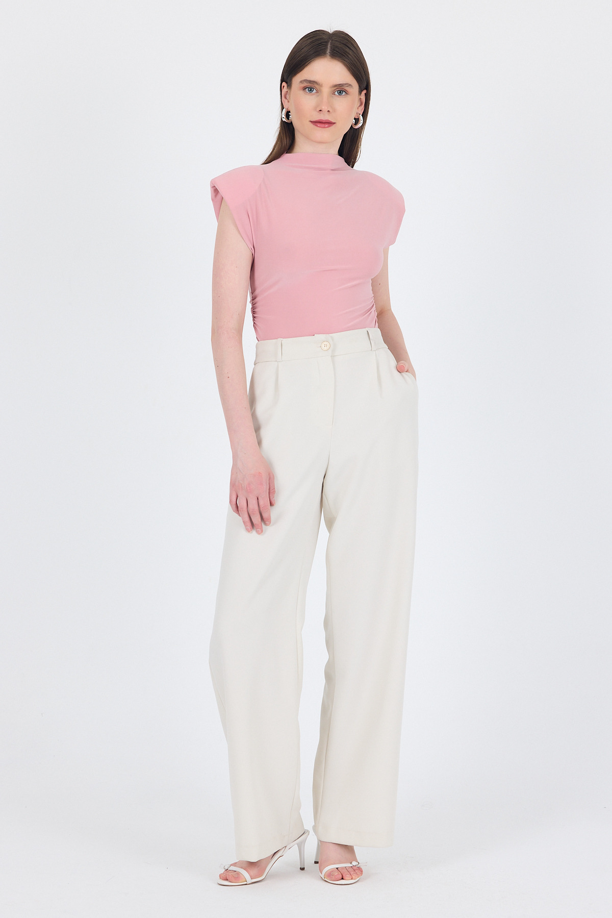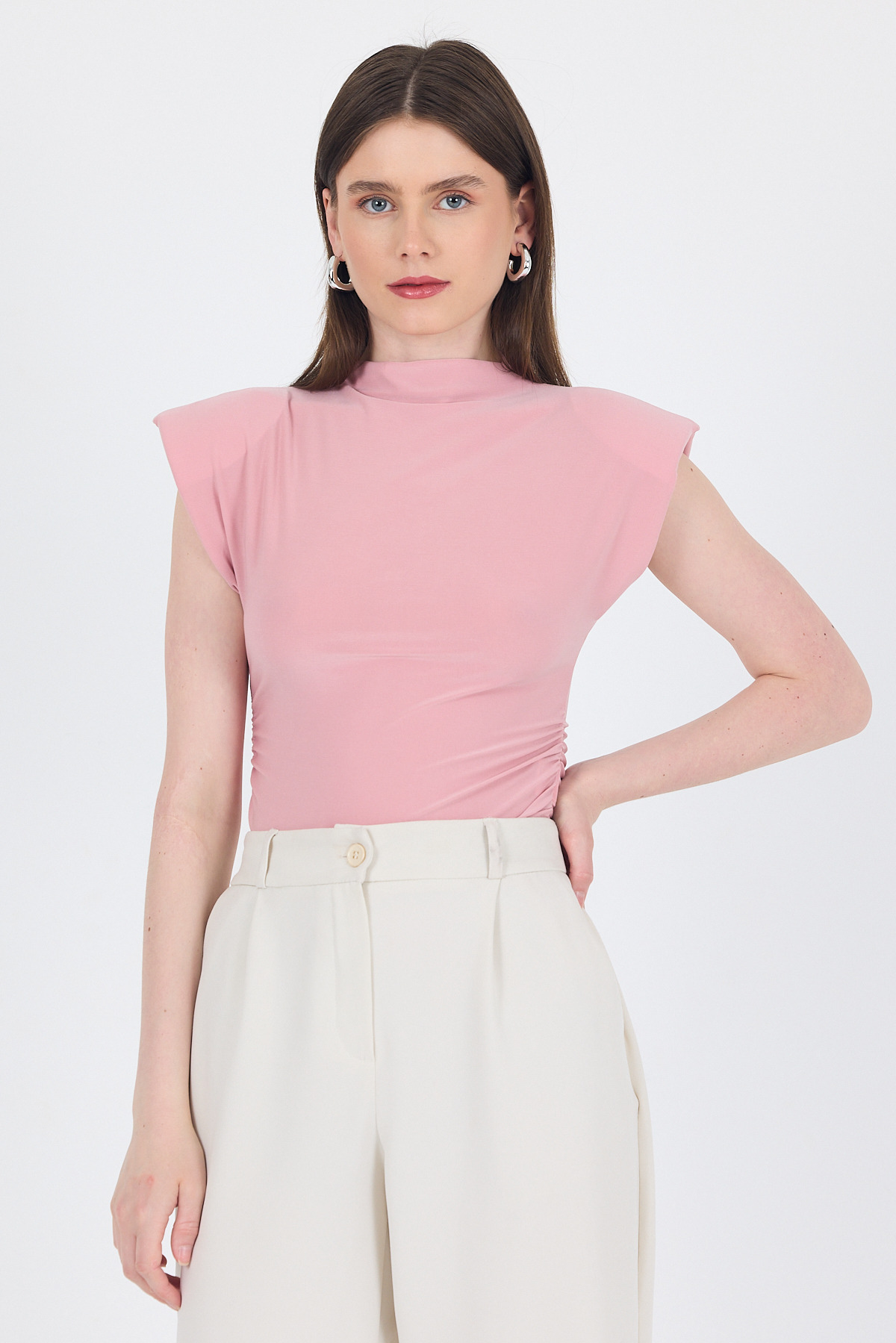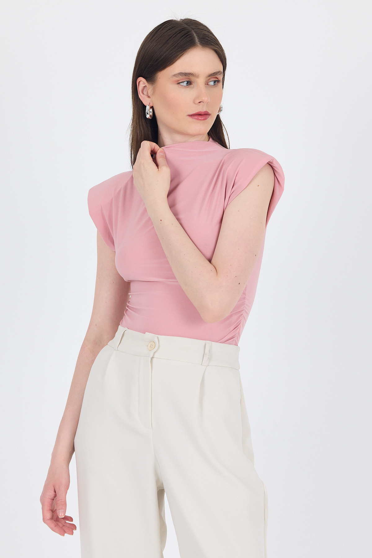 Pudra Vatkalı Dik Yaka Drapeli Bluz 13185