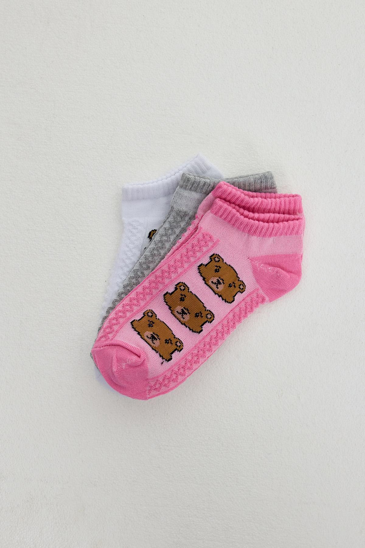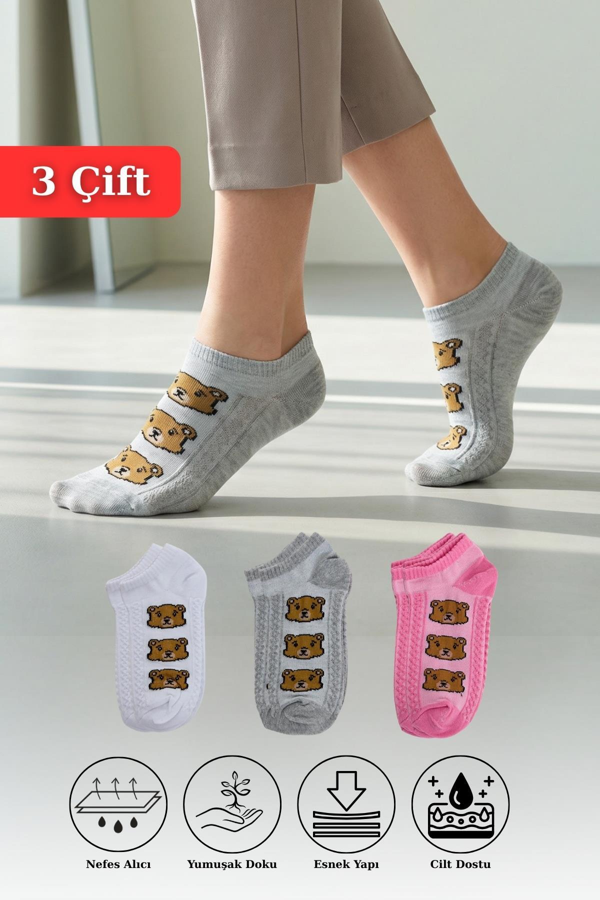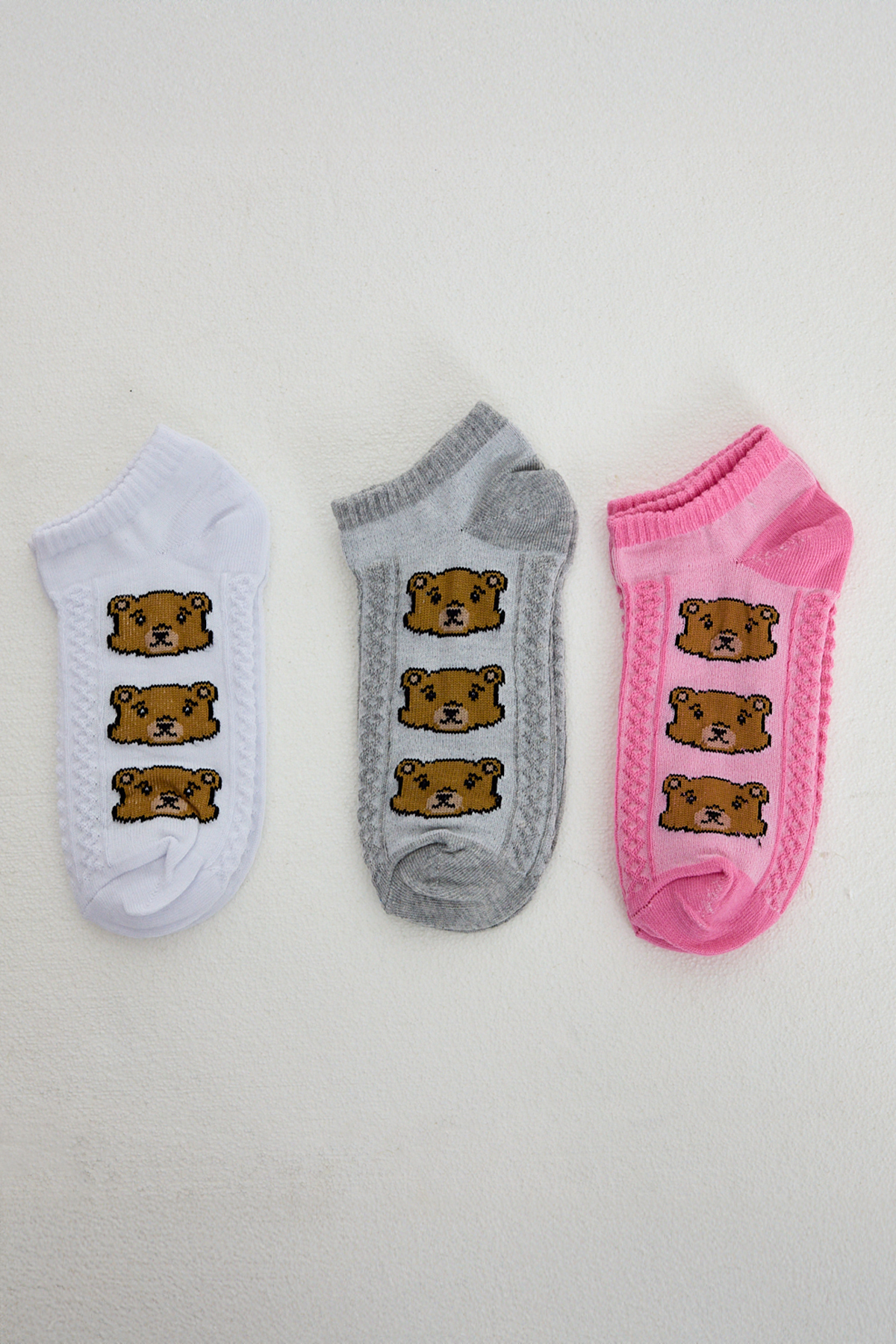Renkli Ayı Desenli 3'lü Örme Patik Çorap 1204