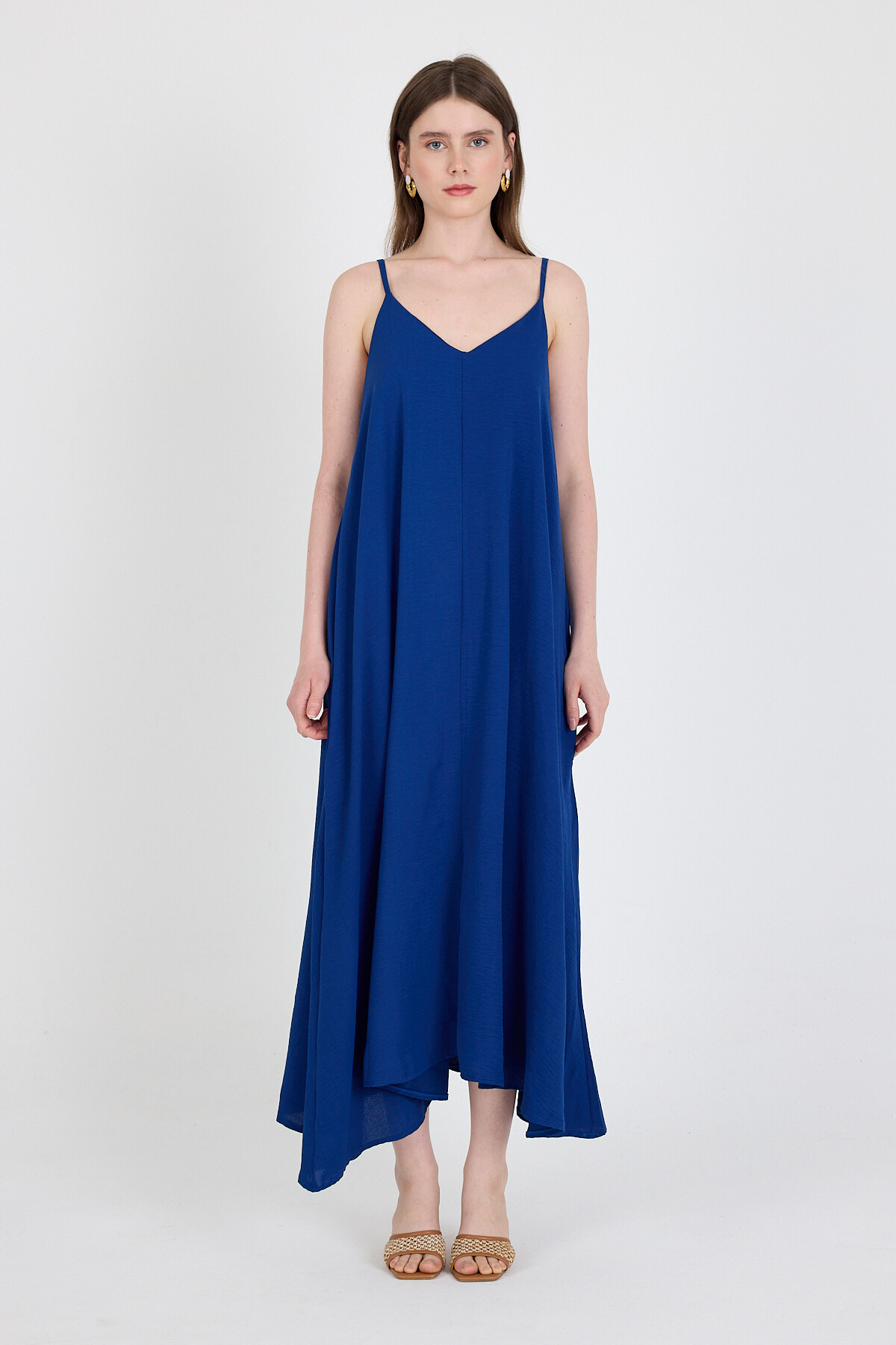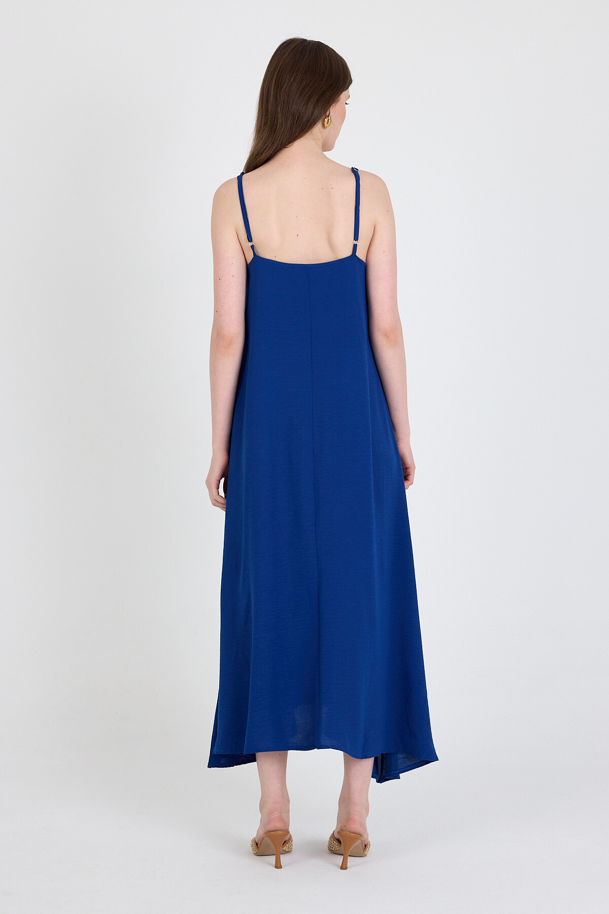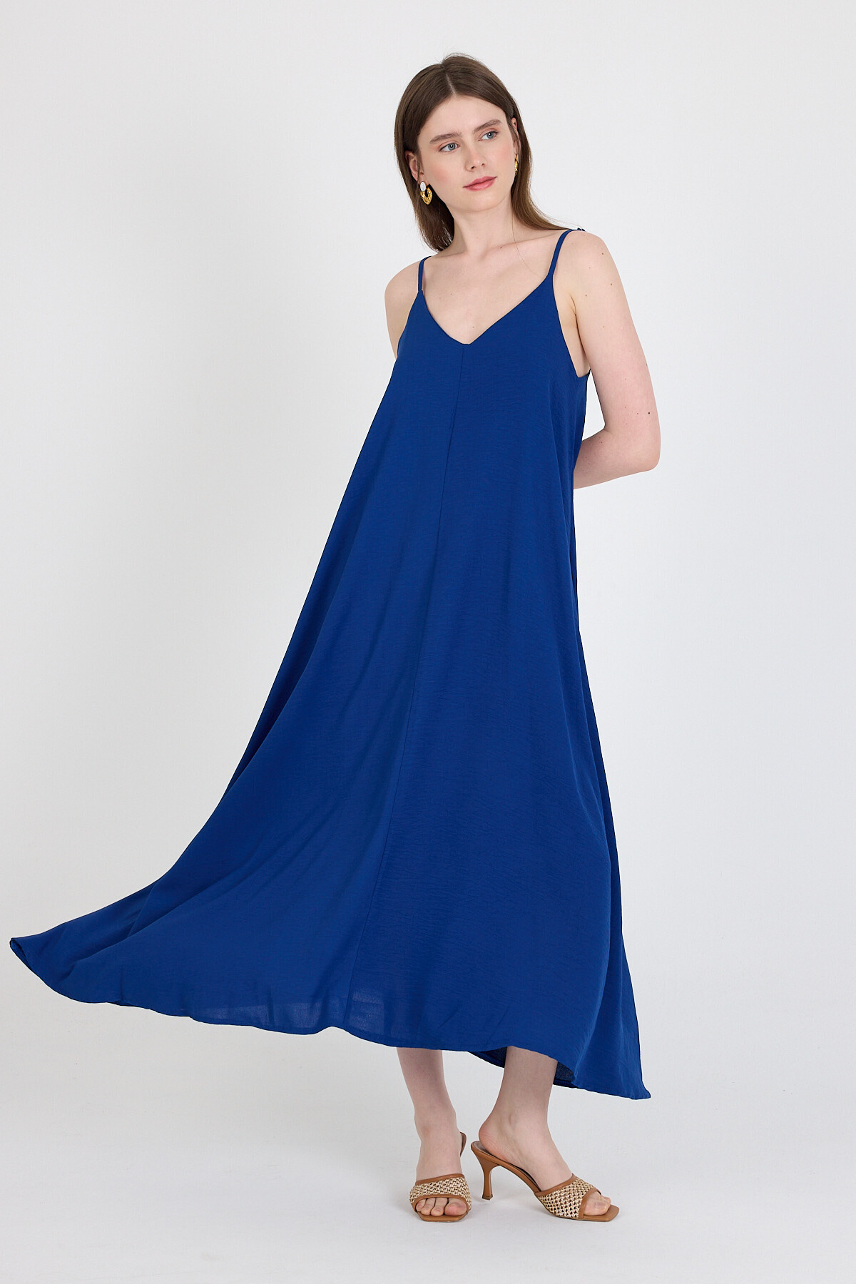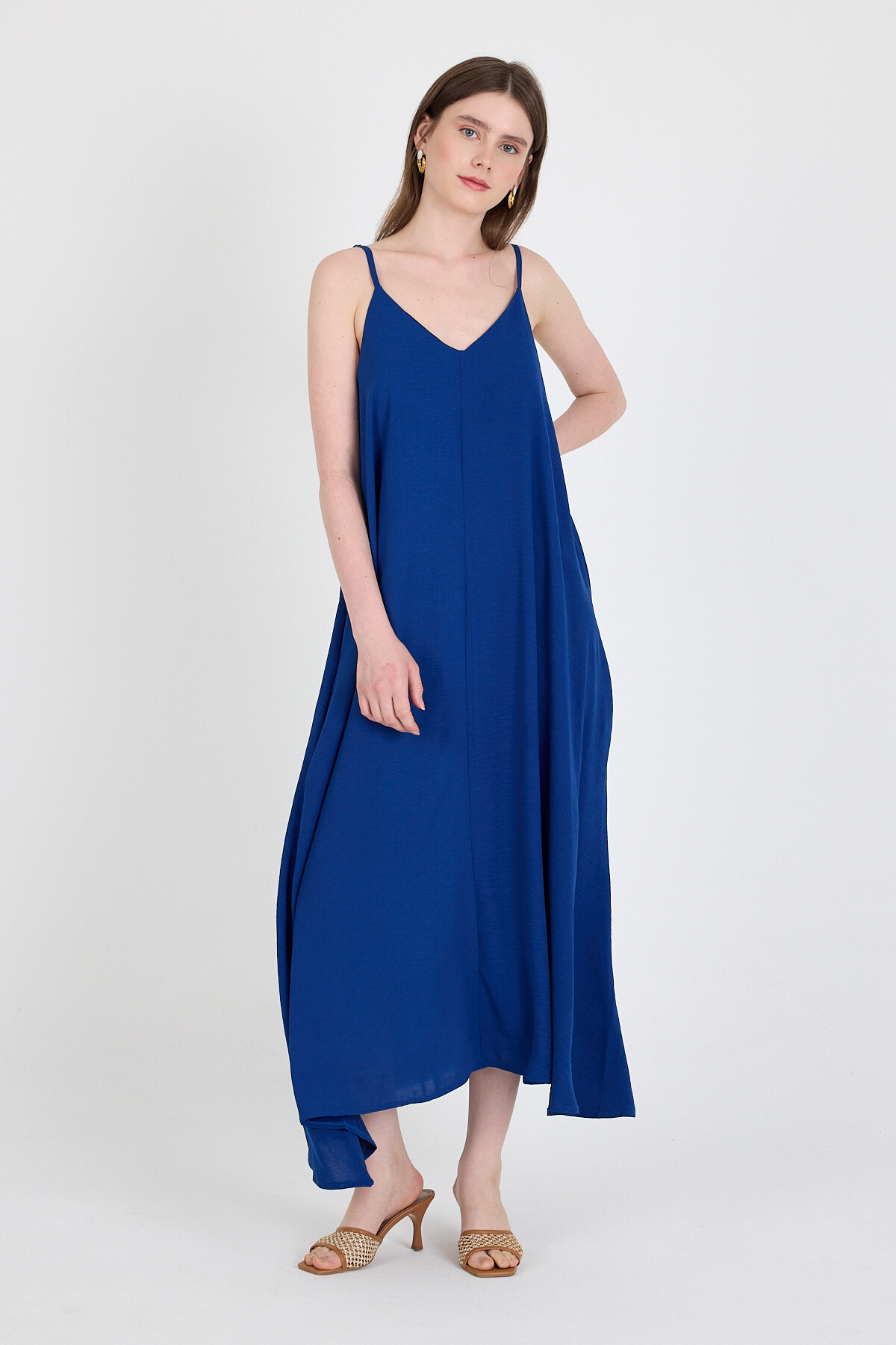 Saks Askılı V Yaka Bol Kesim Dokuma Elbise 20003