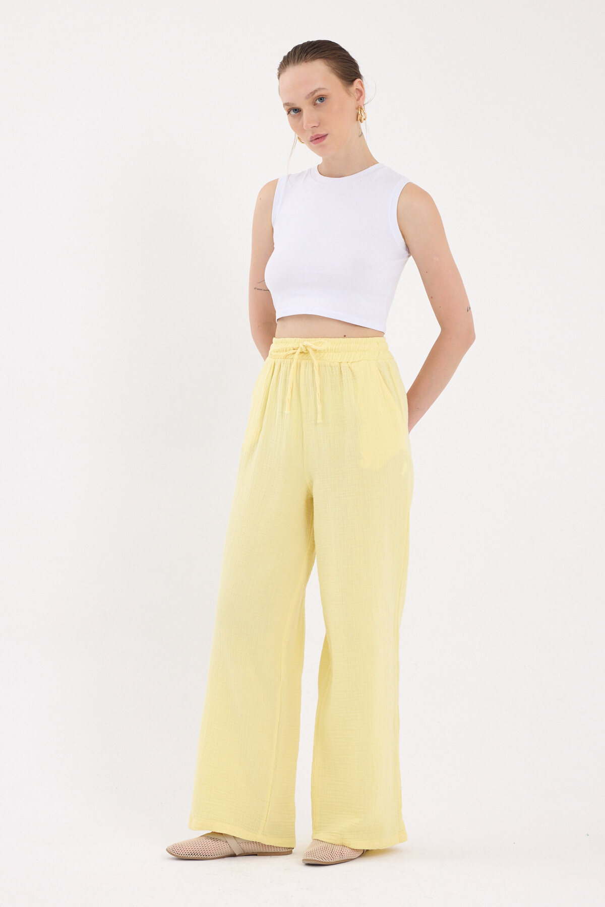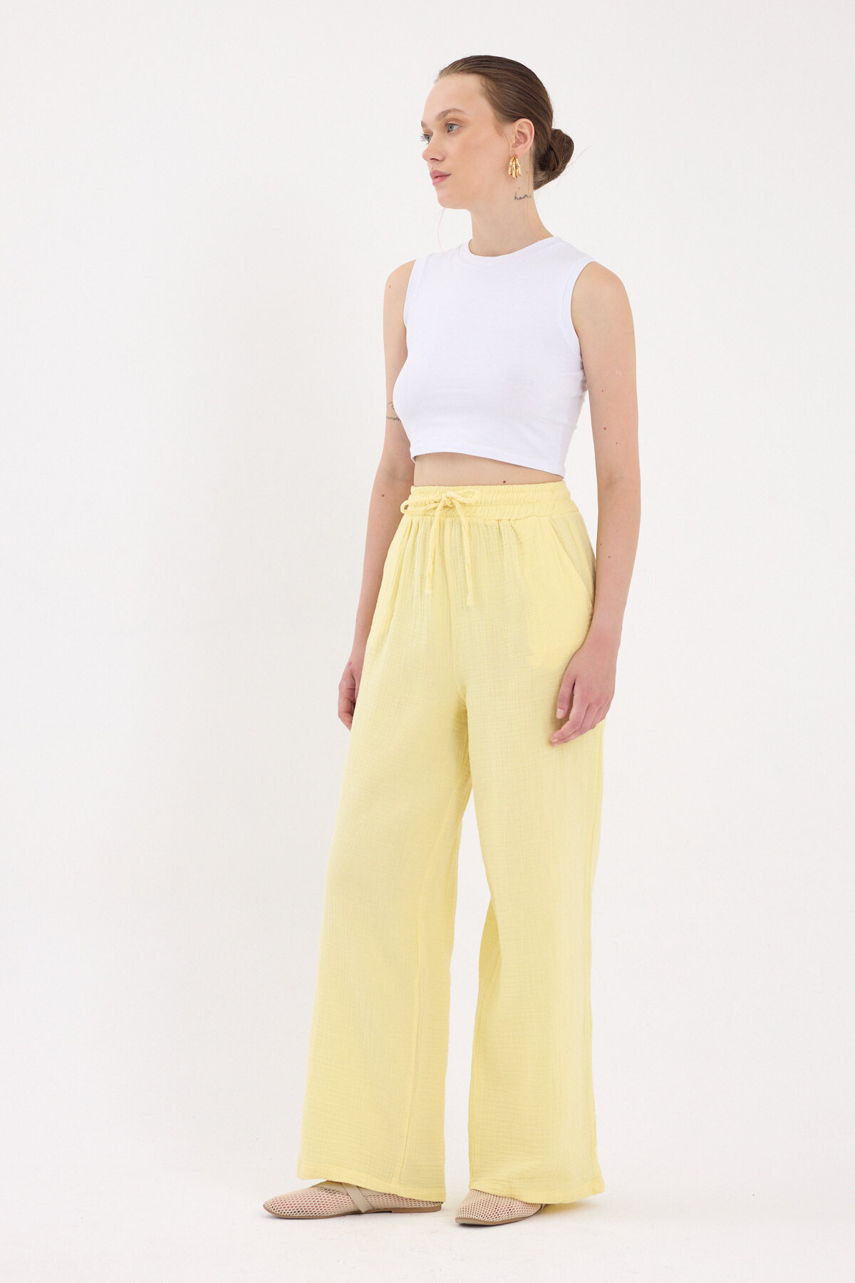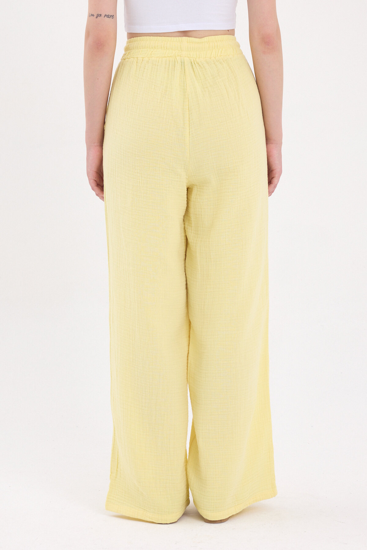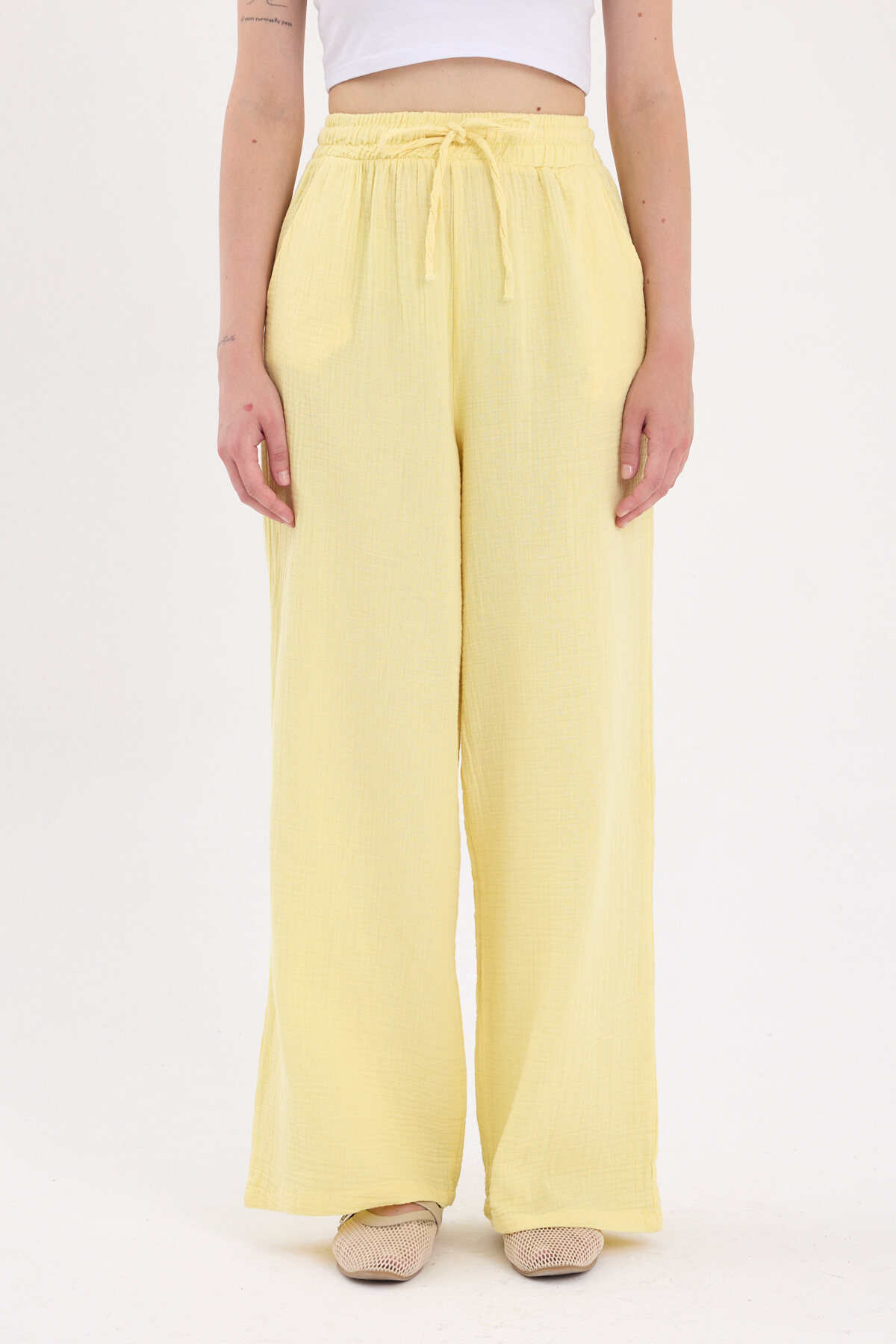 Sarı %100 Pamuk Müslin Palazzo/Bol Paça Pantolon 8056A