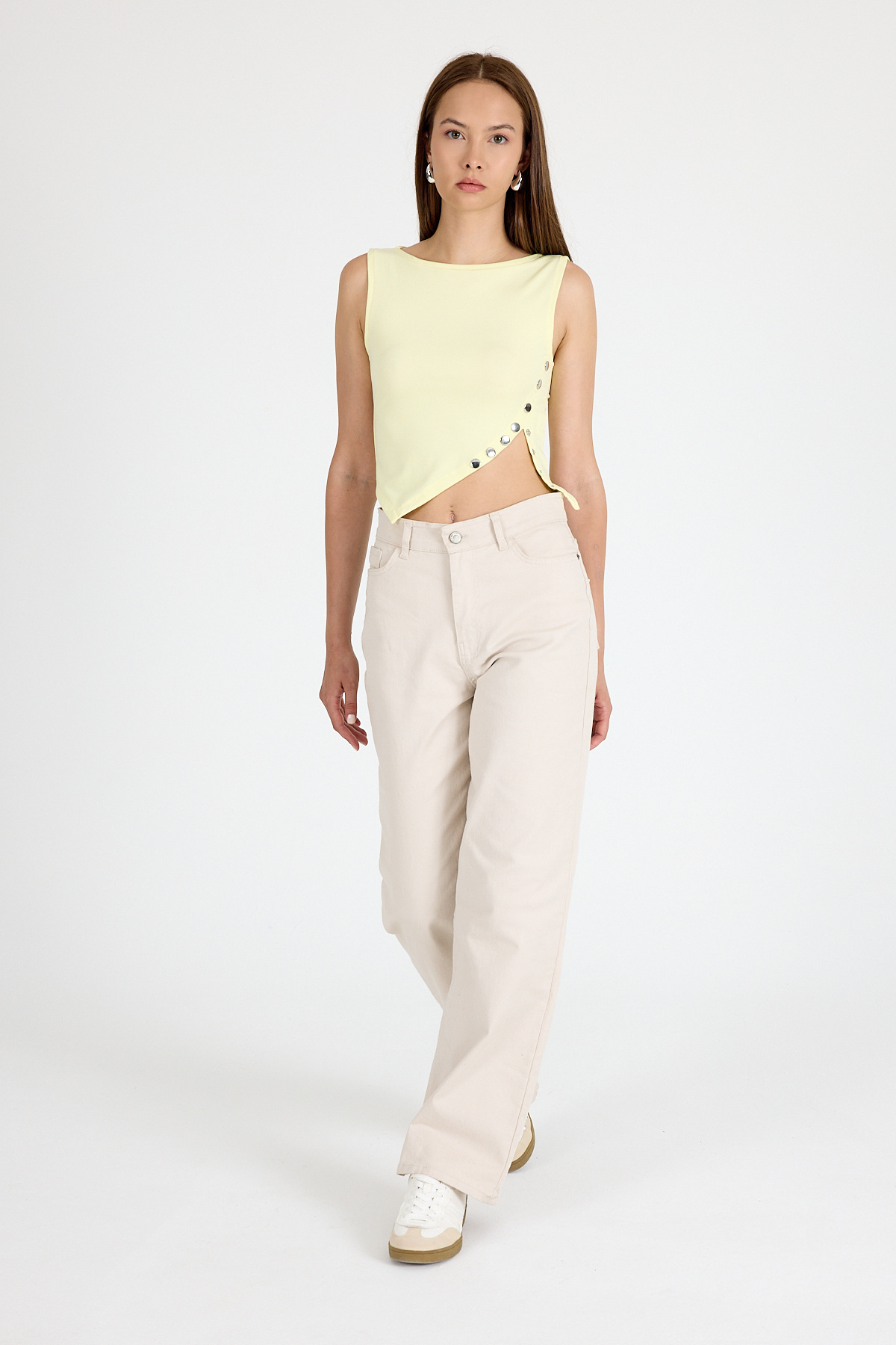 Sarı Çıt Detaylı Asimetrik Kesim Kolsuz Bluz 2494