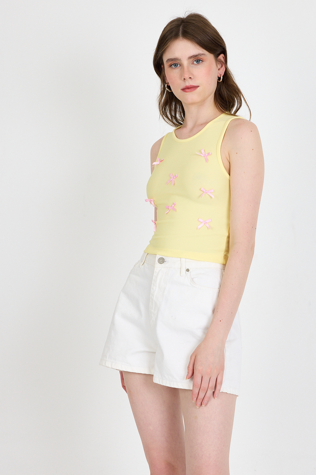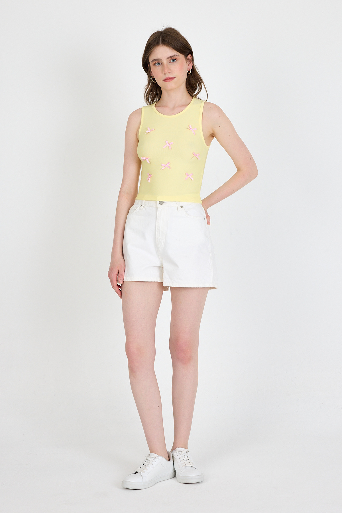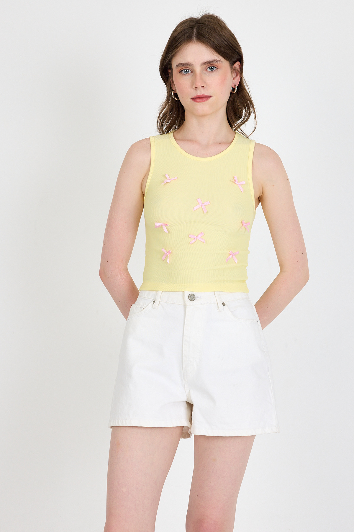 Sarı Fiyonk İşlemeli Crop Örme Atlet 0849