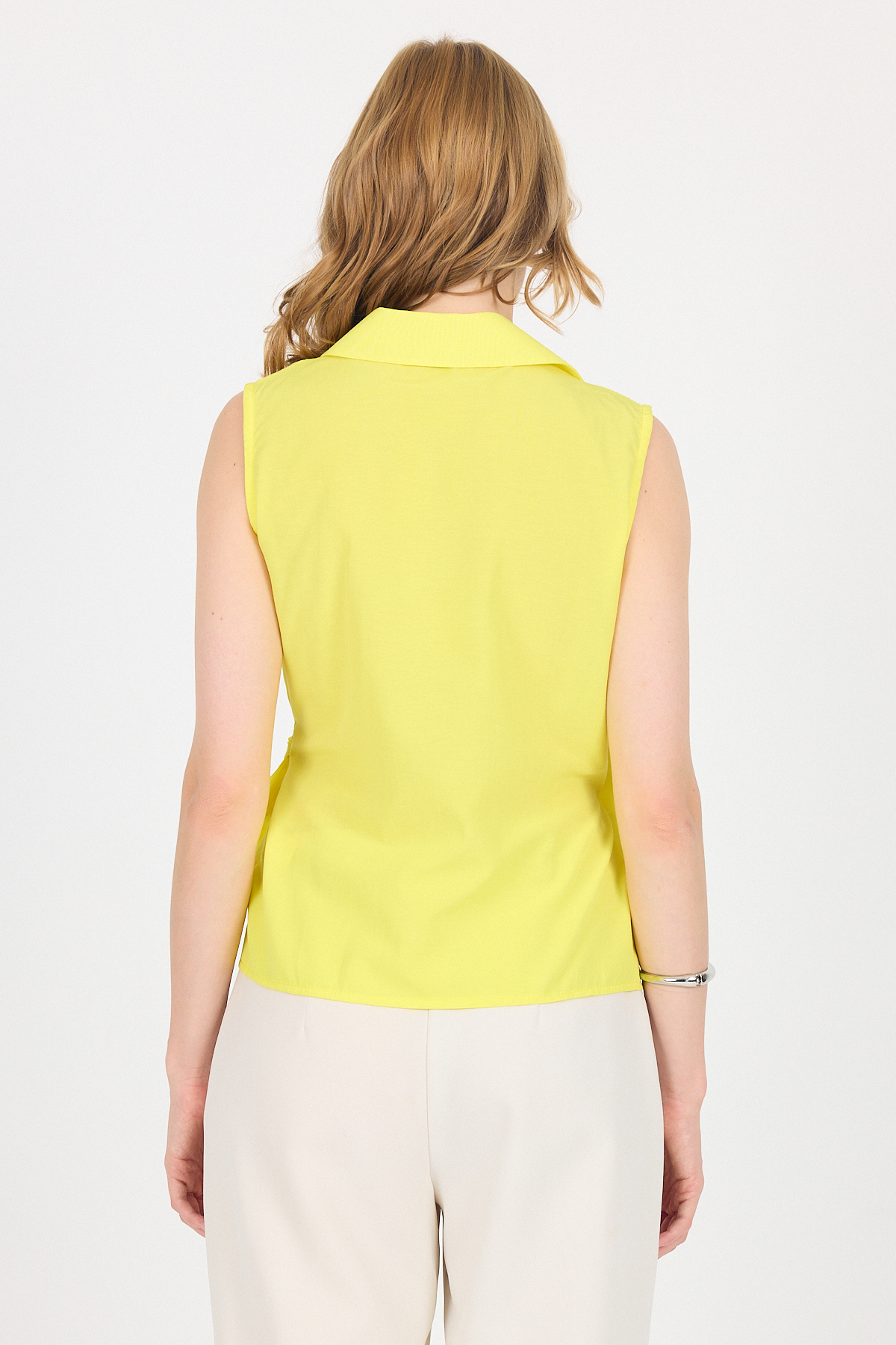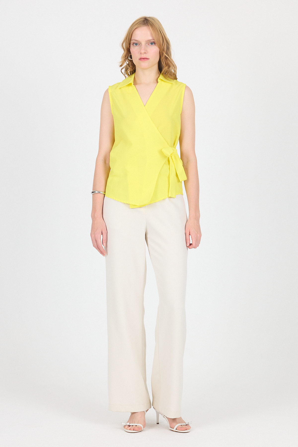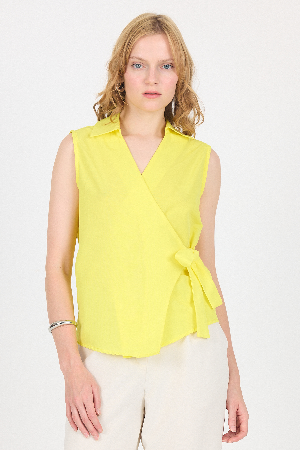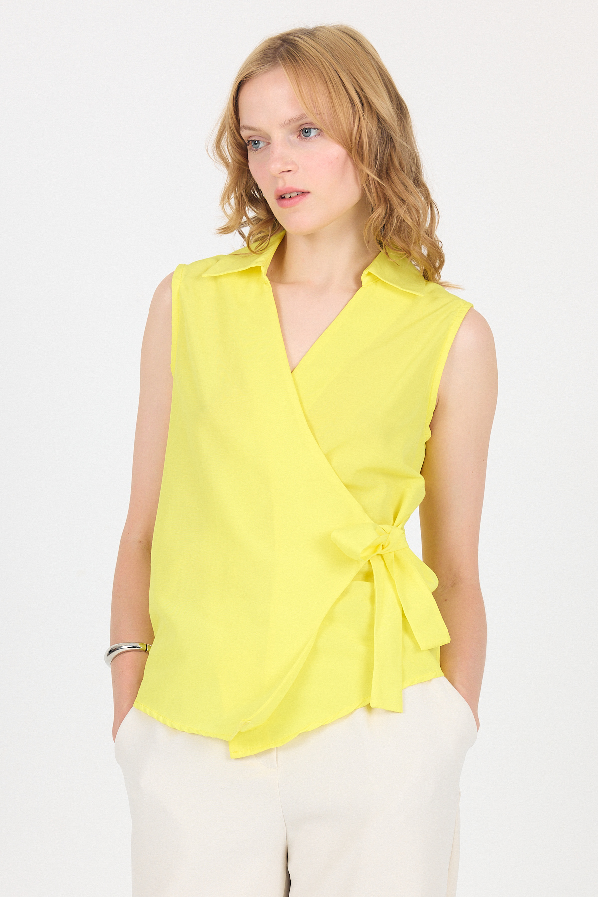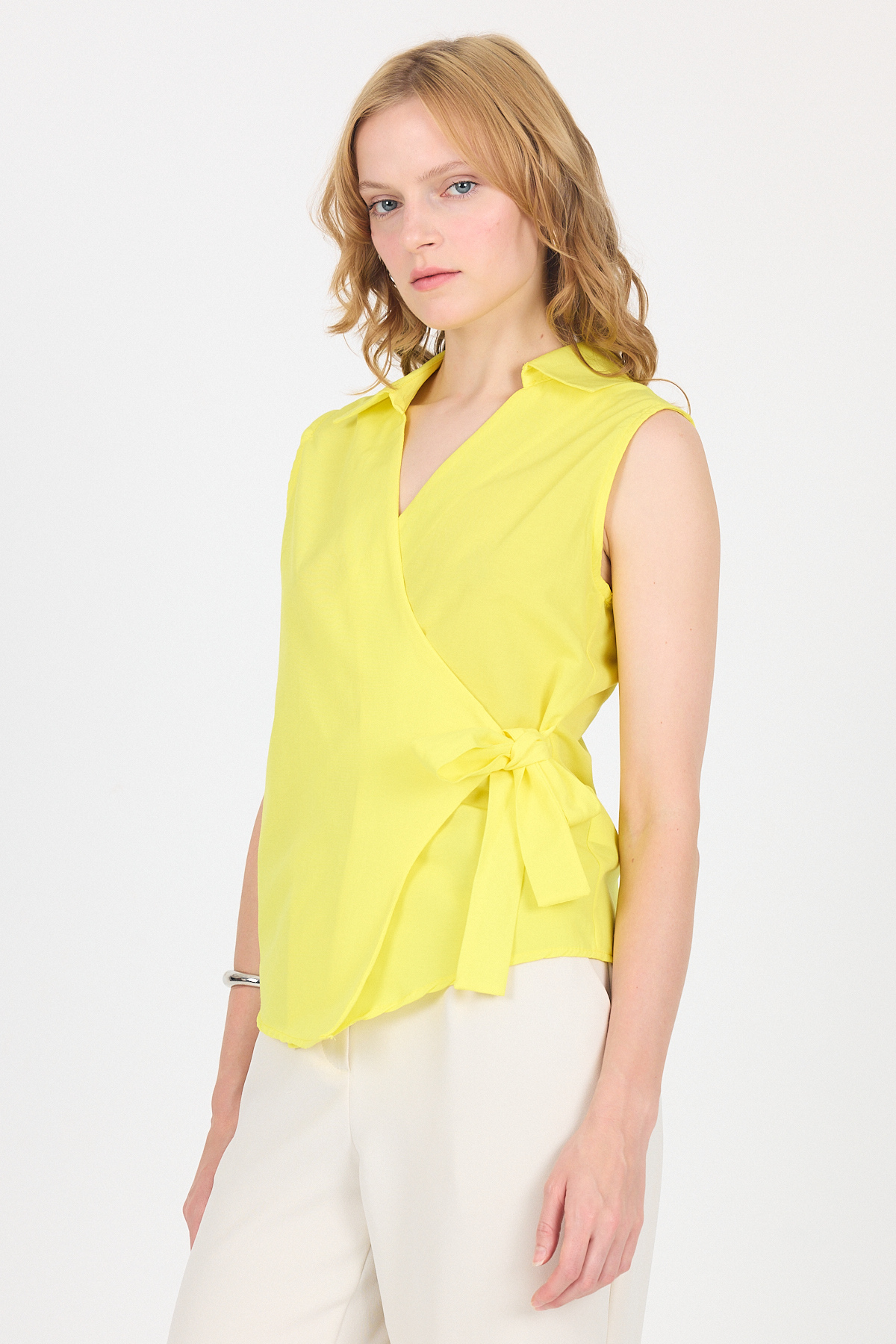 Sarı Yan Bağlama Detaylı Kolsuz Kruvaze Bluz 8047